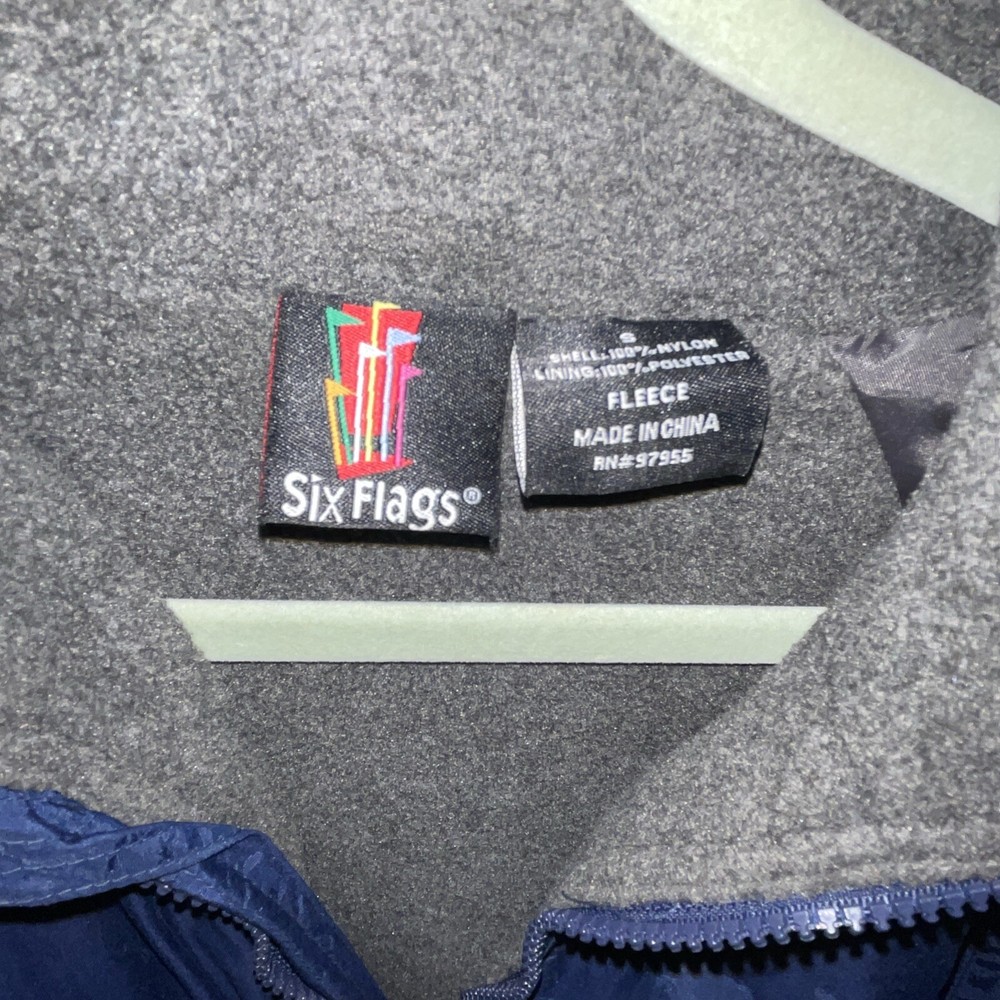 Stay warm and stylish with this Six Flags bomber jacket. Made of durable nylon material with a navy color. The jacket is fleece-lined with soft polyester material for added warmth and comfort. It features a regular size fit, a small size type. This jacket is perfect for any occasion and is a must-have for any Six Flags enthusiast. Get yours today
