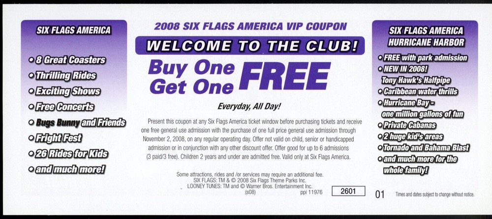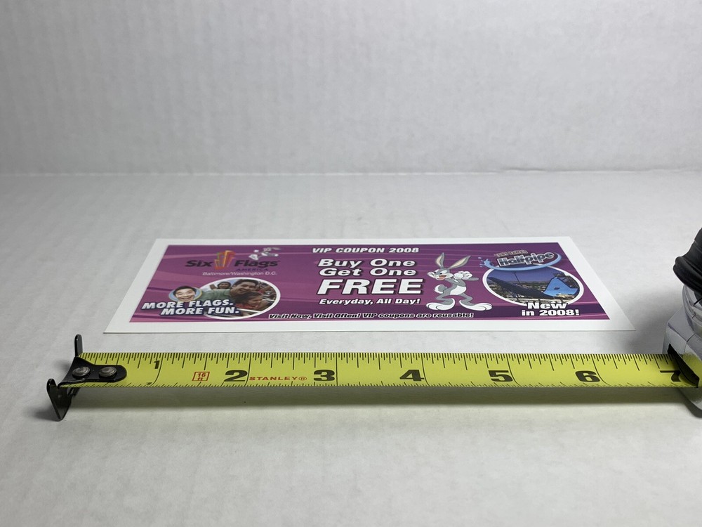 Six Flags VIP 2008 Coupon (Expired) Baltimore, DC w/ Bugs Bunny & Tony Hawk. Condition is Used. Shipped with eBay Standard Envelope for Eligible Items up to $20.