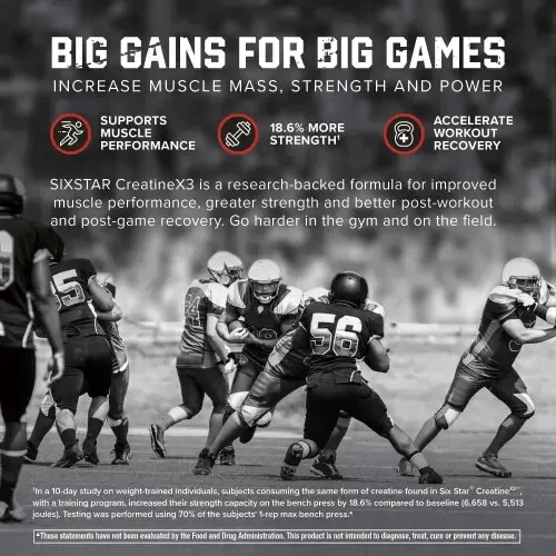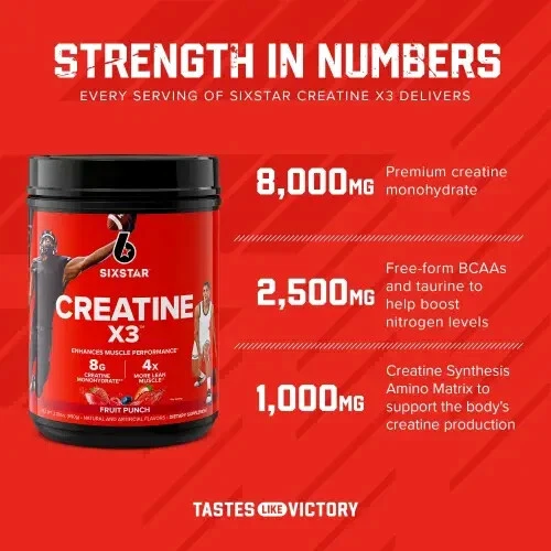 Product details Six Star Pro Nutrition Creatine X3 Fruit Punch Powder is formulated to delivery 8g of muscle building creatine, along with 2.5g of BCAAs and taurine to help boost nitrogen levels. The fuel you need to. Build muscle and strength, and it’s engineered for all athletes. Every scoop delivers 8g of premium creatine monohydrate and creatine HCl. In a 12-week study, those who consumed the creatine in Creatine X3 and taking part in the training program gained over 4X more lean muscle compared to placebo. When used continuously, Creatine X3 saturates your muscles, improving your between-set recovery and enabling you to train harder, for longer periods of time. Every serving delivers an impressive 8,000mg dose of a premium creatine blend, featuring creatine monohydrate and creatine HCl 2,500mg of free-form BCAAs and taurine in every scoop to help boost nitrogen levels Coupled with a training program, increased their strength capacity by 18.6% compared to baseline (6,658 vs. 5,613 joules) in 10 days Testers taking part in the training program gained over 4 times more lean muscle, compared to participants who were taking a placebo Engineered for active men & women, strength trainers, all athletes, fitness enthusiasts, body builders, endurance athletes and great for preworkout