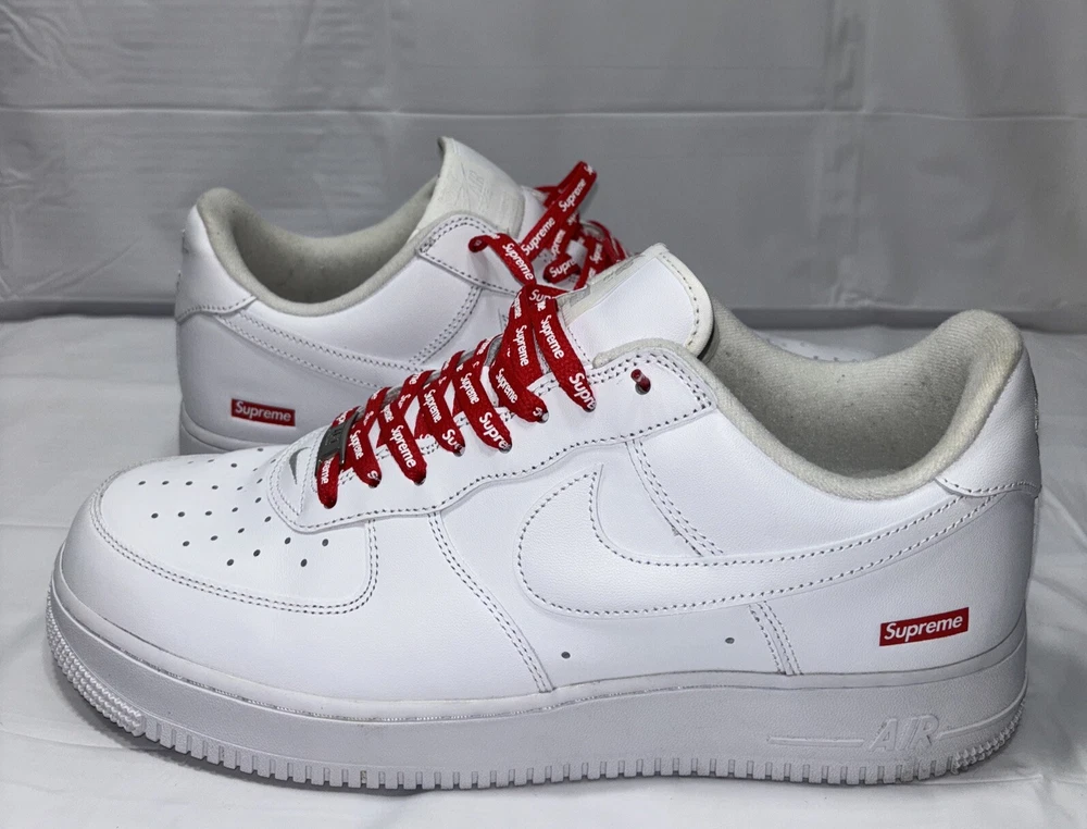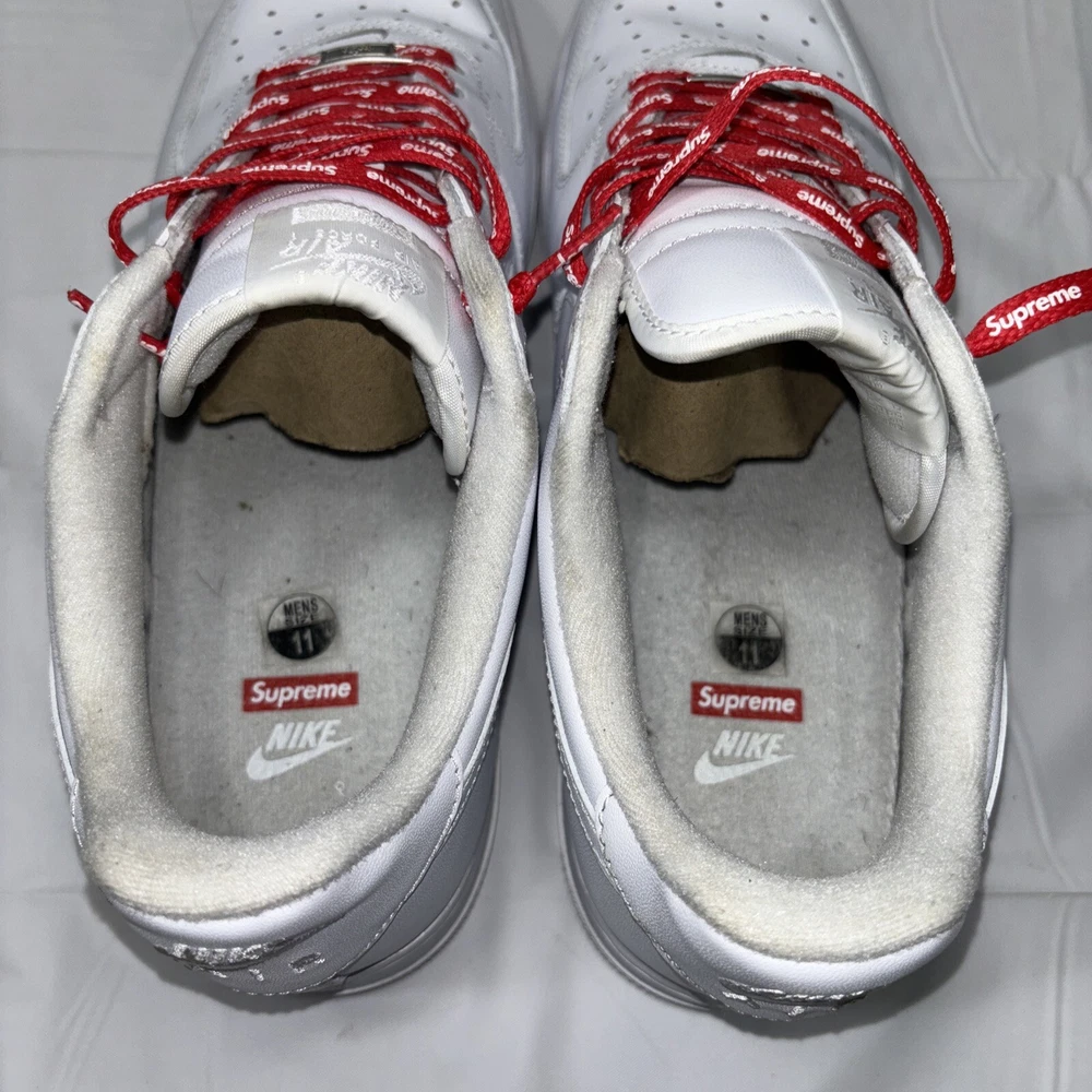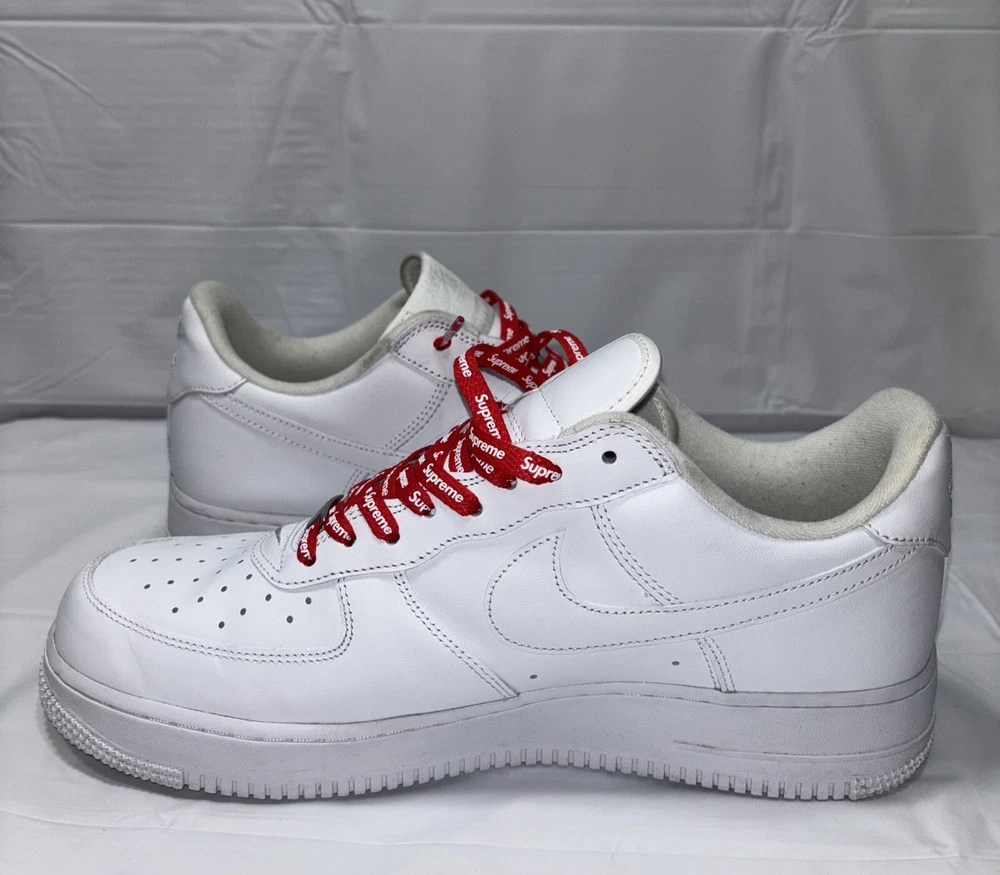 The manufacturer color is white, and the style code is CU9225-100. These shoes are part of the Nike Air Force product line, and they were released in 2020. Perfect for any athletic occasion, these sneakers are sure to turn heads. The box is the original one with the Supreme logo. They are very comfortable to use for everyday life. As used still in good condition, needs a little fresh up to bright again even more 😊 Please before purchasing feel free to reach out to us for any questions or to post more pictures.