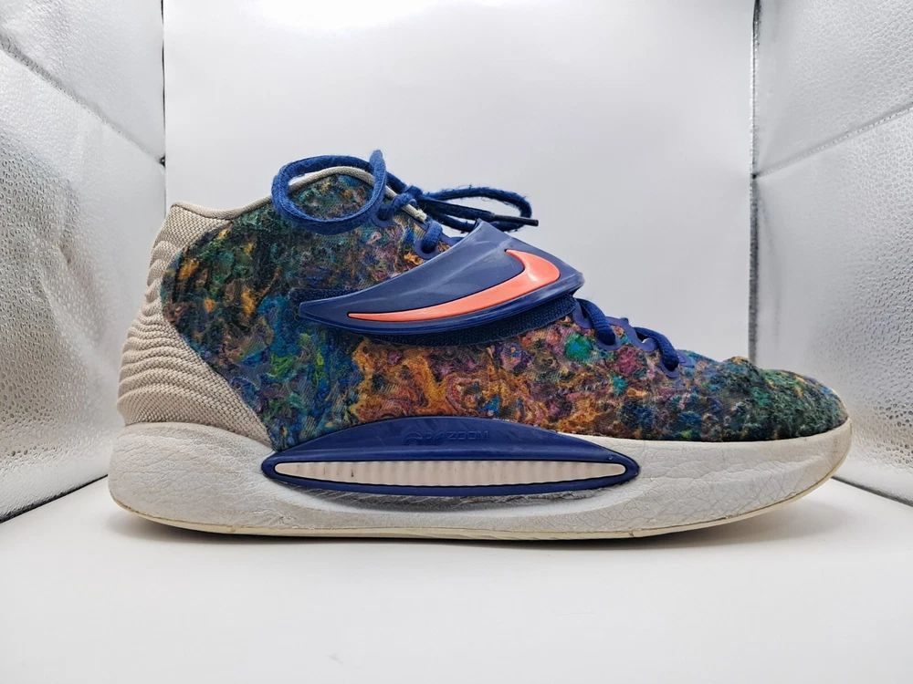 Condition: Pre Owned Size: 11 Flaws: No Insole & Heel Drag Elevate your game with the Nike KD 14 Psychedelic Kevin Durant Basketball Shoe. This limited edition sneaker boasts a colorful, solid pattern and a low top shoe shaft style. The shoe features lace-up closure, adjustable fit, breathable material, and a cushioned insole for ultimate comfort. Perfect for any occasion, whether it's activewear, casual wear, or workwear, these shoes are ideal for men who want to showcase their athletic side. With a rubber outsole and foam insole, these shoes provide excellent traction and support. The Nike KD 14 is part of the Nike KD product line and is designed to be a high-performance shoe for gym and training, track and field, weightlifting, boxing, cross training, crossfit, basketball, bodybuilding, running, and jogging.