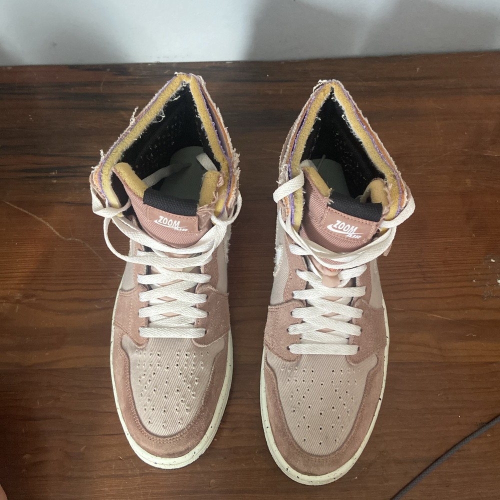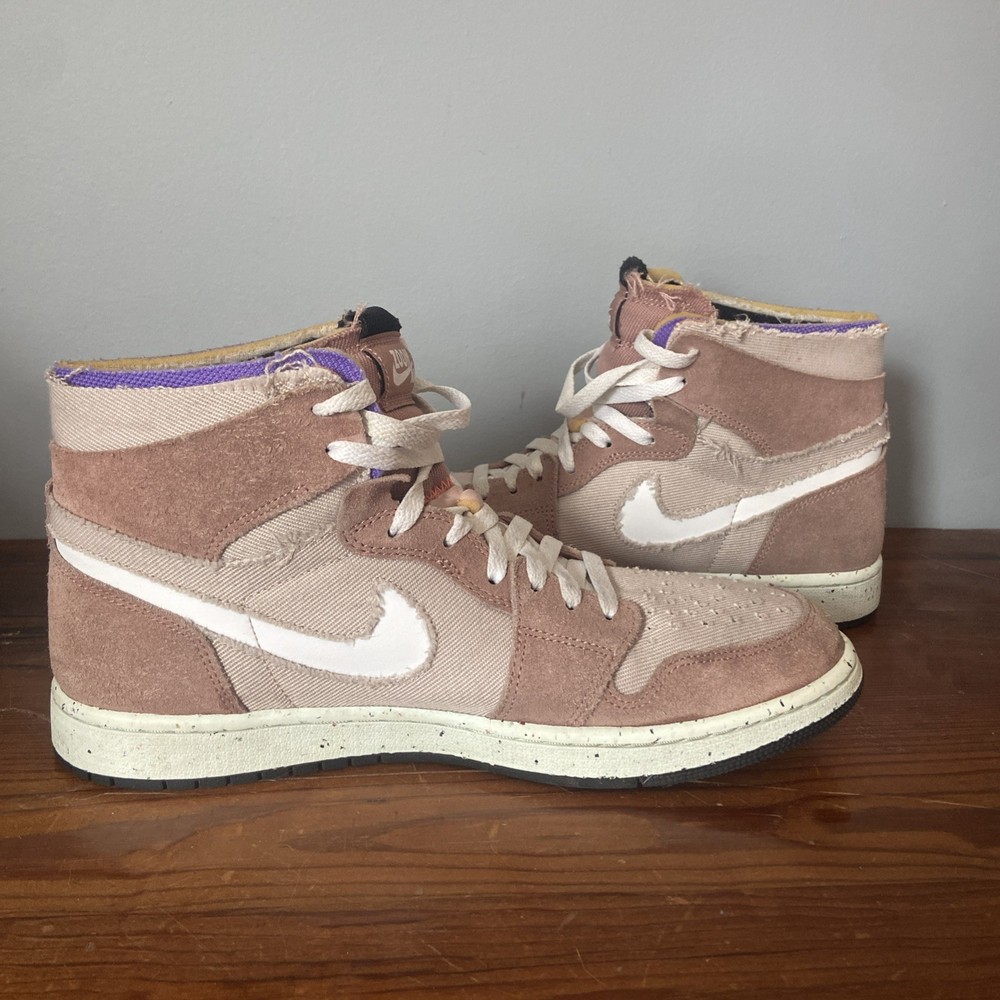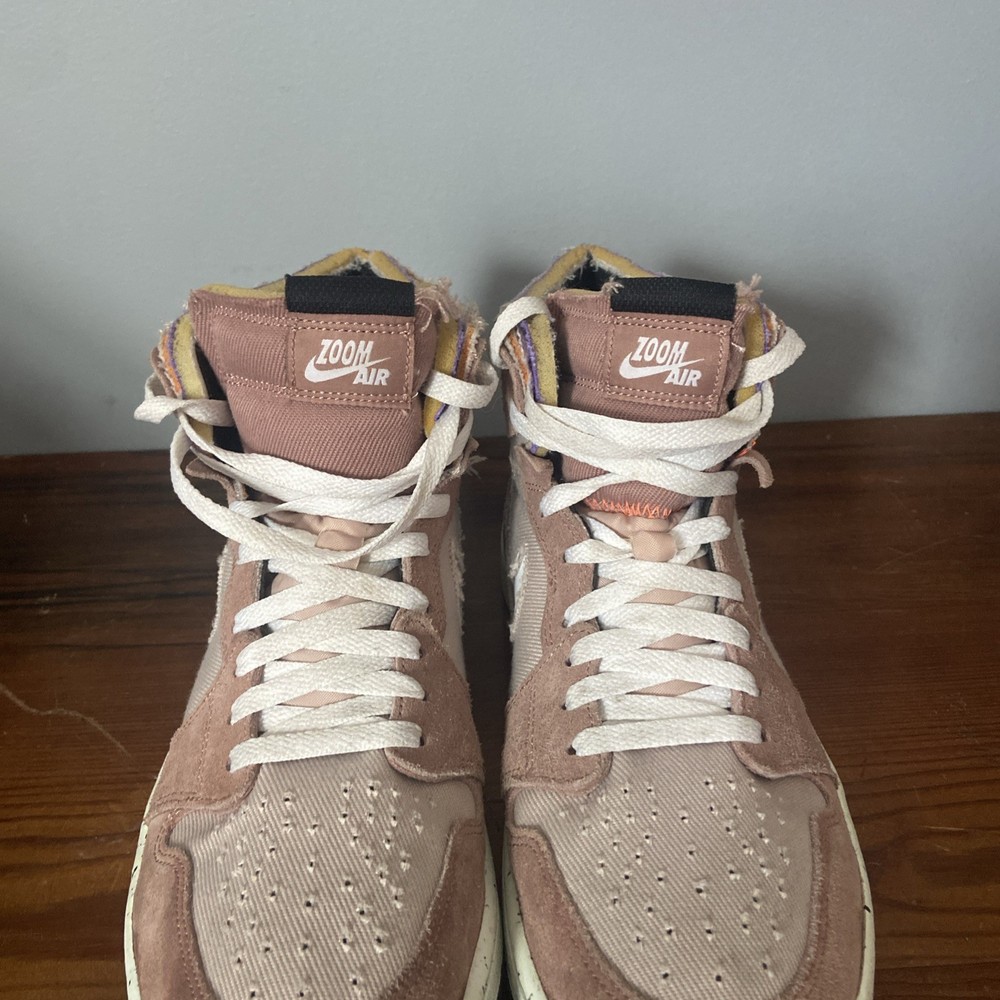 Air Jordan 1 Zoom Comfort High sneakers in the color Fossil Stone, featuring a high top style with a suede upper material. The shoes are part of the Air Jordan product line and have a style code of CT0978-201. Designed for athletic use, these men's sneakers showcase colors like Fossil Stone, Fossil Rose, Psychic Purple, and White, making them a stylish and comfortable choice for any sports activity or casual wear. Released in 2022, these sneakers are sure to make a statement with their unique color combination and iconic Air Jordan brand.