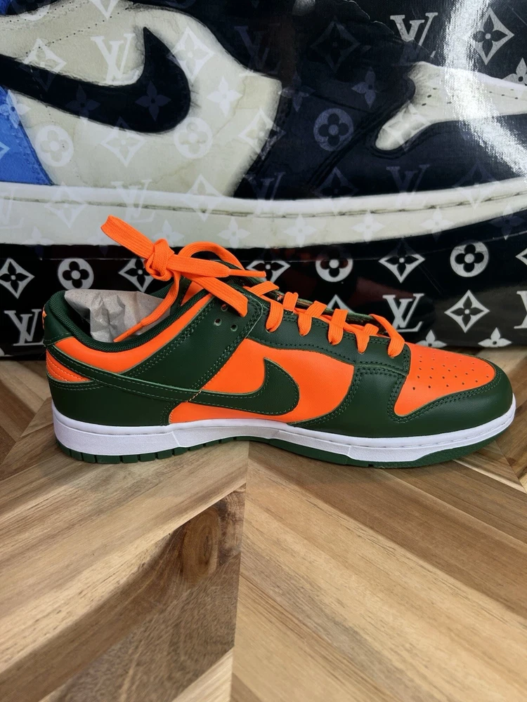 This Nike Dunk Low in size 12 features a green colorway inspired by the Miami Hurricanes with collaborations from Kith, Concepts, Supreme, Travis Scott. It is a limited edition sneaker with a cushioned comfort design, ideal for walking, skateboarding, or basketball. The shoe has a standard width, lace-up closure, low-top style, and is made of leather. Perfect for fans of college-themed footwear.