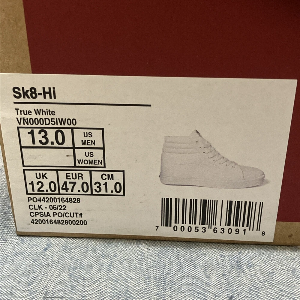 Product Line: VANS Sk8 Brand: VANS Color: White Department: Men US Shoe Size: 13 Type: Athletic Shoe Shaft Style: High Top Style Code: VN000D5IW00 Model: VANS SK8 Style: Sneaker Performance/Activity: Boxing Upper Material: Fabric