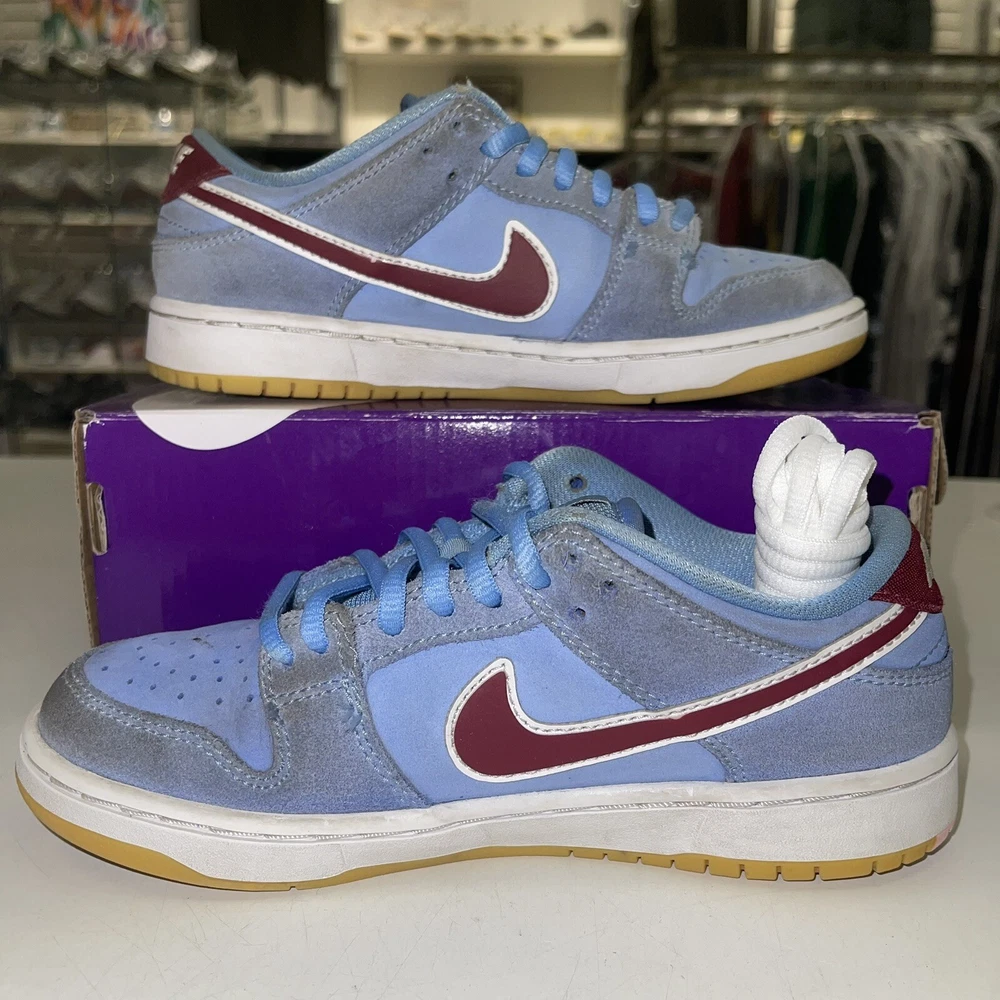 Step up your game with these Nike Dunk Low SB sneakers. The blue suede upper material and Philadelphia Phillies theme make these shoes a stylish choice for any young fan. The standard shoe width and lace-up closure provide a comfortable fit, perfect for both boys and unisex kids. These sneakers are designed for athletic performance and activity, specifically boxing. The low top shoe shaft style and Nike Dunk product line ensure that these shoes are of the highest quality. Don't miss out on the chance to own a pair of these popular sneakers, worn with the original box.
