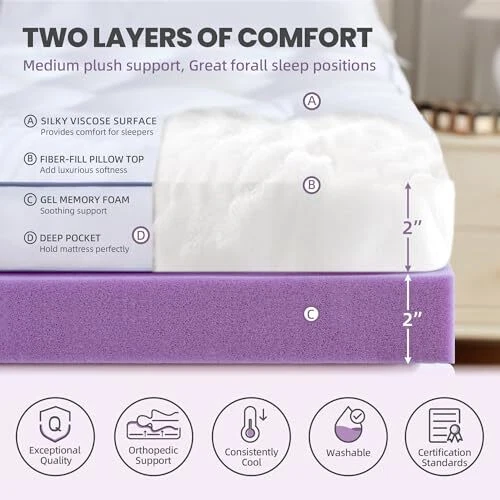 Return Policy Fast Delivery Trusted seller Twin Size 2 Inch Gel Memory Foam Mattress Topper Plus 2 Inch Extra Thick 1450GSM Cooling Pillow Top Mattress Pad for Back Pain Relief, Medium Support with 21" Deep Pocket, White Product Description [4in Dual-Layer Comfort & Support]: Featuring a 2 inch cooling gel memory foam combined with a 2 inch microfiber mattress cover, overfilled with GSM 1450 soft down alternative brings you extra softness and ergonomic support to align your spinal perfectly, When combined, it can become a 4-inch thick mattress topper, which not only has strong support, but also provides a cloud-like comfortable experience. [Flexible Temperature Control]: The mattress cover offers flexible temperature control in different seasons. In the colder seasons, the two can be layered for both warmth and support, while in the warmer seasons, the gel-infused memory mattress topper can be used alone. It uses 3D&7D fiber made Three Dimensional Structure that makes the air circulate, gives superior comfort and cooling to keep the surface breathable and cool, brings you a refreshing night! [Relieve Pressure and Certified Quality]: Our soft memory foam mattress topper boasts high-quality construction gives you ergonomic support from head to foot. Fit the body curve, so that your shoulder, neck, back and spine can be in the most relaxed state, so as to relieve pain and CertiPUR-US certification. Skin-friendly materials secure your purchase. Each memory foam undergoes stringent pressure rebound testing to long-term durability without any collapsing issues. [Removable & Washable Down Alternative Cover]: The microfiber top layer can be cleaned easily. Machine washable in cold water, gentle cycle only, tumble dry low. Deep pocket design, which fits mattress between 8''-21''. And a 360° all-around elastic skirt, the bed topper clings steadfastly to your mattress fix the mattress all night and better your sleep. [Easy to unroll]: The topper is delivered to you compressed and needs 24-48 hours to fully expand (may take longer in low temperatures).We offer 12-hour customer support. Feel free to contact us with any questions, and we'll provide a satisfactory solution. Shipping Returns Payment Shipping Shipping is FREE to all addresses other than APO/PO boxes in the lower 48 states. All our stock ships from US-based warehouses. Shipped via USPS or UPS (depending on location and package weight) Unless stated otherwise, all orders will ship within 24-72 hours of your payment being processed. Check our feedback to see the great reviews of FAST shipping we offer. Returns Seller does not accept returns Payment We currently accept payment via eBay managed payments only. Once payment is cleared, we will dispatch your shipment within 1-3 business days. Please refer to the "Shipping" tab for more information regarding shipping speed to your destination.