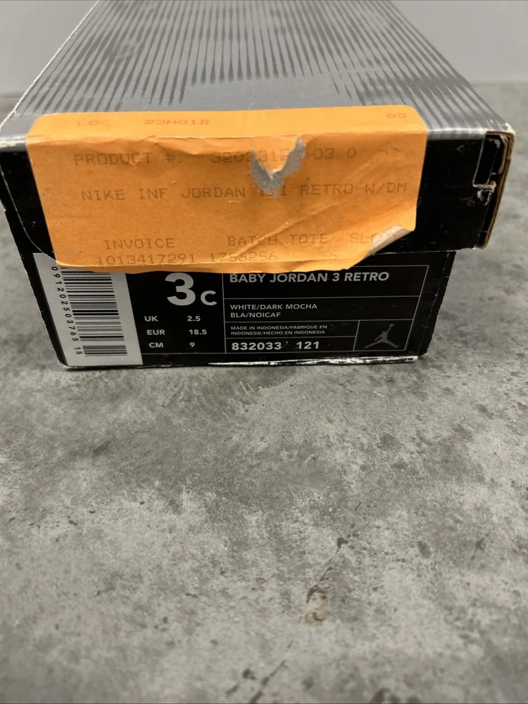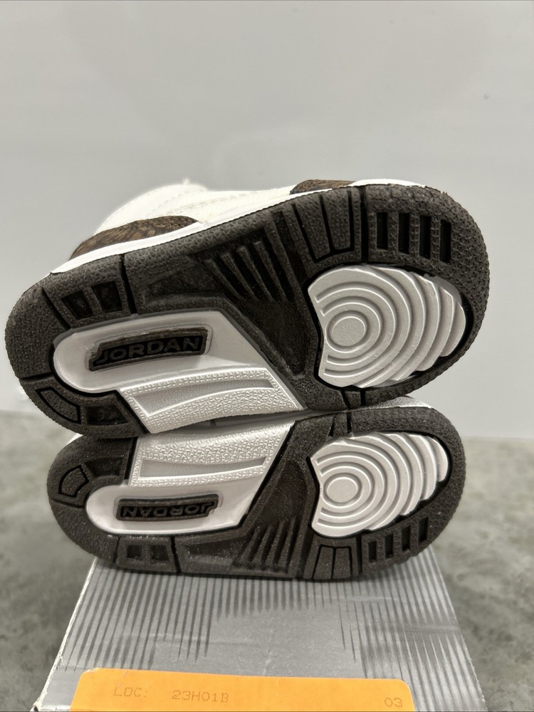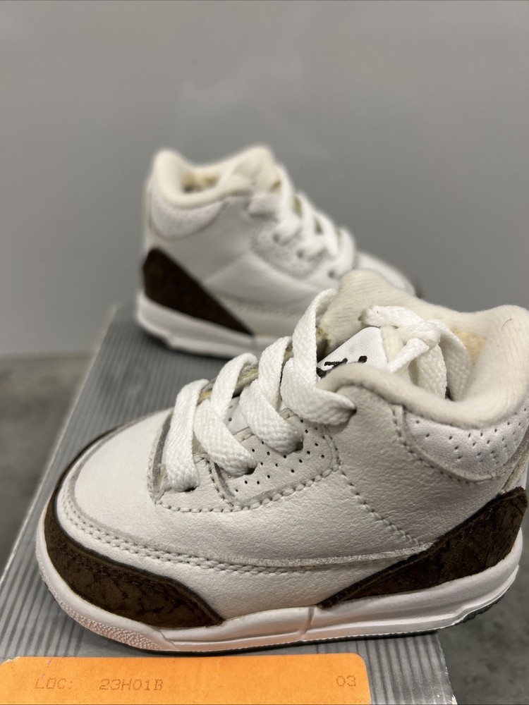 The product is a brand new pair of 2001 Baby Jordan 3 Retro Mocha sneakers in size 3C. These sneakers feature a solid brown color with a lace-up closure and rubber outsole for comfort. The shoes are made of leather fabric with logo accents, perfect for activewear occasions during the summer, fall, and spring seasons. This very rare item comes in its original box, making it a valuable addition to any baby or toddler's shoe collection.