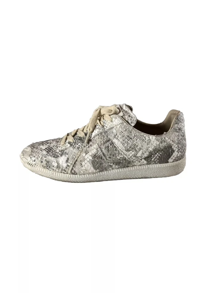 Maison Margiela Snakeskin GATs Size: 42 EU = 9 / 9.5 M US Color: White/Grey Condition: Used A personal pair from my collection i am sz9.5 fits perfect def can fit half sz down and maybe half sz up from 9.5, this is such a rare shoe with a illusion of snakeskin leather on pony hair/fur type of upper material which is soft, heel drag is at a slim minimum , good piece to rock everyday; hearing offers Any questions feel free to shoot me a message All items shipped ASAP🚨!!! Follow & Dm My bio for discount💯