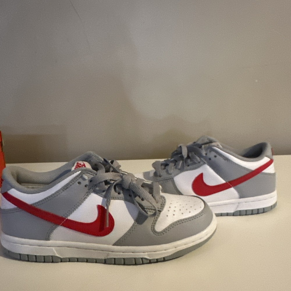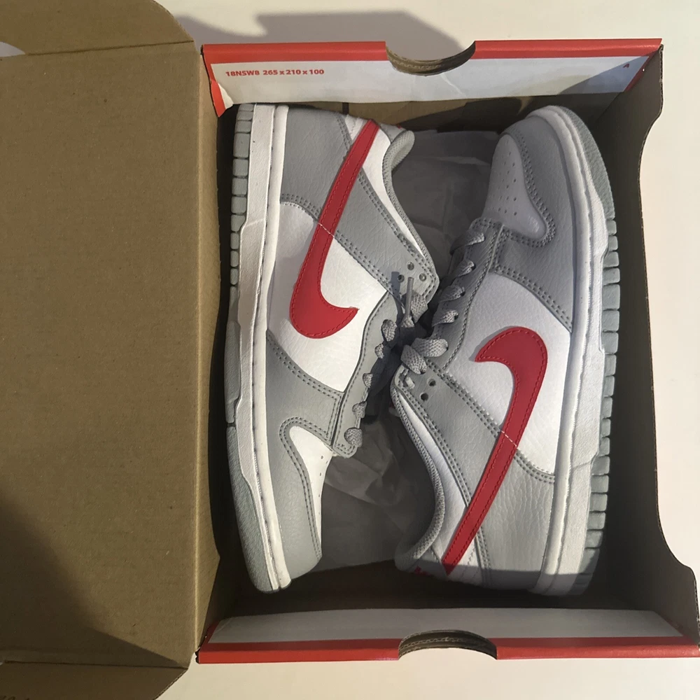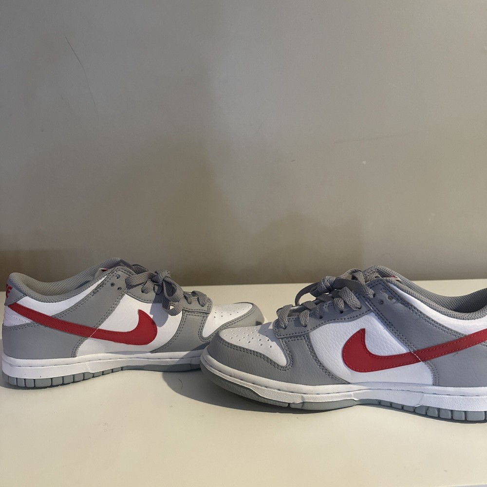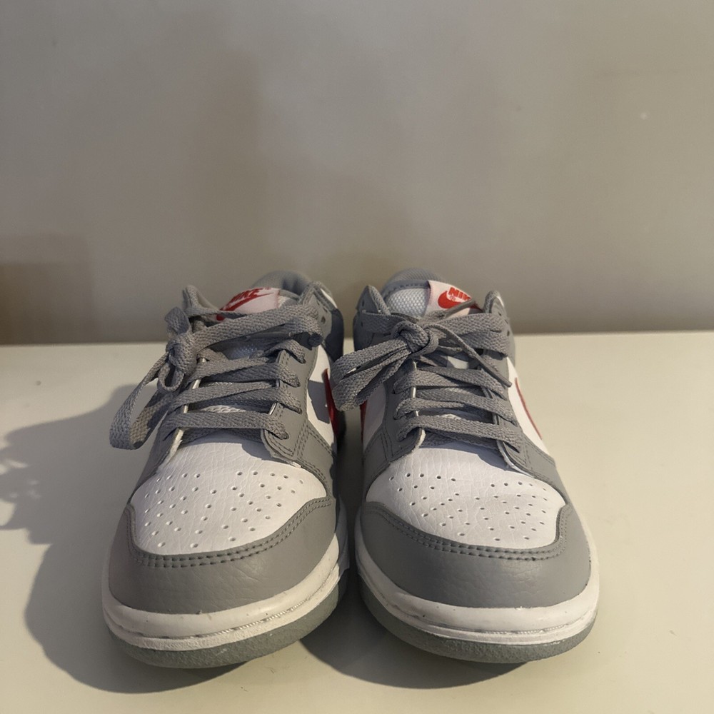 This is a pre-owned Nike Dunk Low GS sneaker in amazing condition only worn twice in size 4.5 for men, released in 2022. The colorway is Wolf Grey/White/University Red, featuring a multicolor design. The style code is DV7149-001, with a release date of May 1, 2022. The shoe is part of the Nike Dunk product line and is a stylish athletic footwear option.
