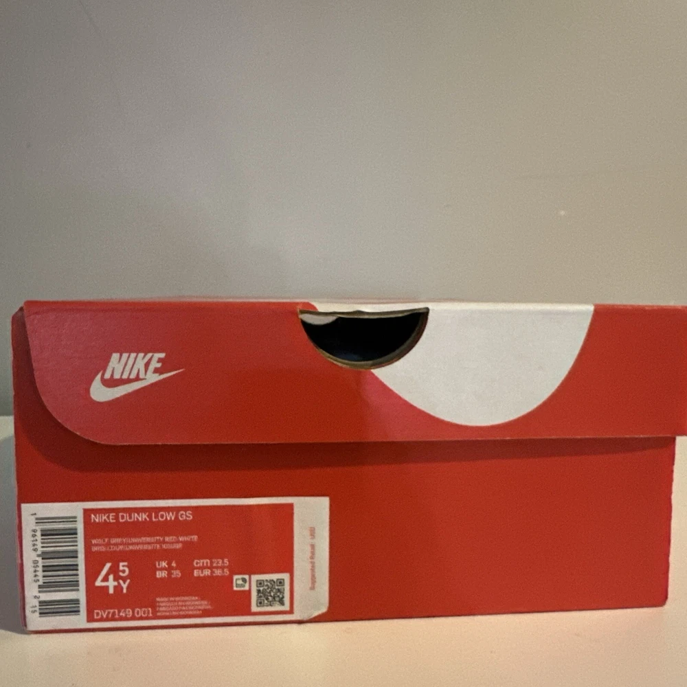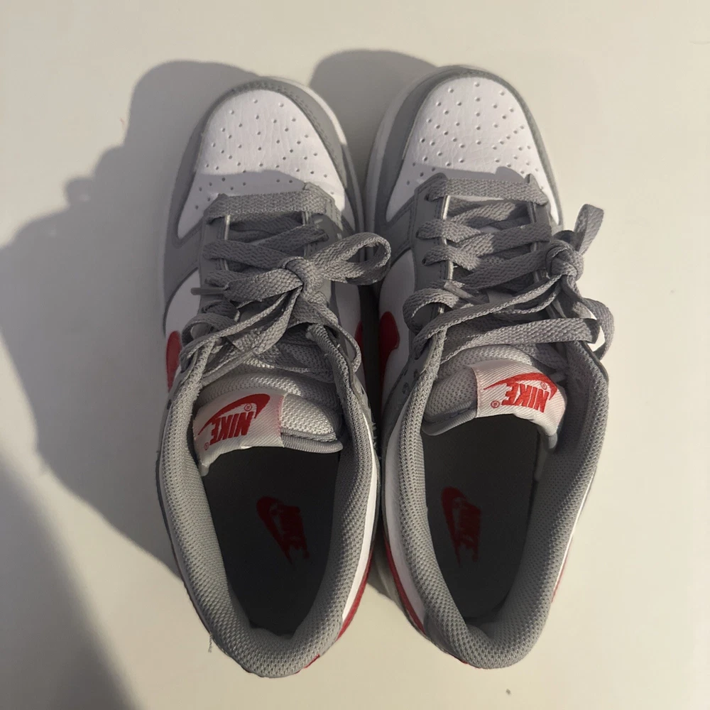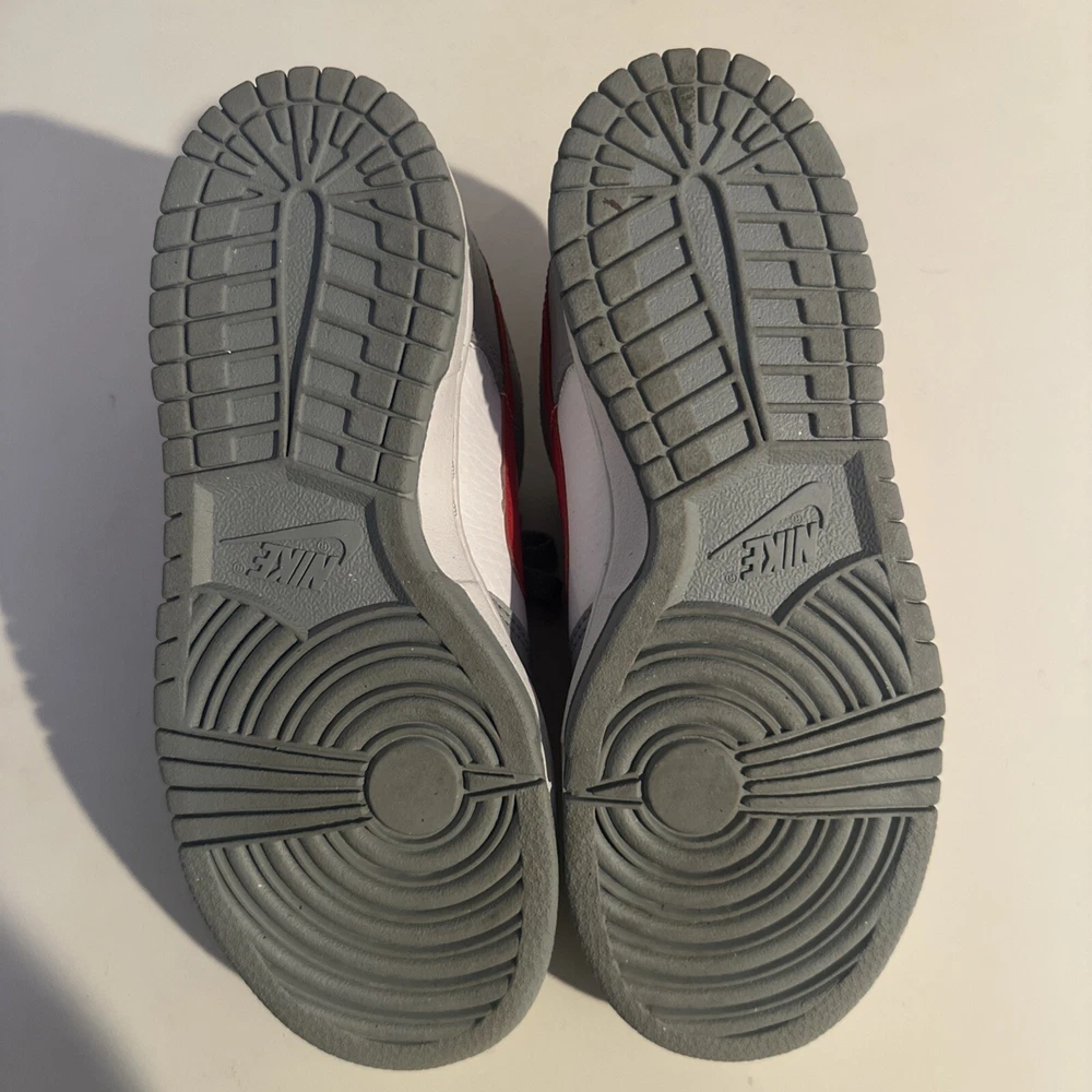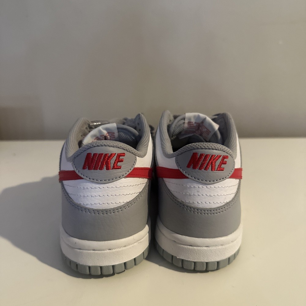 This is a pre-owned Nike Dunk Low GS sneaker in amazing condition only worn twice in size 4.5 for men, released in 2022. The colorway is Wolf Grey/White/University Red, featuring a multicolor design. The style code is DV7149-001, with a release date of May 1, 2022. The shoe is part of the Nike Dunk product line and is a stylish athletic footwear option.