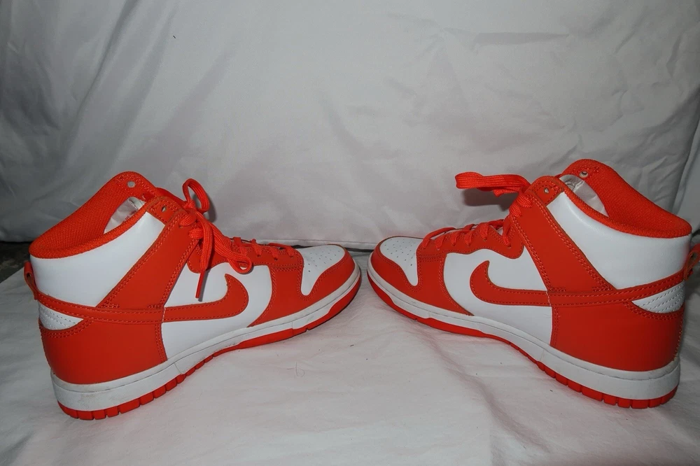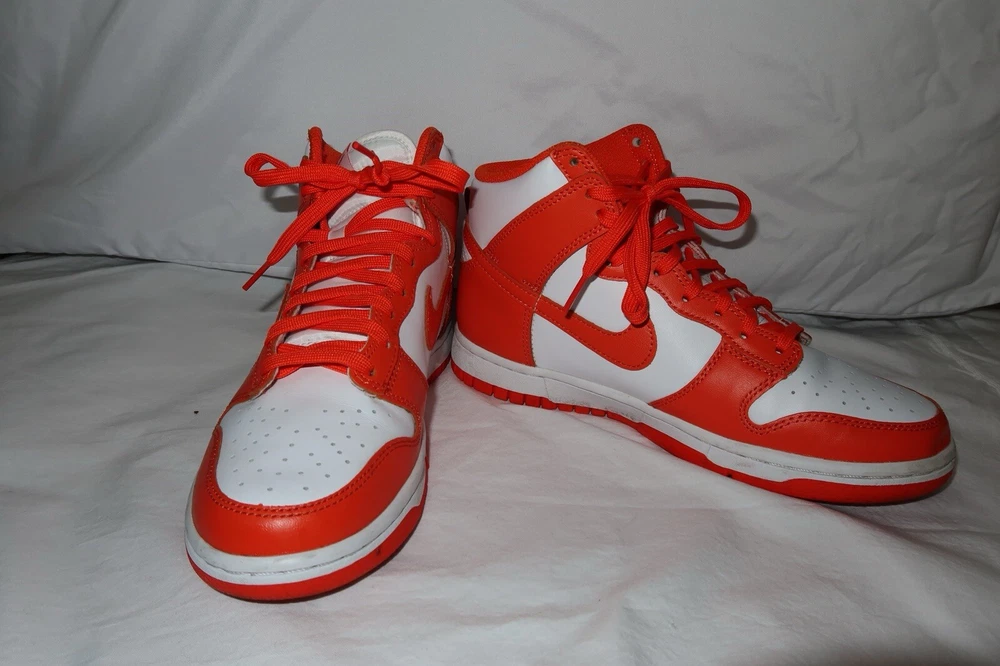 This Nike Dunk SP 2021 High Syracuse sneaker in size 6.5 features a High Top shoe shaft style in a vibrant White/Orange Blaze colorway. Worn twice