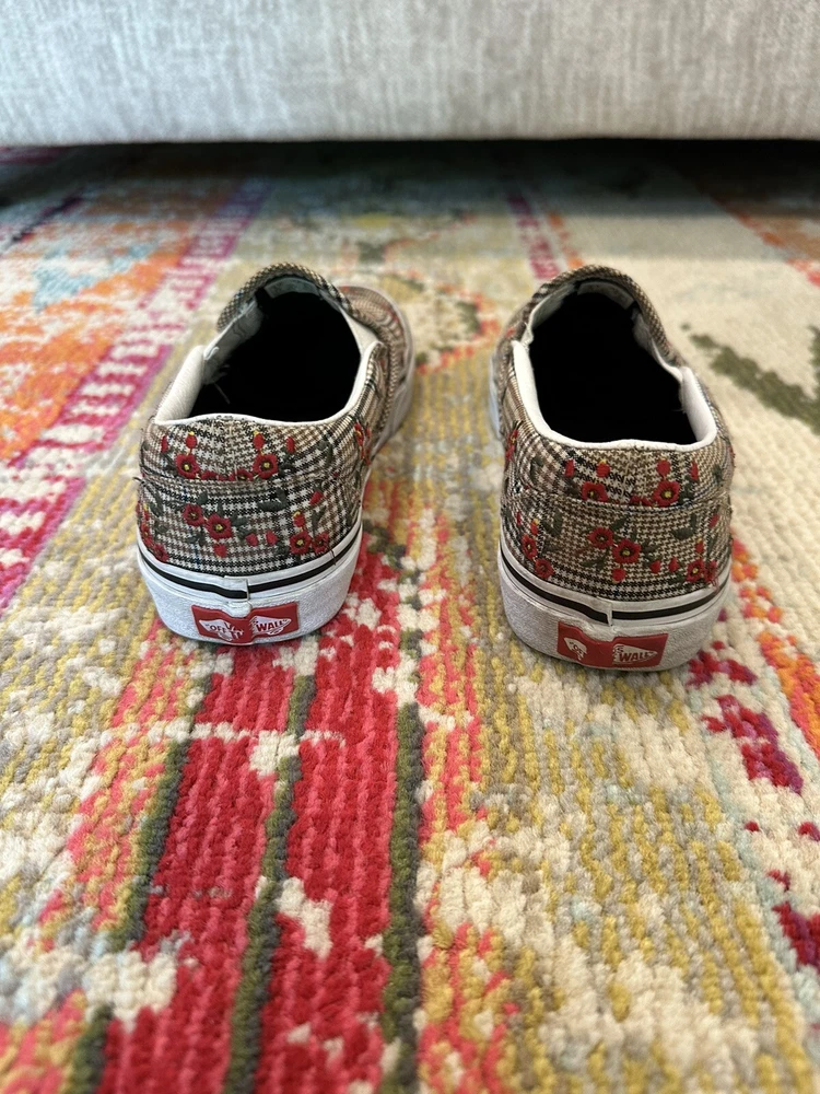 Elevate your casual look with these VANS Authentic sneakers in a size 6.5. The Glen Plaid Floral Embroidery adds a touch of elegance to the classic design, making them perfect for any occasion from activewear to casual outings. The slip-on style and low-top shoe shaft make them easy to wear and comfortable for all-day use. These sneakers are made with breathable fabric and feature a cushioned insole for added comfort. The rubber outsole provides durability for walking, beach activities, school, or even skateboarding. These VANS Authentic sneakers are a must-have for any shoe collection and are sure to become a favorite.