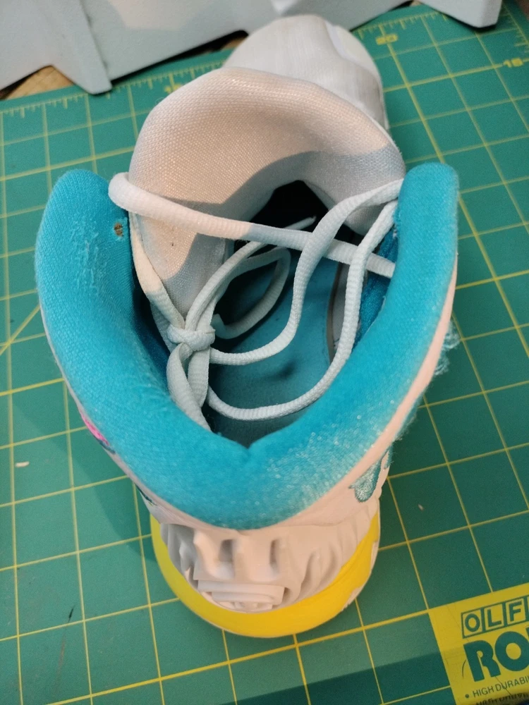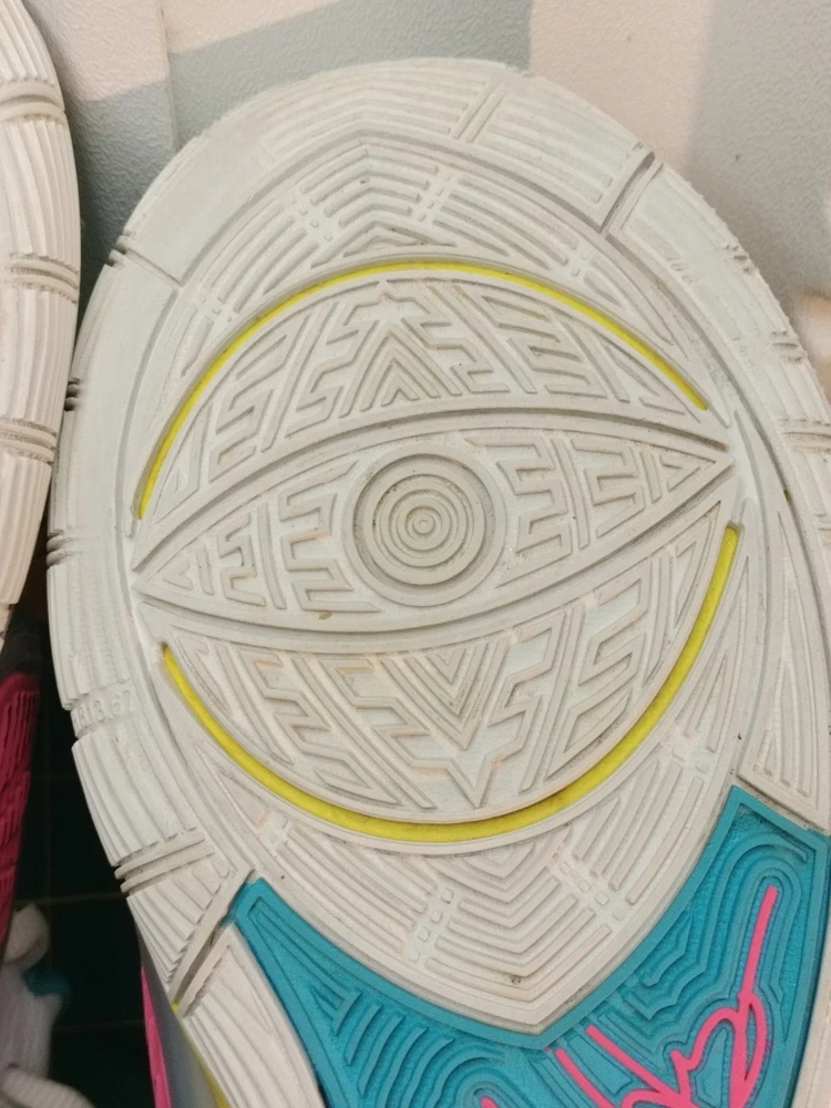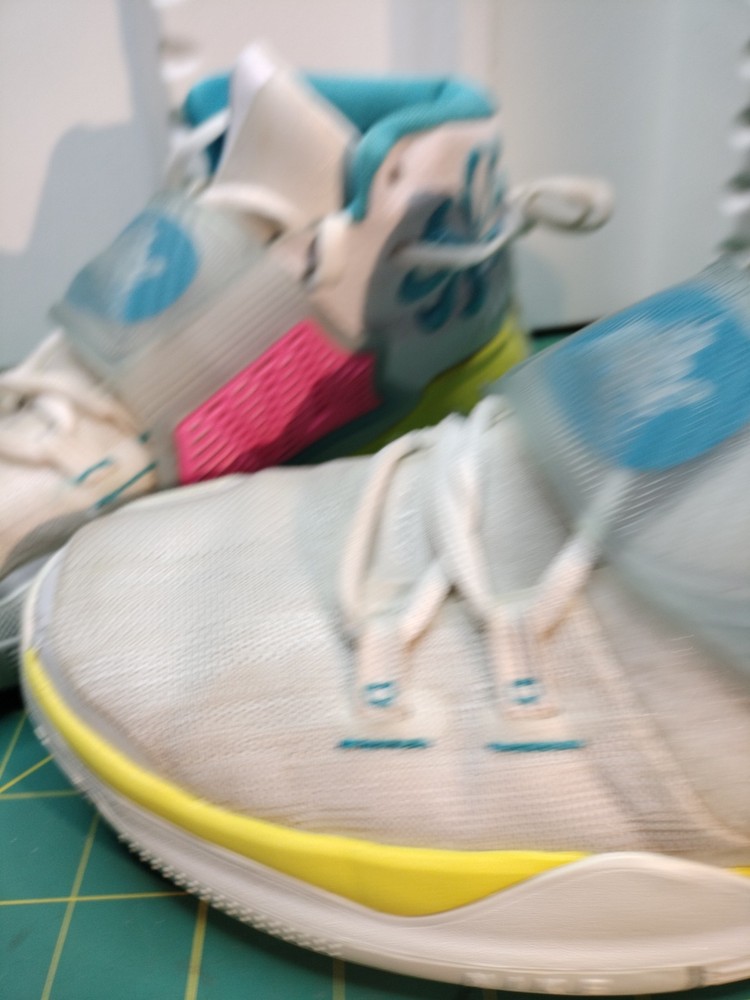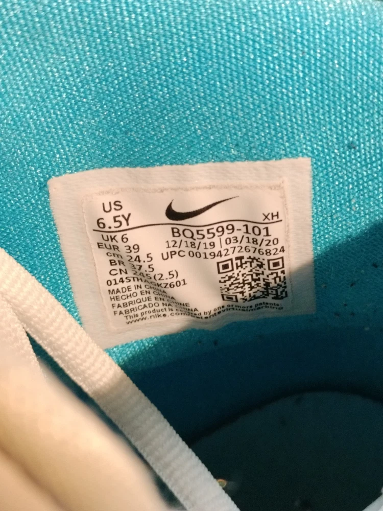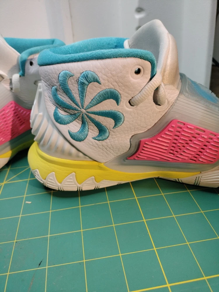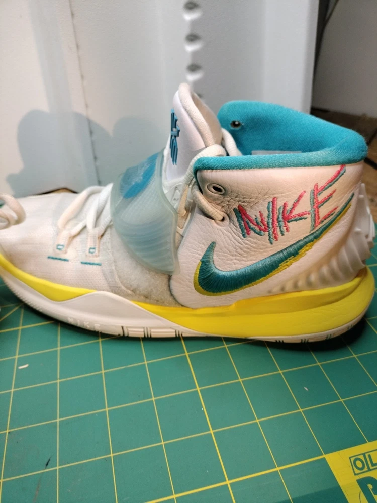 The product is a pair of Nike Kyrie 6 Mid sneakers in size 6.5Y, featuring a vibrant neon graffiti design in pink, blue, and yellow colors. These athletic shoes have a mid-top shoe shaft style and are part of the Nike Kyrie product line. The sneakers are designed for unisex kids and offer a stylish and comfortable option for play or casual wear. . Pre owned..light Wear as seen in pics.. good condition.. Fast shipping...