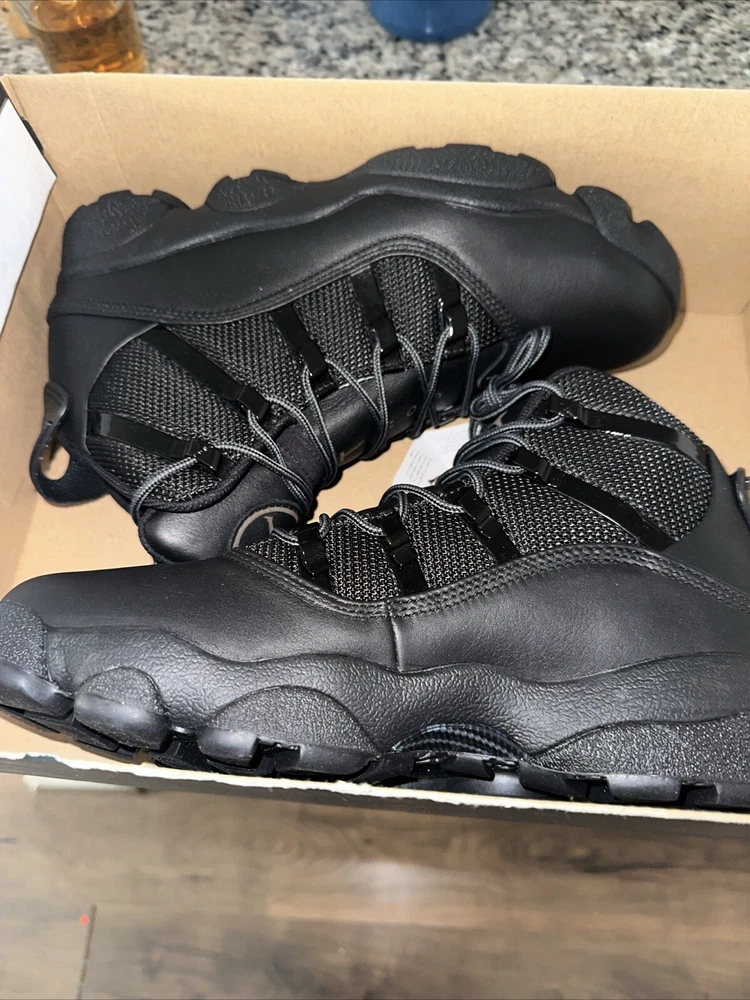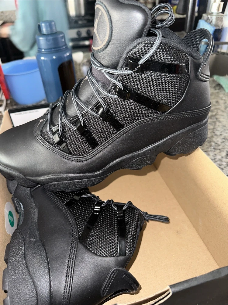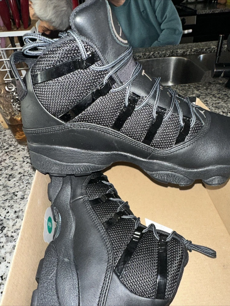 Elevate your shoe game with these stylish and versatile Nike Air Jordan Winterized 6 Rings sneakers. Perfect for any occasion, whether it's activewear, casual wear, or workwear, these shoes feature a solid black colorway with a high top shoe shaft style and lace-up closure. The outsole is made of durable rubber, while the cushioned insole provides comfort and support for a range of activities, including walking, cross training, CrossFit, basketball, running, and jogging. With a sleek design and Triple Black theme, these Air Jordan sneakers are a must-have for any sneakerhead or outdoor enthusiast. They are part of the Air Jordan product line and boast features like adjustability, performance, and durability. Whether you're hitting the gym or just running errands, these shoes will keep you stylish and comfortable all day long.