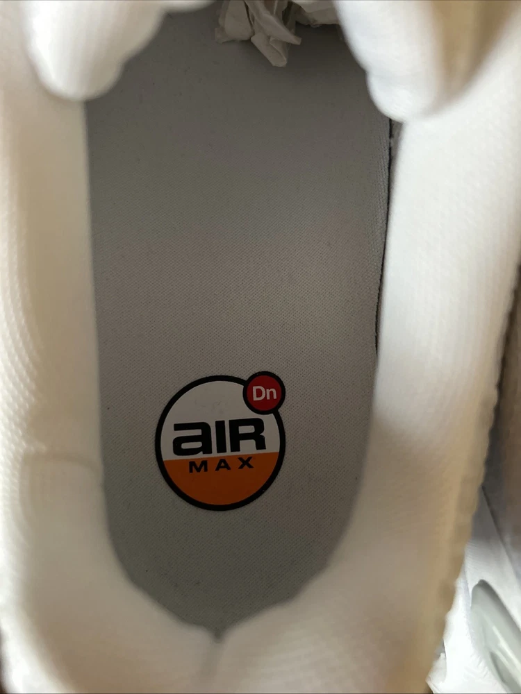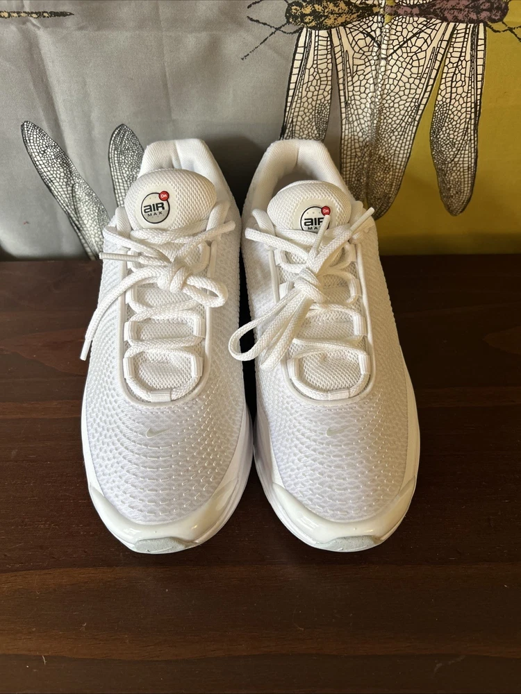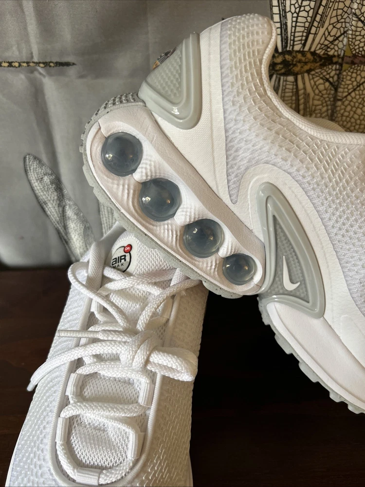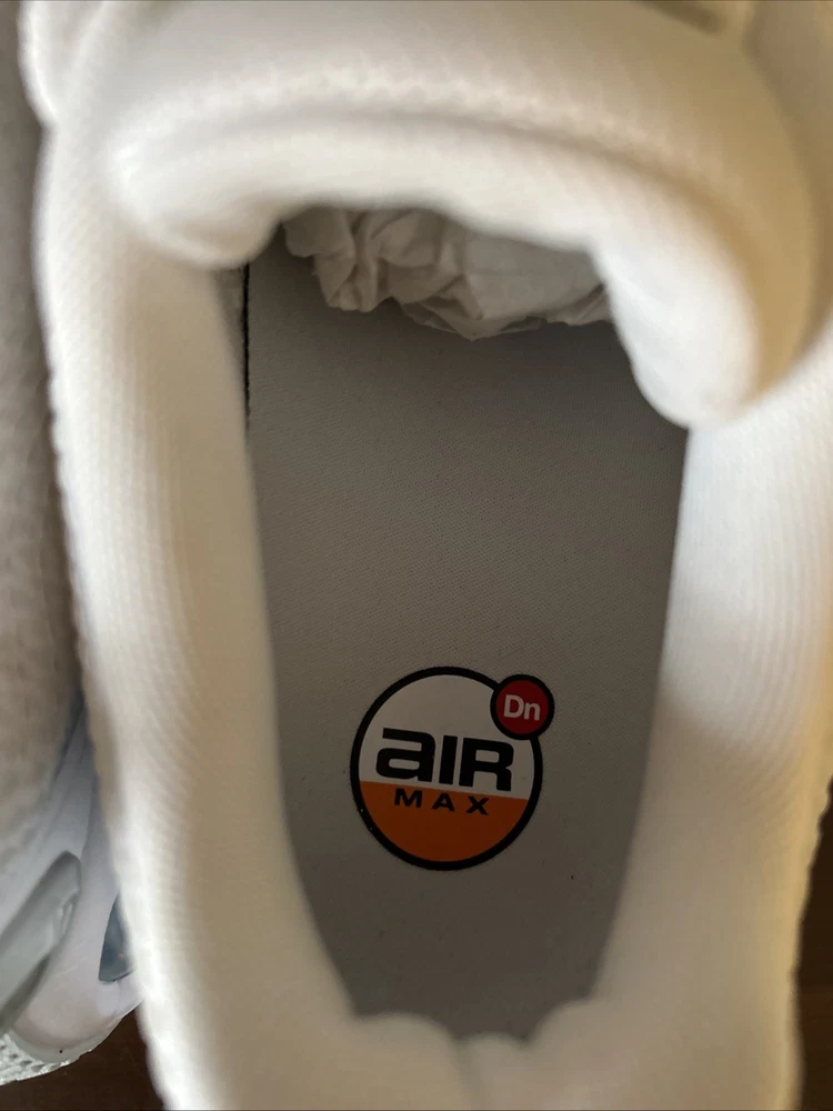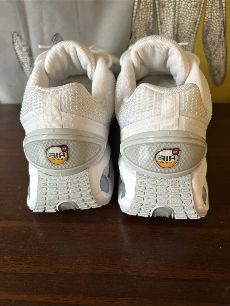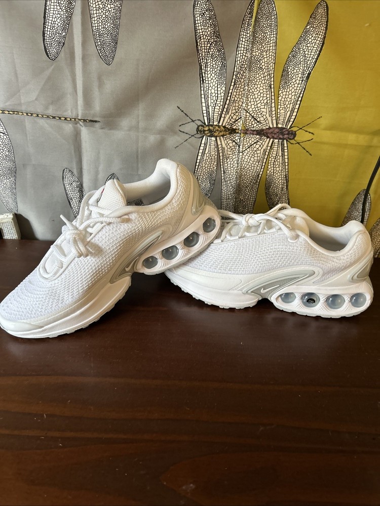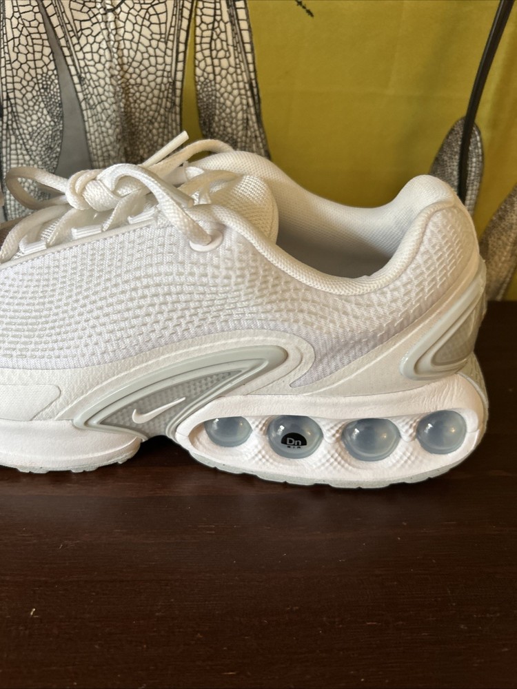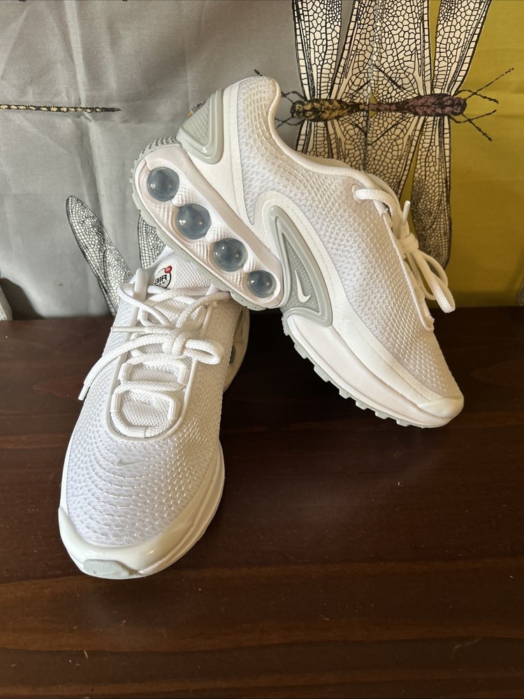 The Nike Air Max DN White Metallic Silver W in size 8.5 is a stylish and comfortable athletic sneaker designed for women. With a breathable mesh upper and a cushioned foam insole, these shoes are perfect for activewear or casual occasions. The lace-up closure and rubber outsole provide a secure fit and durability for year-round wear. This model, part of the Nike Air Max product line, features a white color with metallic silver accents and is ideal for the summer, fall, and spring seasons.