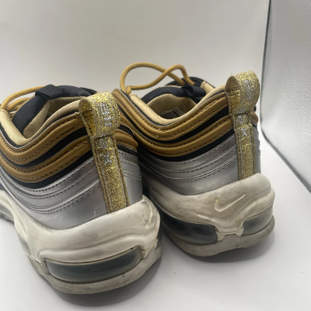 The Nike Air Max 97 Metallic Gold W in size 9 is a stylish and sporty athletic sneaker for women. Released in 2018 as part of the Nike Air Max product line, this shoe features a shimmering gold colorway with metallic accents. With the iconic Nike Air Max 97 model and comfortable sneaker style, this shoe is perfect for those looking to make a statement while staying active. The size 9 fit ensures a comfortable and secure feel for all-day wear.