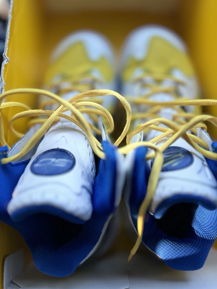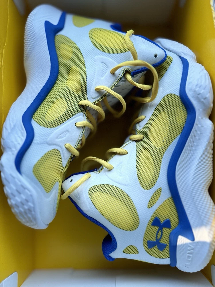 Elevate your game with these Under Armour Curry FloTro Dub Nation sneakers. Designed with the input of Stephen Curry himself, these shoes feature a white blue and yellow colorway and are perfect for any athletic activity. The size 9 sneakers are ideal for men and come in a UK size 8 and EU size 42.5. Crafted with high-quality materials, these sneakers are durable and comfortable. The style code for this shoe is 48408959 and it belongs to the Under Armour Stephen Curry product line. Whether you're hitting the court or the streets, these sneakers are sure to turn heads.