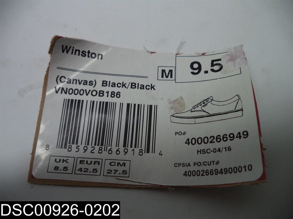 This item is:_____________________________________ Size 9.5 M Men's VANS Winston Black Canvas Shoes VN000V0B186 Shoes have minor defects as shown. Insole are missing from shoes.______________ See photos. Includes only what is shown in the picture. 1005 Warehouse Location:___Warehouse #1_Shelf_____________ 11171 Box 1138__________ Sales tax will be added to items shipping to locations in Kansas. _____________________________________________________________________ _____________________________________________________________________ _____________________________________________________________________ By bidding and or purchasing this item(s) you (the buyer) agree to the following terms and conditions: 1. An item is defined as the following: The unit or units purchased in the ebay listing, (it could be a single unit, multiple units, a mixture of units, a variety of units, the incorrect unit or any combination of units not mentioned). It also includes the packaging, or lack thereof, the shipping label, and any contents place in the package by error. 2. The Seller is defined as Seller and/or Consignor. 3. The buyer is defined as the entity that purchased the item from Seller and/or Consignor. 4. If the buyer does not agree to these terms and conditions then do not purchase from us. 5. All items are sold AS IS No warranty or liability is expressed or implied. 6. The buyer agrees that: All items are shipped without insurance. It is the responsibility of the buyer to let us know if they want insurance on the item. Insurance cost is $2.00 for every $50 insured, in $50 increments. The buyer agrees that if no insurance is purchased and the item is not received or received damaged that no claim shall be brought against the seller. 7. We only ship to PayPal confirmed street addresses, no exceptions. No PO Boxes, APO, FPO or similar addresses. 8. The buyer agrees that the sale is considered complete once the carrier has picked up the item from the seller. 9. The buyer agrees that if there is a dispute that arises that the dispute will be settled in the State of Kansas under the laws of Kansas. 10. The buyer agrees that the item fits the buyers purpose prior to bidding. 11. The buyer agrees to indemnify and hold harmless the seller from any and all claims arising out of any conditions or defects for the item or items that they purchased 12. We only ship to the continental United States. The shipping price quoted is for the continental United States Only. All other locations will be charged extra. Out of county buyers agree to pay any additional charges that we ask them to pay including but not limited to import duties, shipping costs, packaging costs, time costs, and other costs. If the item is shipped via ebay global shipping program these terms and conditions still apply. 13. Claims made against the carrier for non-delivery, lost in transit or any other reason shall be made solely by the buyer without aid from the Seller. 14. In the event that any clauses or phrases contained here within are ruled out by a judge, the law, a lawyer, jurors, and or any other entity all others remain in effect. 15. If any claim is brought against the Seller the buyer agrees to pay for any and all costs including legal fees, travel, time, accommodations, and other costs. Late payment will result in the seller charging interest at the maximum legal rate. 16. In any event or circumstance the maximum liability to the Seller is the purchase price plus cost of shipping plus sales tax if applicable. This amount is not subject to inflation, interest, inconvenience fee or any other price adjustment. 17. The buyer agrees there will be no refunds for any reason outside of the Ebay return policy. 18. The buyer understands that our items are wholesale, overstock, unclaimed, foreclosure purchase or salvage goods. Most boxes have been opened for inspection and photos. If items are listed as new they may not come with original packaging. 19. The buyer agrees that they are trained, licensed, qualified, and understand how to properly use, dispose of and handle the product in accordance with law and regulations. 20. The buyer agrees that if any part of these terms and conditions is determined to be void that it does not void or alleviate the enforcement of the remainder of this contract. 21. Seller and/or Consignor is not an authorized distributor, reseller or representative of the products featured on this website. All product names, trademarks, brands and logos used on this site are the property of their respective owners. The depiction, description or sale of products featuring these names, trademarks, brands and logos is for identification purposes only and is not intended to indicate any affiliation with or authorization by any rights holder.