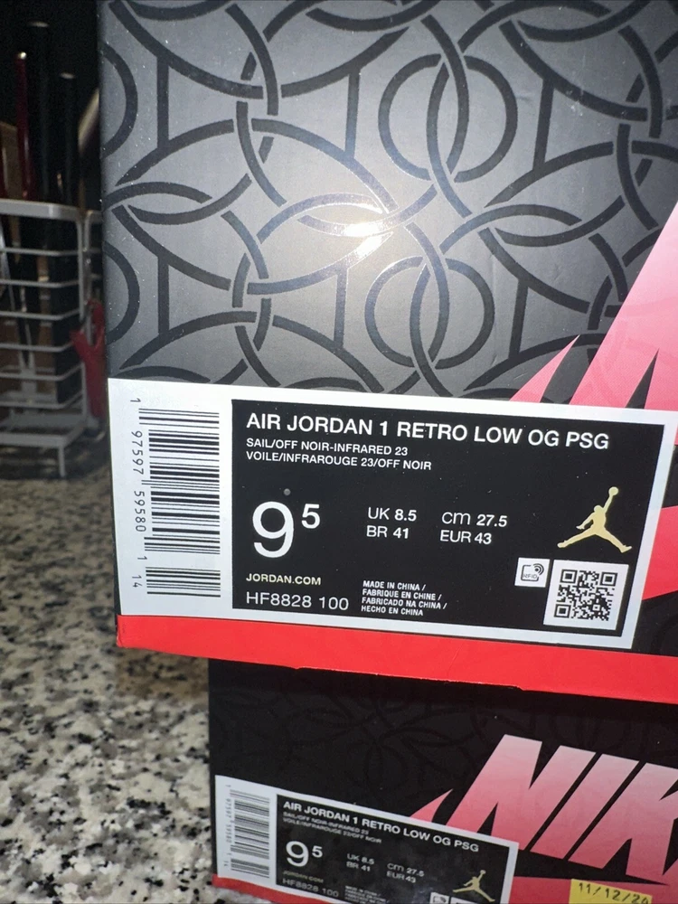 Brand: Jordan Style Code: HF8828-100 Color: Red Theme: Paris Department: Men Type: Athletic US Shoe Size: 9.5 Shoe Shaft Style: Low Top Silhouette: Jordan 1 Retro Low Style: Sneaker Upper Material: Leather Model: Air Jordan 1 Product Line: Air Jordan