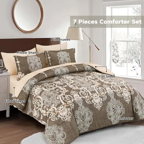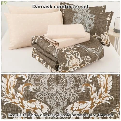 Return Policy Fast Delivery Trusted seller King Size comforter set, 7 Pieces Boho Bed in a Bag for King Bed, Browm Damask Comforter Set with Sheet, Pillowcases & Shams, Soft Microfiber Lightweight Bedding Set for All Season(90"x104") Product Description [7 Pieces King Bedding Set]: Brown damask bed in a bag king comforter (90"x104"), fitted sheet (78"x80"+14"), flat sheet (102"x108"), 2 pillowshame (20"x37"), 2 pillowcases (20"x40"). [Unique Bohemian Brown Damask Comforter Set]: Black boho reversible queen bed sets gives an eye-catching update to your bedroom decor. Classic floral paisley and damask medallion prints bedding set, making this comforter exudes style and luxury, that coordinates with various home decor styles, adding more aesthetic and coziness to your bedroom. [Soft Cozy Thick Comforter]: Our queen bed in a bag is made of microfiber outer fabric with ultra soft inner fill, makes the bed comforter soft touch, lightweight breathable, and fluffy. Good warmth and breathability, ensuring a warm and cozy resting space for you. Boho comforter set queen suitable for all seasons, providing you all-year round healthier sleep quality. [Enhanced Durability]: Unique bohemian queen bedding sets, featuring neat stitching construction that ensures a stronger connection at the seams and prevents the filling from shifting. King comforter set modern and noble elements provides timeless elegance and fashion. You could use it to decor your bedroom, guestroom or kids room, etc. [Easy Care]: This fluffy comforter set queen size is durablility and easy to maintain. 7 Pieces comforter sets is machine washable in cold water on a gentle cycle, tumble dry low, do not bleach. Tips: Since bed in a bag is packaged in a vacuum bag, it is highly recommended to hang the bedding out in the sun and tap it gently for fluffy. Shipping Returns Payment Shipping Shipping is FREE to all addresses other than APO/PO boxes in the lower 48 states. All our stock ships from US-based warehouses. Shipped via USPS or UPS (depending on location and package weight) Unless stated otherwise, all orders will ship within 24-72 hours of your payment being processed. Check our feedback to see the great reviews of FAST shipping we offer. Returns Seller does not accept returns Payment We currently accept payment via eBay managed payments only. Once payment is cleared, we will dispatch your shipment within 1-3 business days. Please refer to the "Shipping" tab for more information regarding shipping speed to your destination.