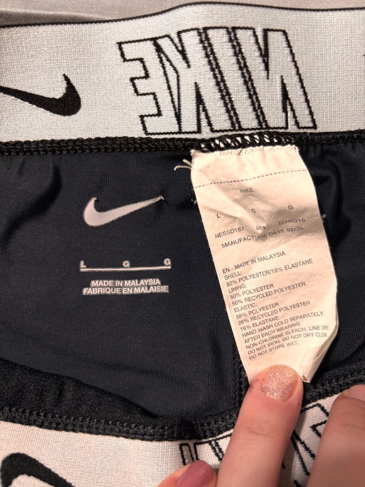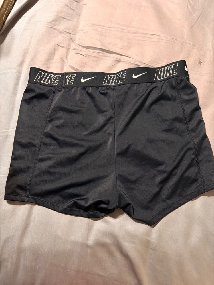 These black Nike women's shorts in size large are perfect for compression training. Made from polyester blended fabric, they offer a comfortable and lightweight fit with a stretch for ease of movement. The athletic design is ideal for activities like gym workouts, track and field, cheerleading, and running. The elastic waist ensures a secure and customizable fit, making them a versatile and stylish addition to any woman's activewear collection.