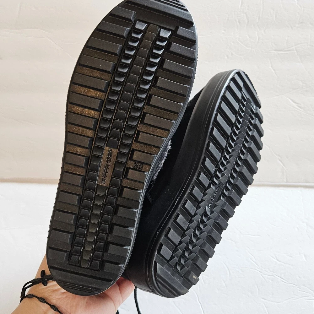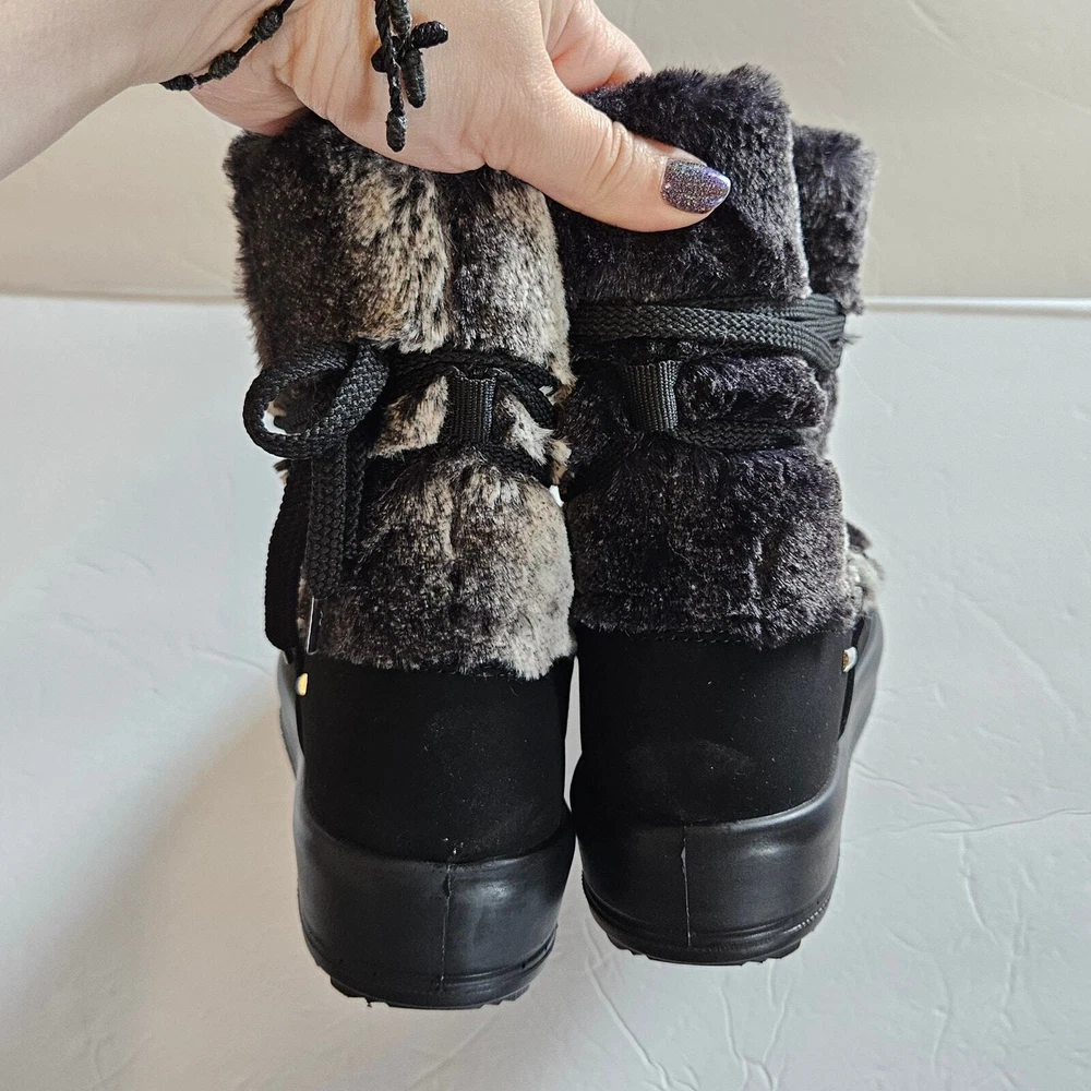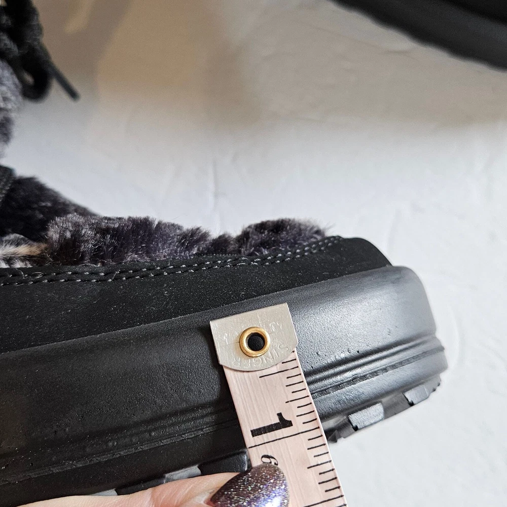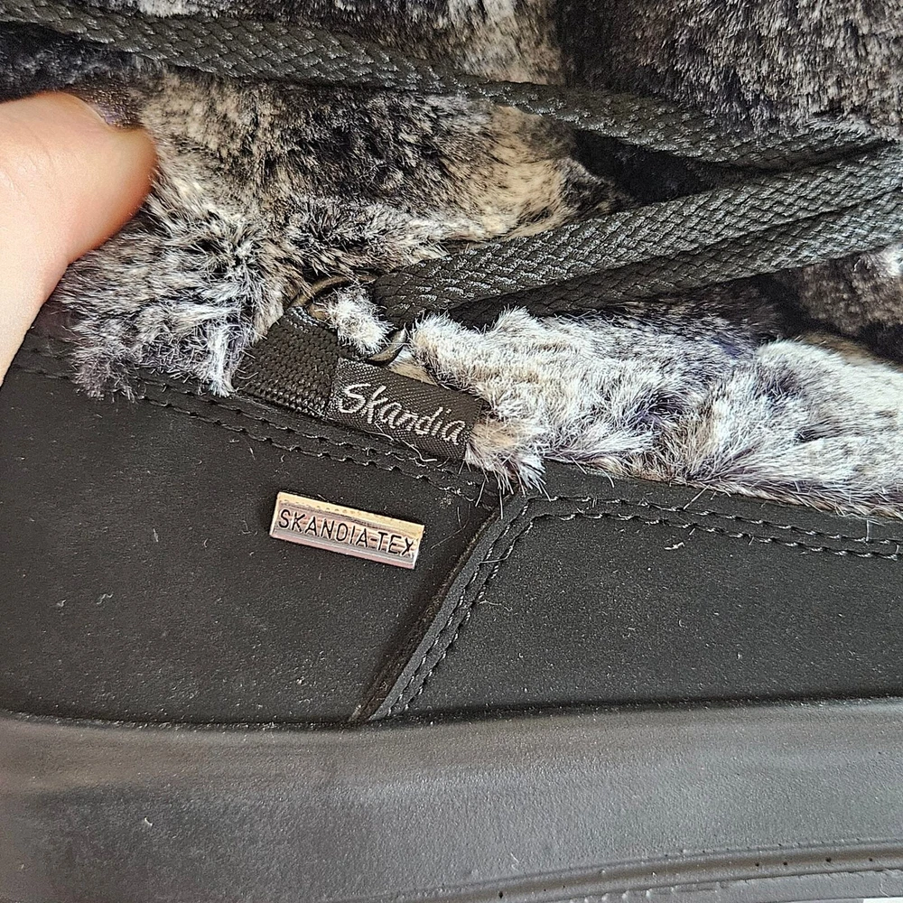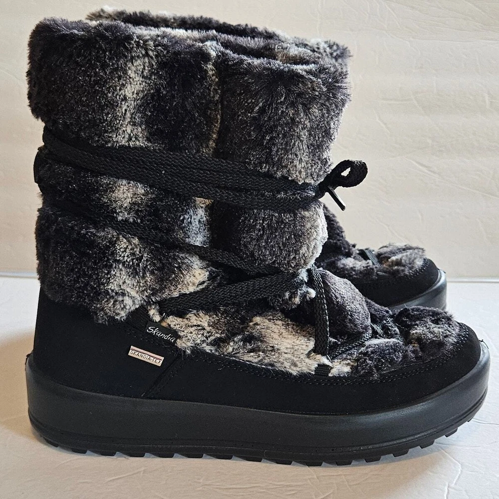 Skandia Faux Fur Lace Up Boot Super Grip Women's EU 38 Winter For unquestionable chic style from the slopes to the city, slip on the Skandia Boots for a delightfully warm and stylish trek through the snow. Skandia-Tex Super Grip bottoms Shearling lining Lace up around the ankle Colors - Black gray Women's EU 38 Heel is about 1.5" with a 1" platform Excellent pre-owned condition, no rips, tears or stains. Looks unworn. Smoke free, dog friendly home. chic unique winter wardrobe comfort warmth ski