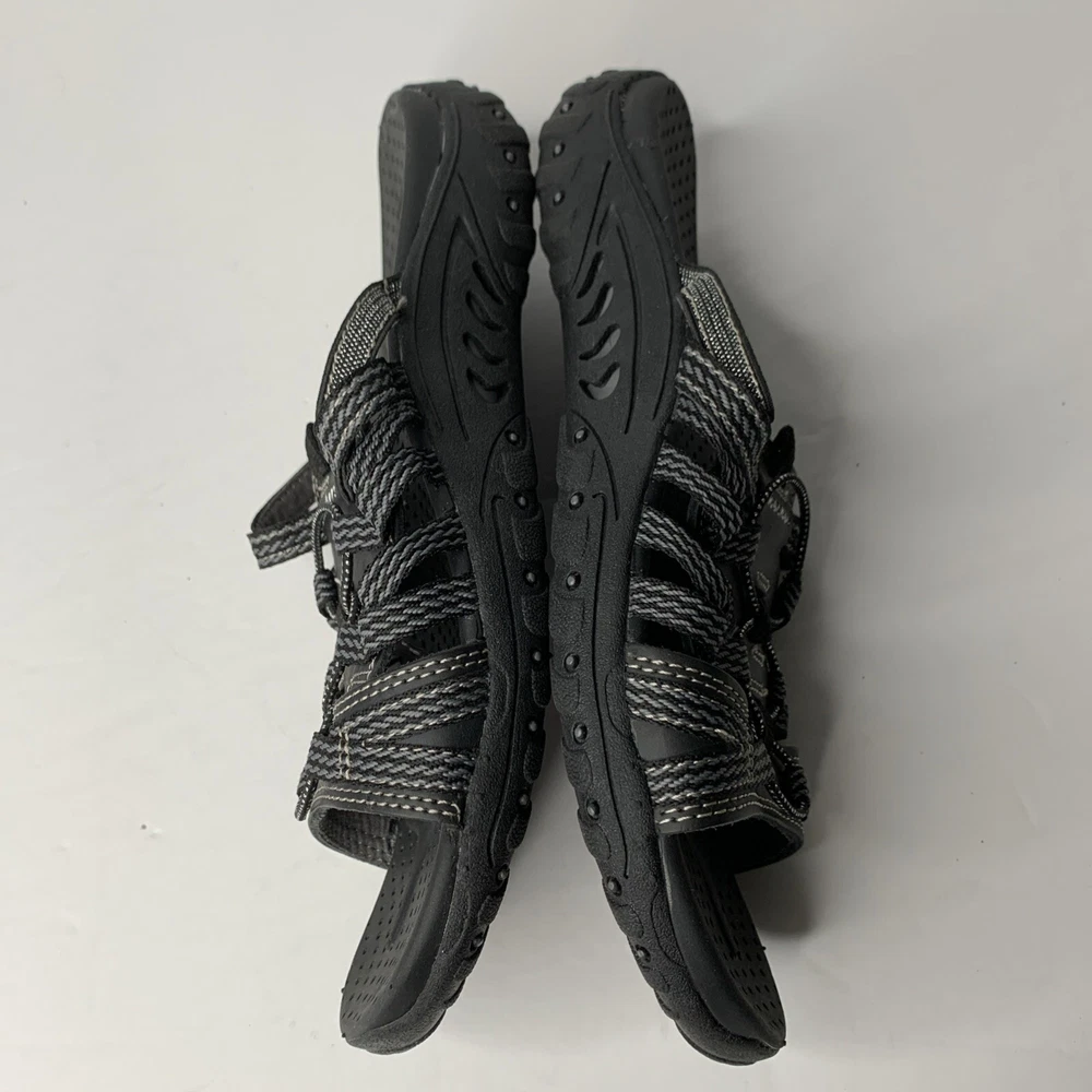 These Skechers 40873 Reggae Repetition sandals are black slip-on slides in women's size 8. They feature a low heel, cushioned insole, breathable fabric lining, and a rubber outsole. The design includes the Skechers logo and is perfect for casual comfort, outdoor activities, and travel. Made with leather uppers, they embody a nature and sports theme from the Skechers Outdoor Lifestyle product line.