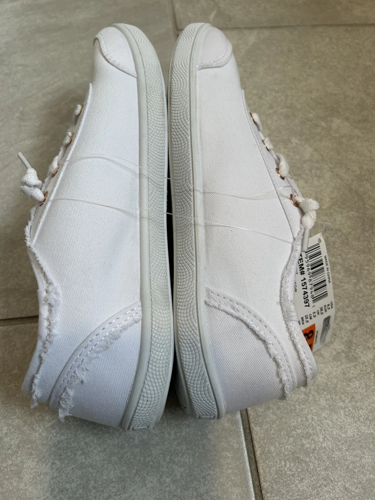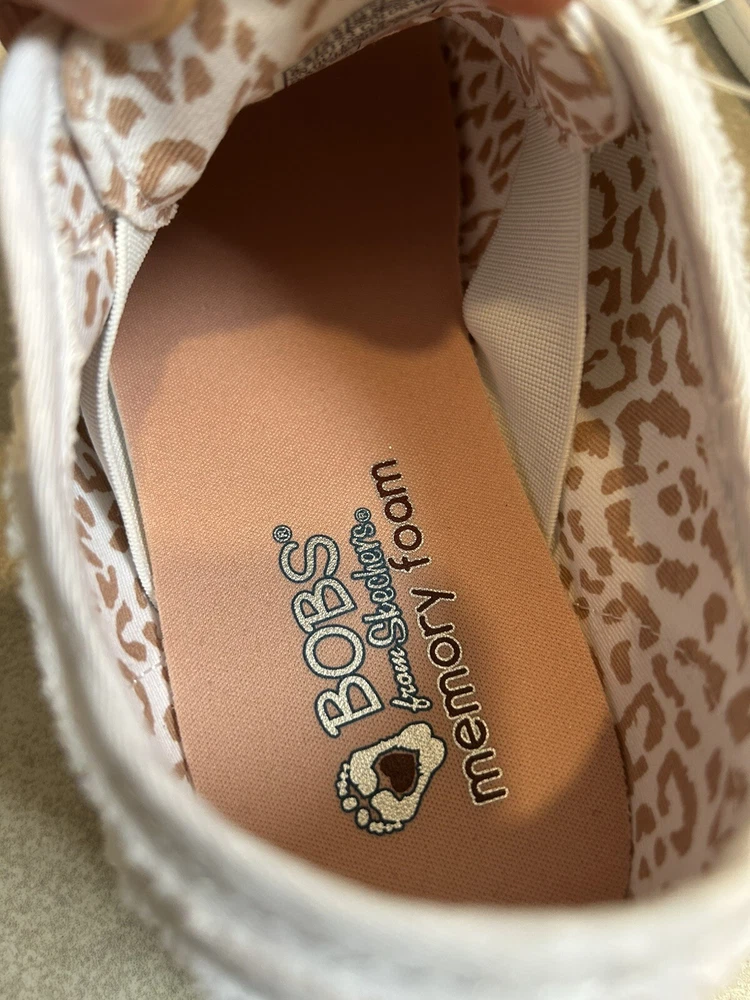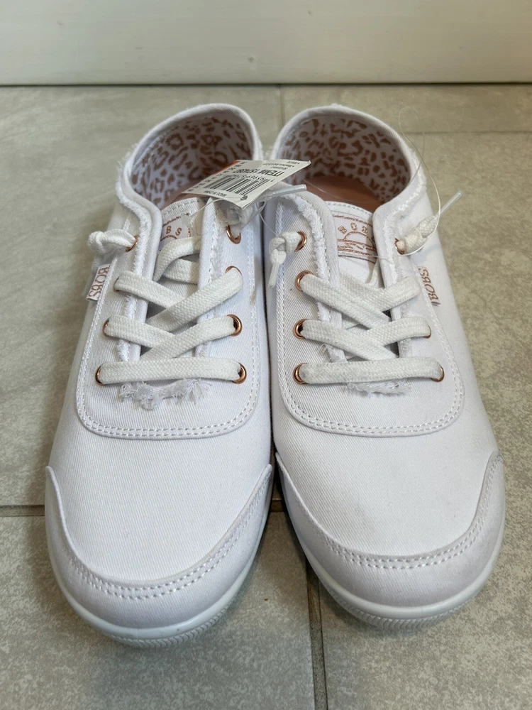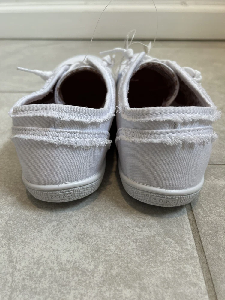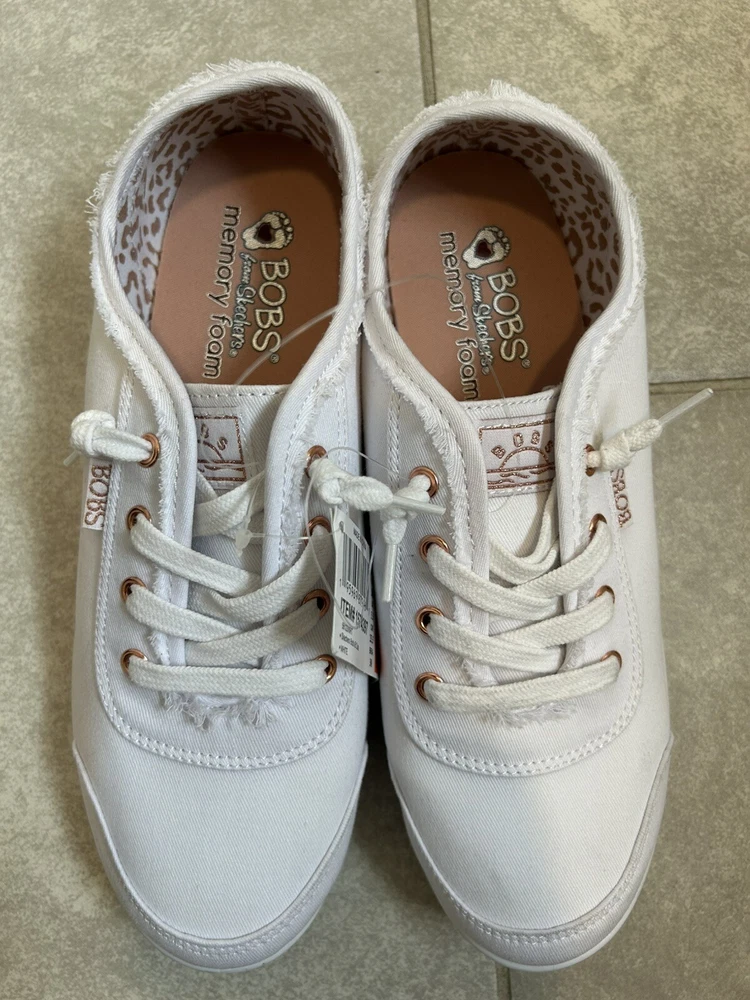 These Skechers Bobs B Cute slip-on shoes are designed for women in a casual style. They feature memory foam for added comfort, have a white color, and come in a US size 8. The upper material is fabric, and they have a B width. Perfect for a comfortable and stylish sneaker option.