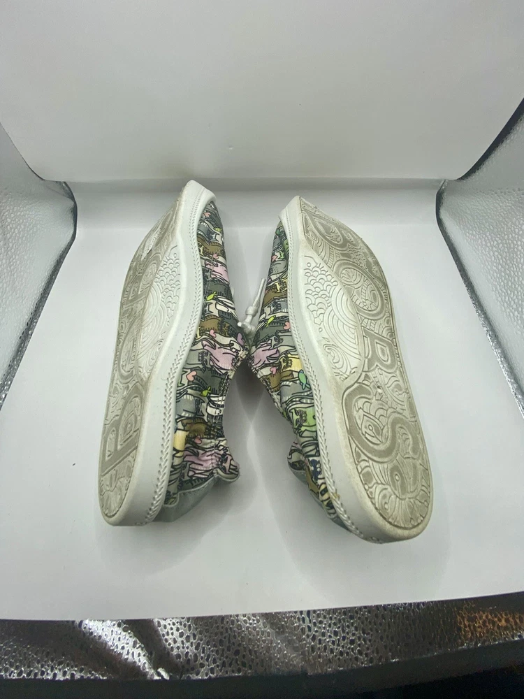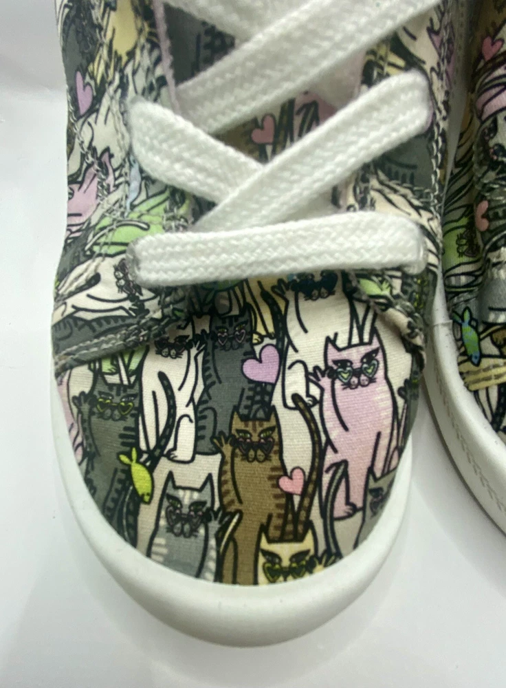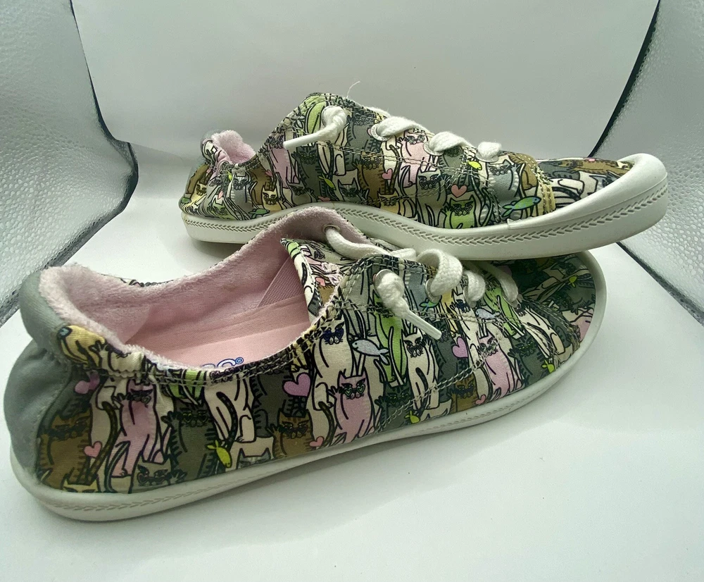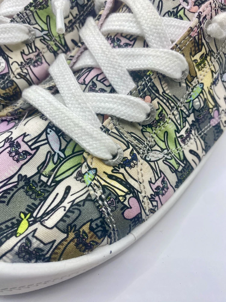 These Skechers Bobs Beach Bingo Kitten Bitten shoes are in good used condition. They are a very comfortable slip-on sneaker for women with a round toe shape and flat heel style. The shoe features a cute animal print pattern with cats and shoelaces accents. It is made with a fabric upper material, cushioned and breathable insole, and a rubber outsole for walking and school activities. The shoe is multicolored and available in US size 9, AU size 9, UK size 4, and EU size 37.