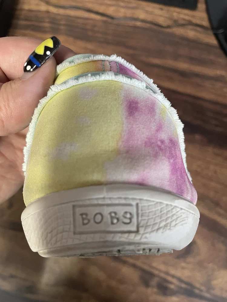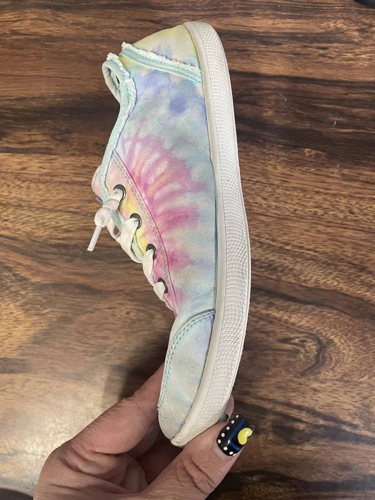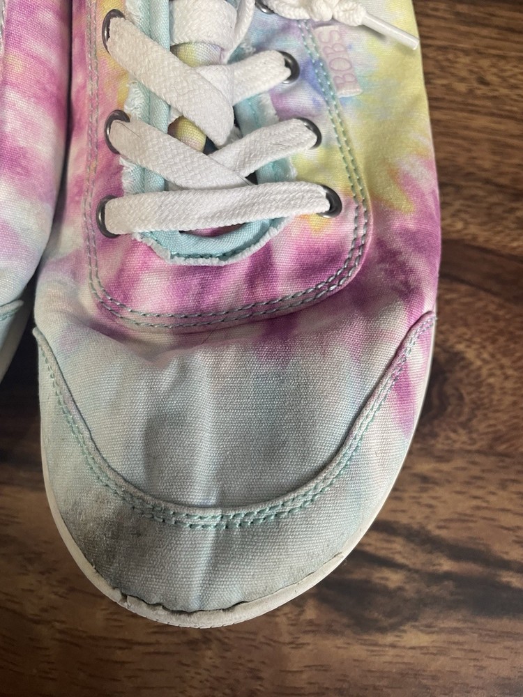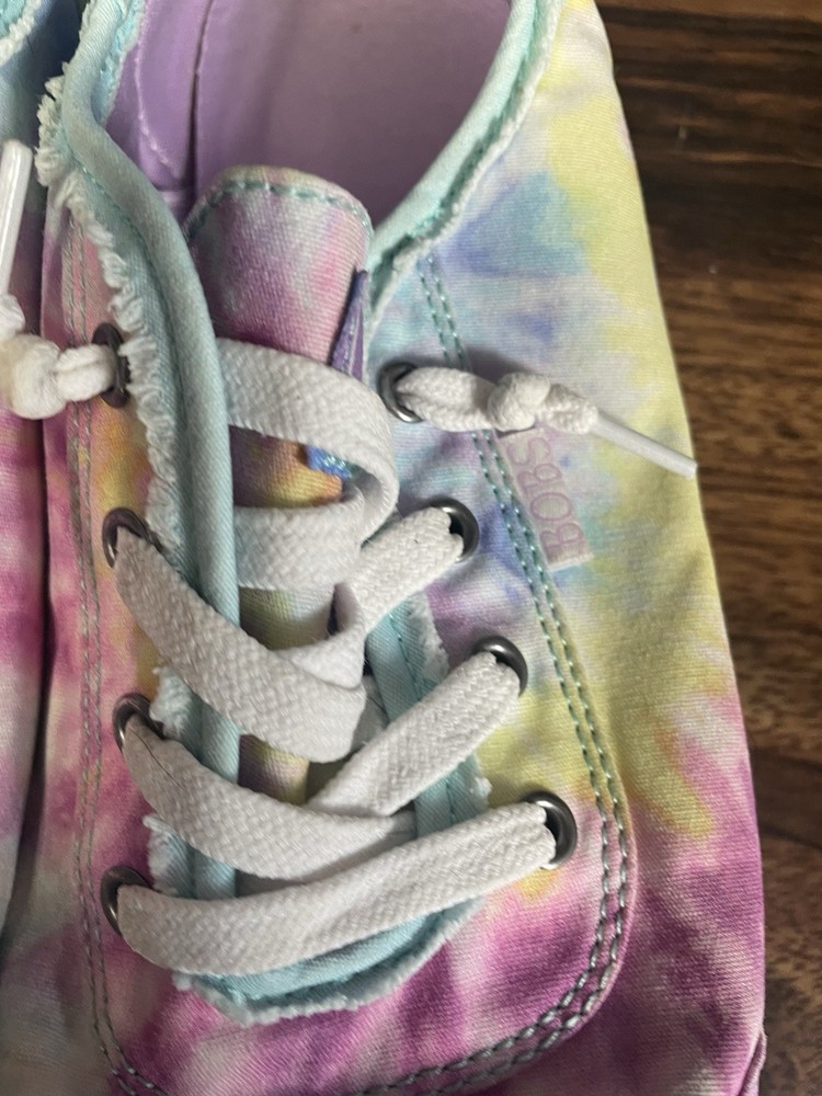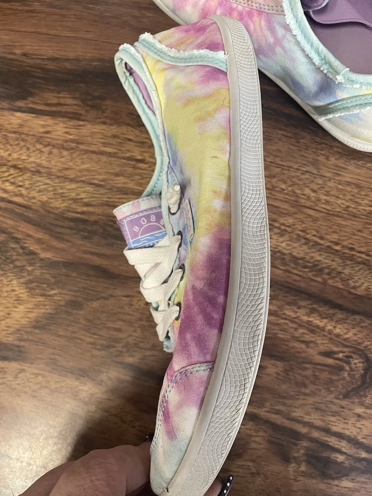 The Skechers Bobs Women's Size 8.5 Tie-Dye Sneakers with Memory Foam are a colorful and stylish pair of athletic shoes. Featuring a standard shoe width and synthetic upper material, these sneakers offer comfort and durability. The memory foam insole provides additional cushioning for all-day wear, while the tie-dye pattern adds a fun and vibrant touch. Perfect for adding a pop of color to your workout or casual outfit, these Skechers Bobs sneakers are a fashionable and functional choice for women looking for both style and comfort in their footwear. These shoes are lightly used with normal wear and tear.
