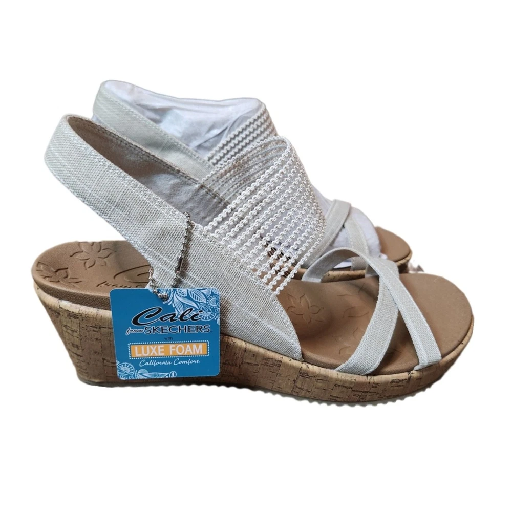 Cali from Skechers Luxe Foam Beverlee High Tea Sandals US size 11 Euro 41 natural color clean soles, with original box Please go by the photos and typed description (not auto fill) for item details. Any questions, just ask!