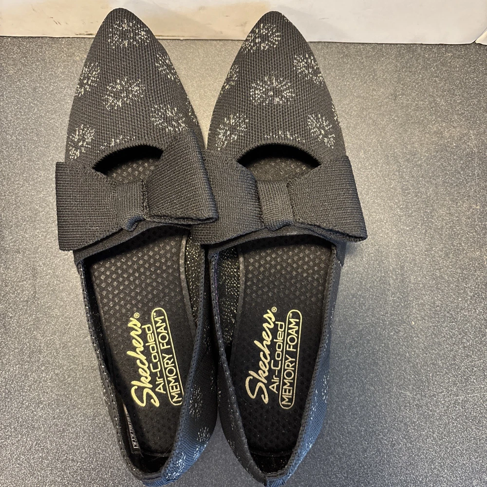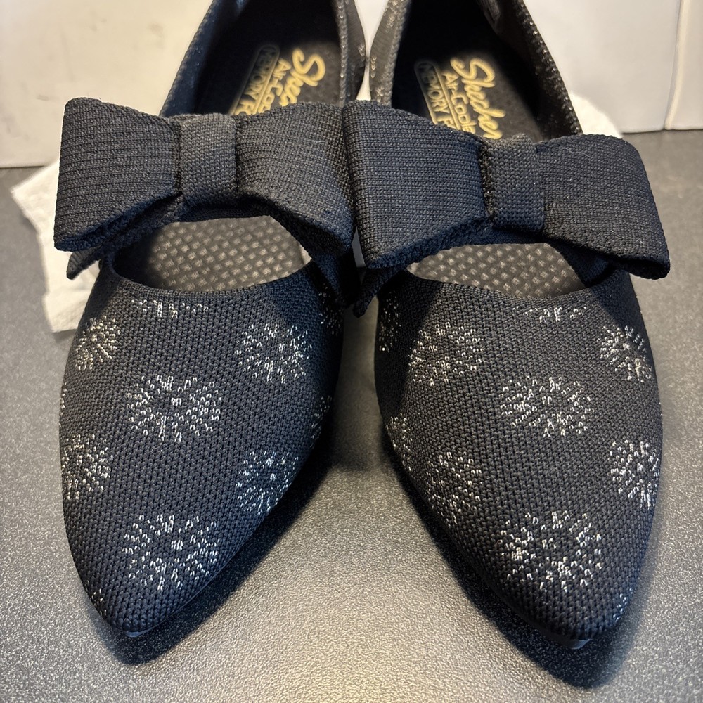 The Skechers Cleo Point-Feel Good Stretch Fit Knit Sparkle Flats in Black are a comfortable and stylish choice for women. These slip-on flats feature a knit fabric upper with a rubber outsole for durability. The bow accent adds a touch of elegance, while the memory foam insole provides added comfort. Perfect for casual outings, these flats are easy to wear and perfect for the summer, fall, and spring seasons. Made by the brand Skechers, these flats combine style and functionality for the modern woman.