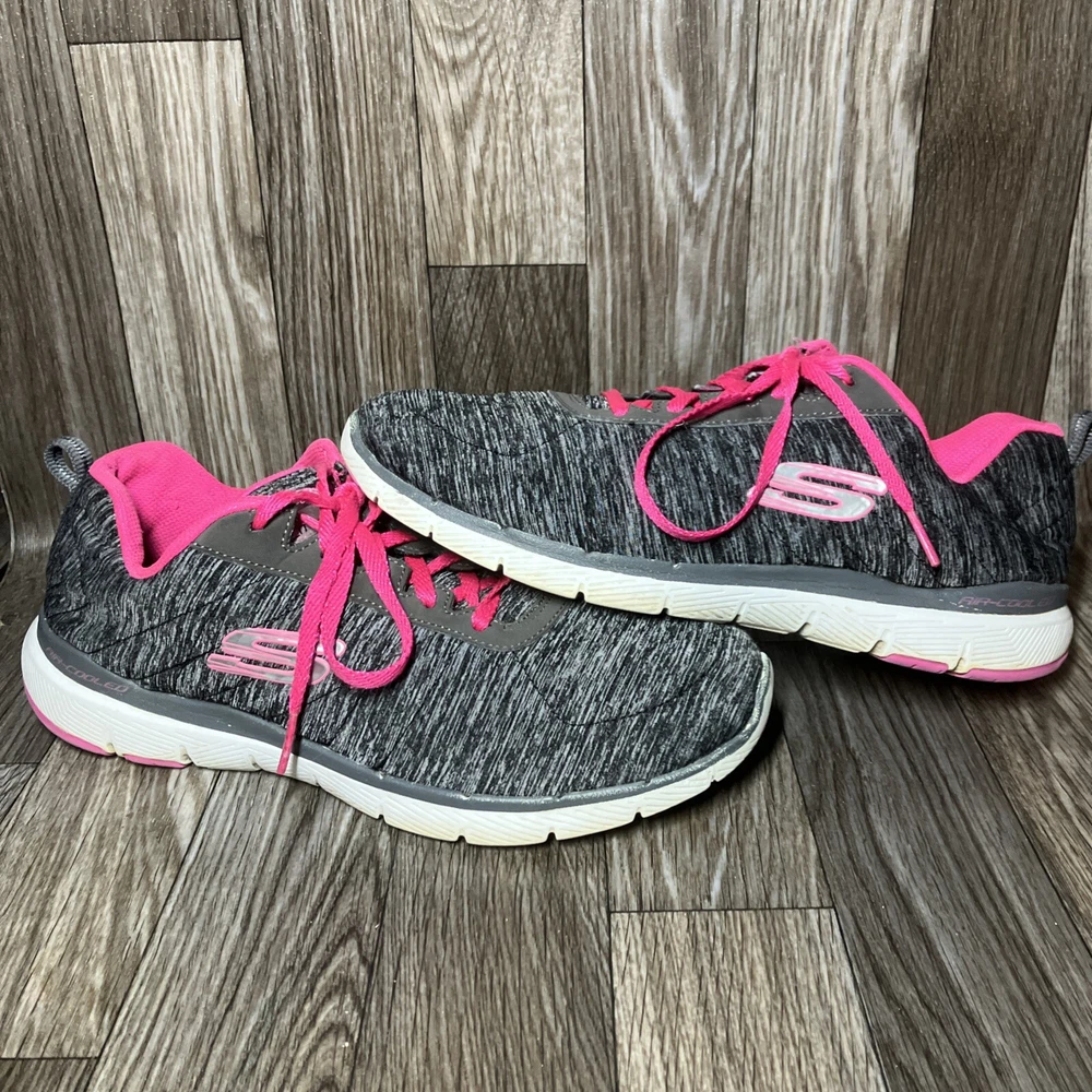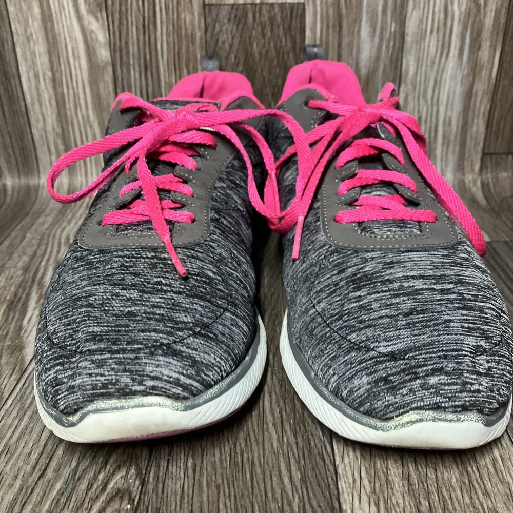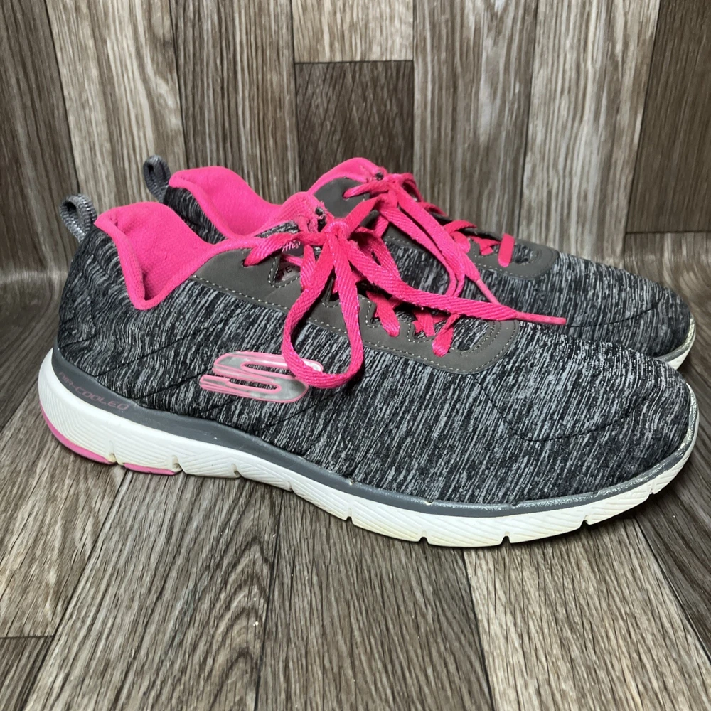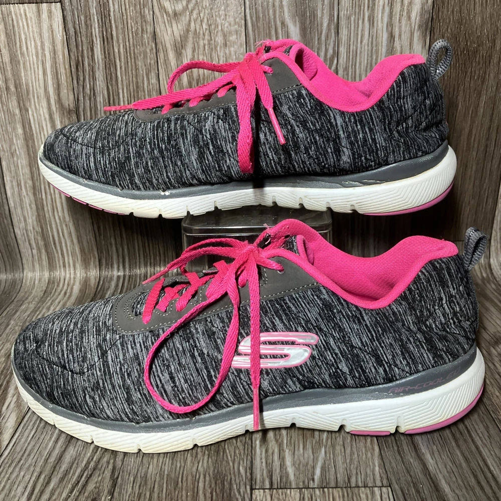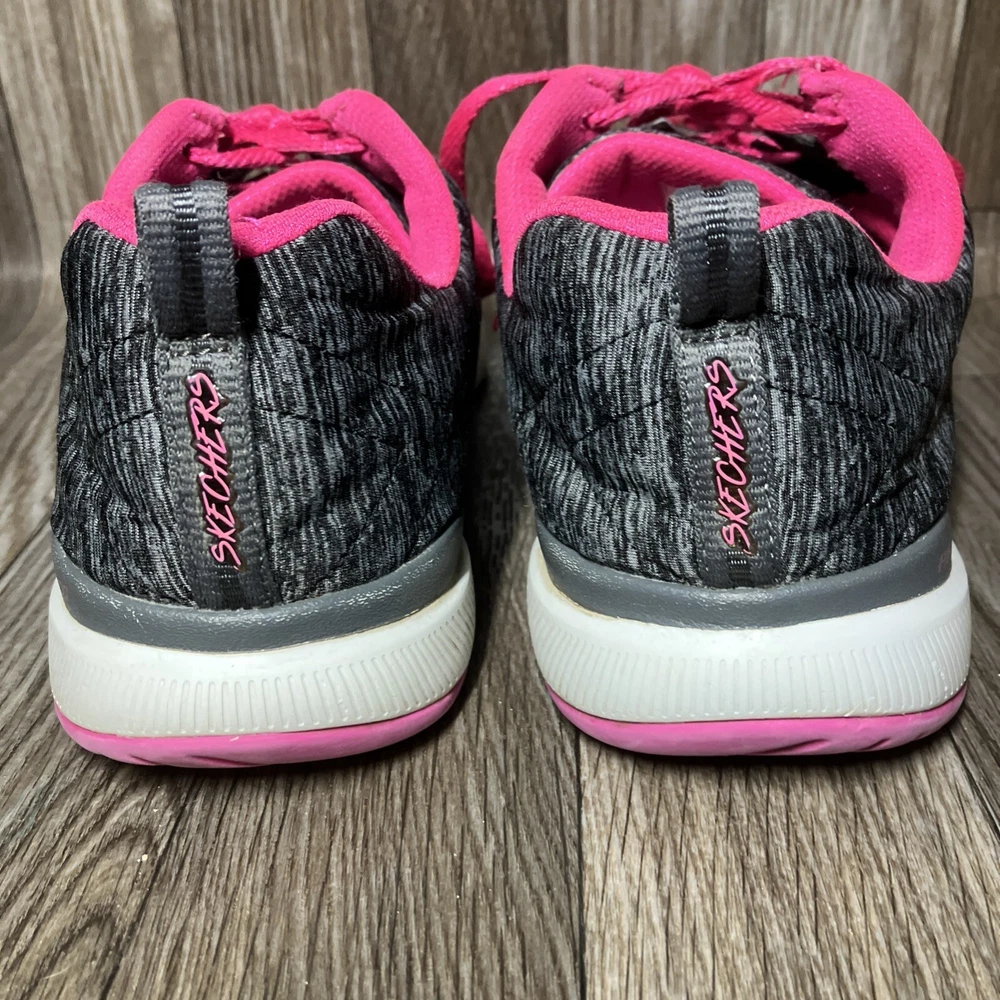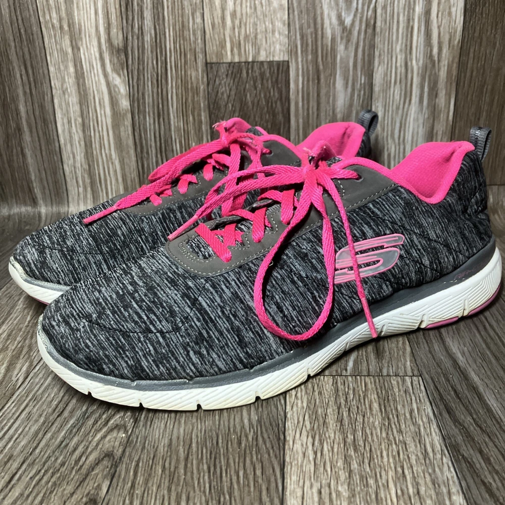 The Skechers Flex Appeal 3.0 13067 Running Shoes are a stylish and colorful athletic sneaker designed for women. Featuring a black and hot pink color combination with lace-up closure, these sneakers offer comfort with a foam insole and rubber outsole for walking or sports activities. The low-top shoe has a synthetic upper material with a blended fabric construction and a logo accent. This model was manufactured in 2018 and released in 2019, making it a trendy and sporty choice for those looking for both style and functionality in their footwear.