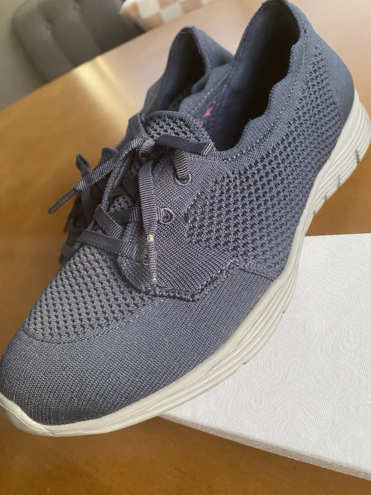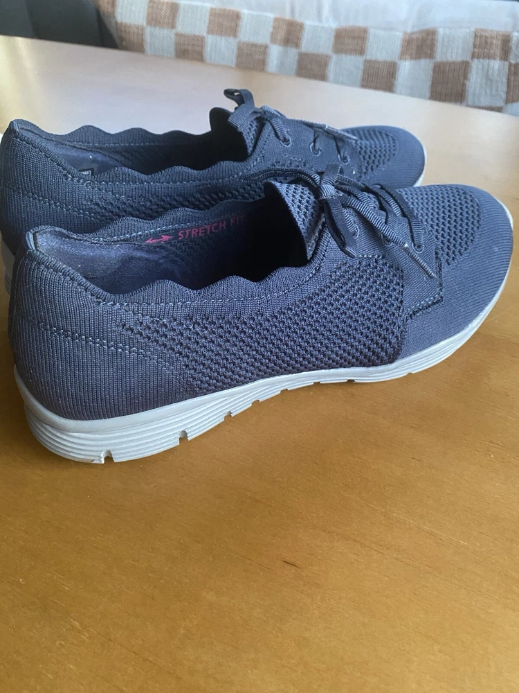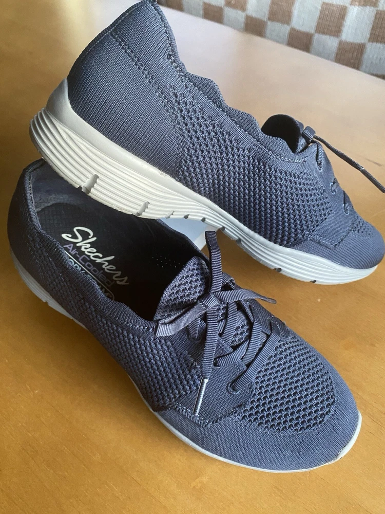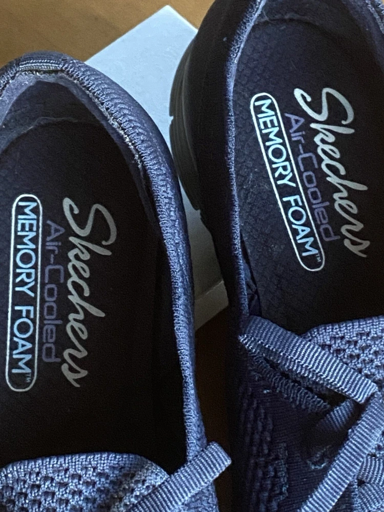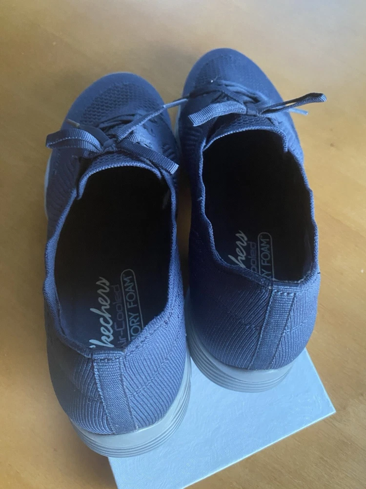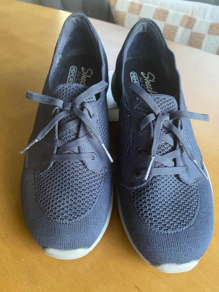 Like NEW Most excellent condition. The Sketchers Air Cooled Memory Foam Knit Sneakers in navy blue are designed for women in size 8. These athletic sneakers feature a breathable mesh knitted upper material and are equipped with memory foam for added comfort. The shoes are part of the Skechers Memory Foam product line, offering a stylish and functional sneaker option that can be easily washed to maintain freshness.