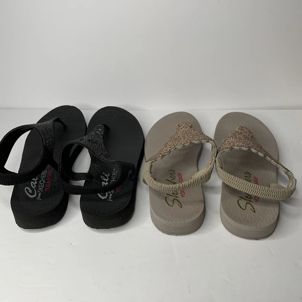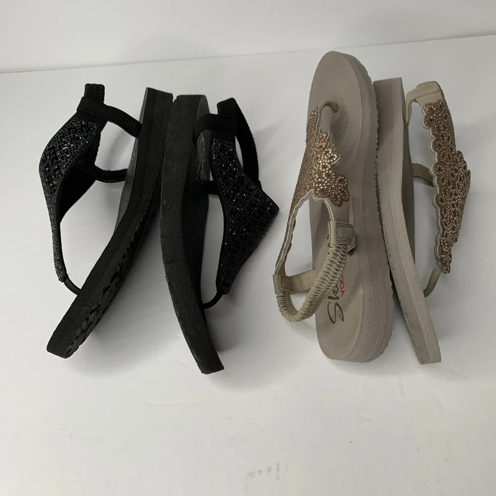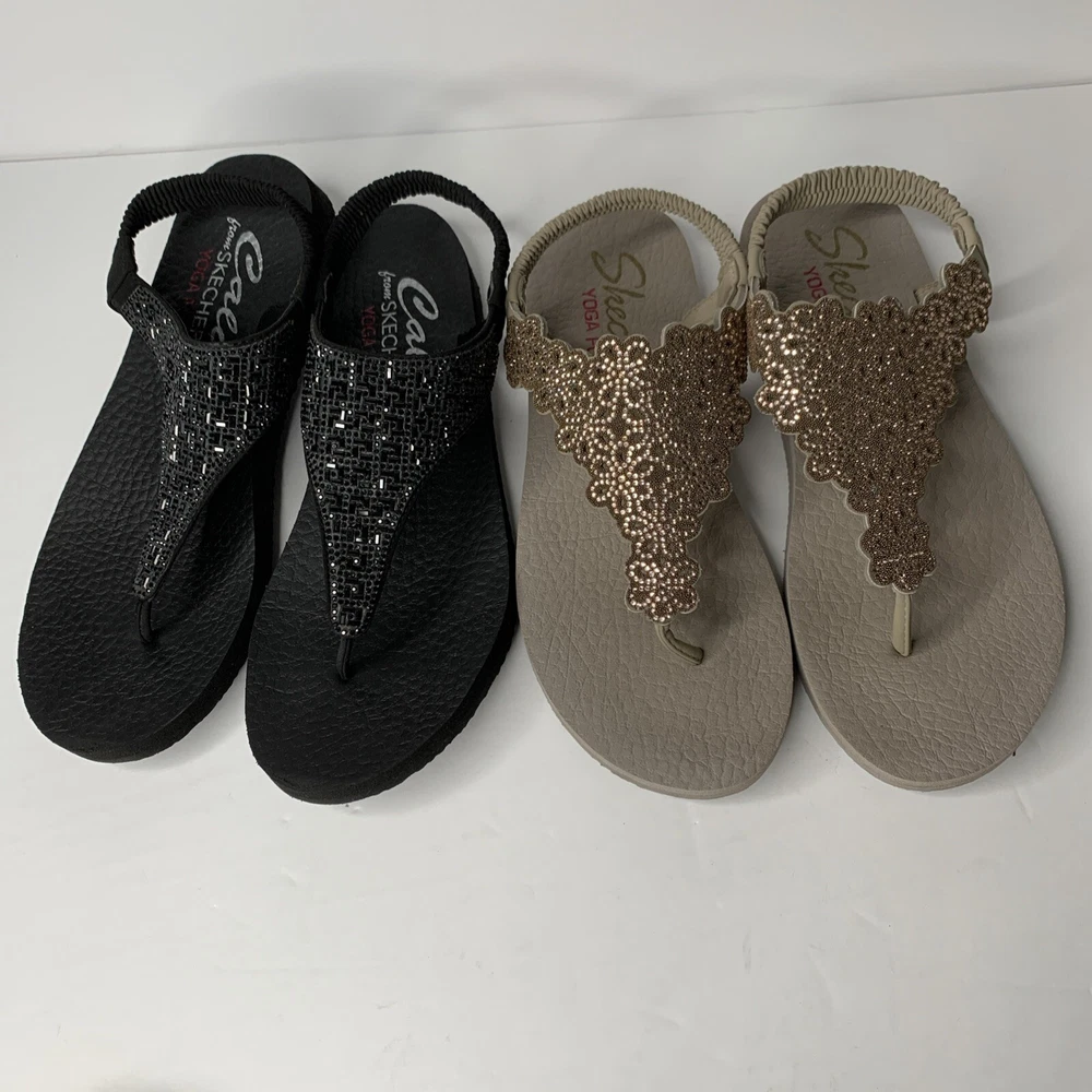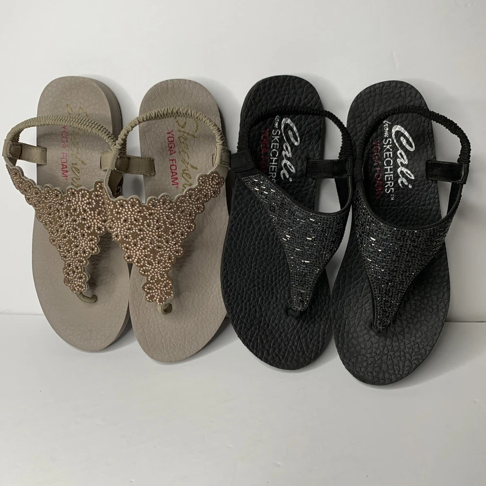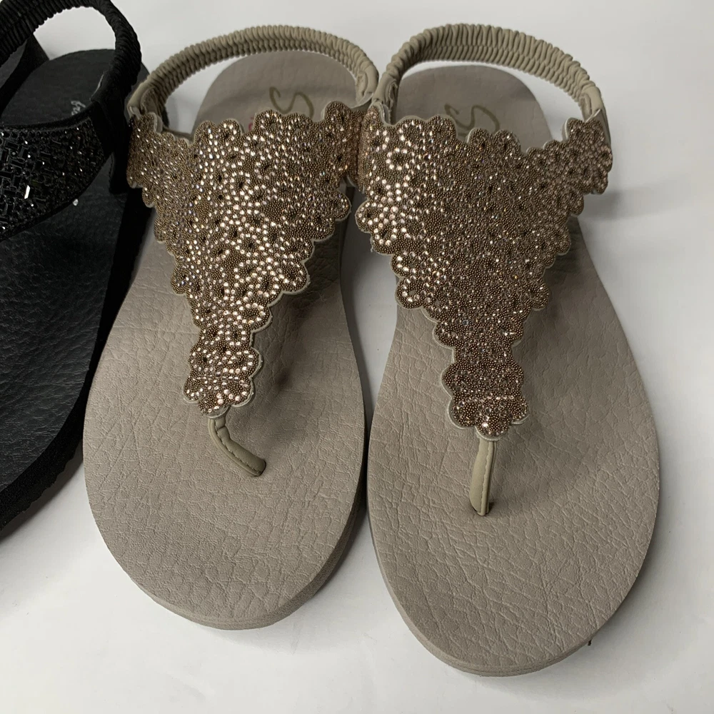 This product is a set of two Skechers sandals in black and rose gold, featuring a comfortable Yoga Foam insole. They are slip-on style slingback sandals with rhinestone accents and the Skechers logo. The sandals have a flat heel under 1 inch, making them suitable for casual wear, travel, and parties. They are lightweight, cushioned, and breathable, perfect for summer, fall, and spring seasons.