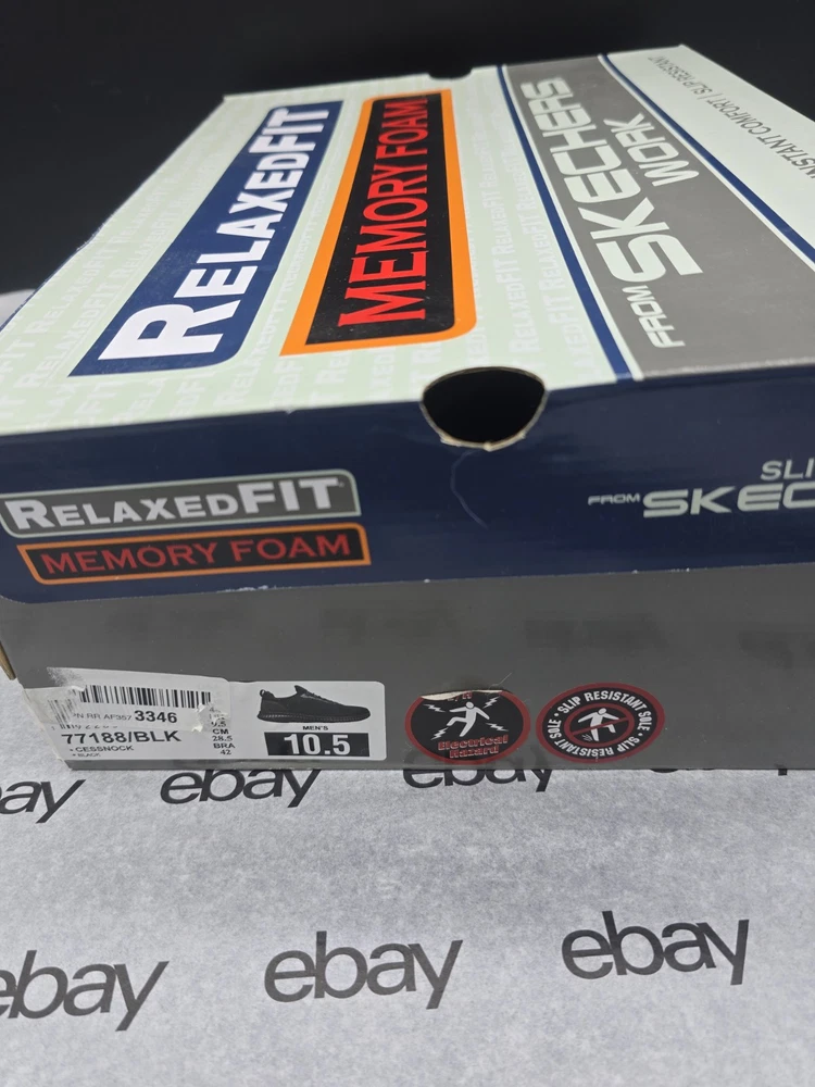 New With Box. Have Been Tried On. Skechers Relaxed Fit Cessnock Model: 77188/BLK Size: 10.5 UK: 9.5 EU: 44 Black If you have any questions or want more pics, please ask.