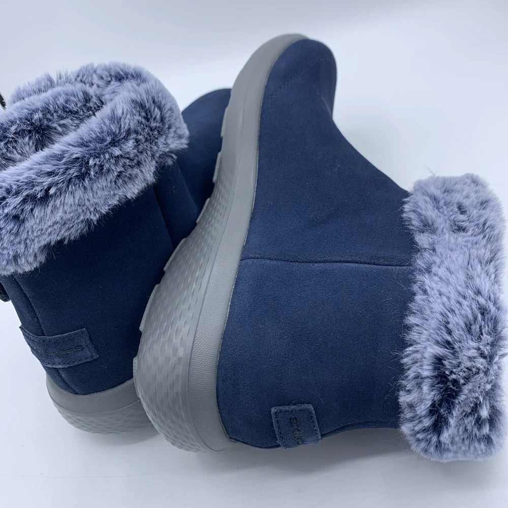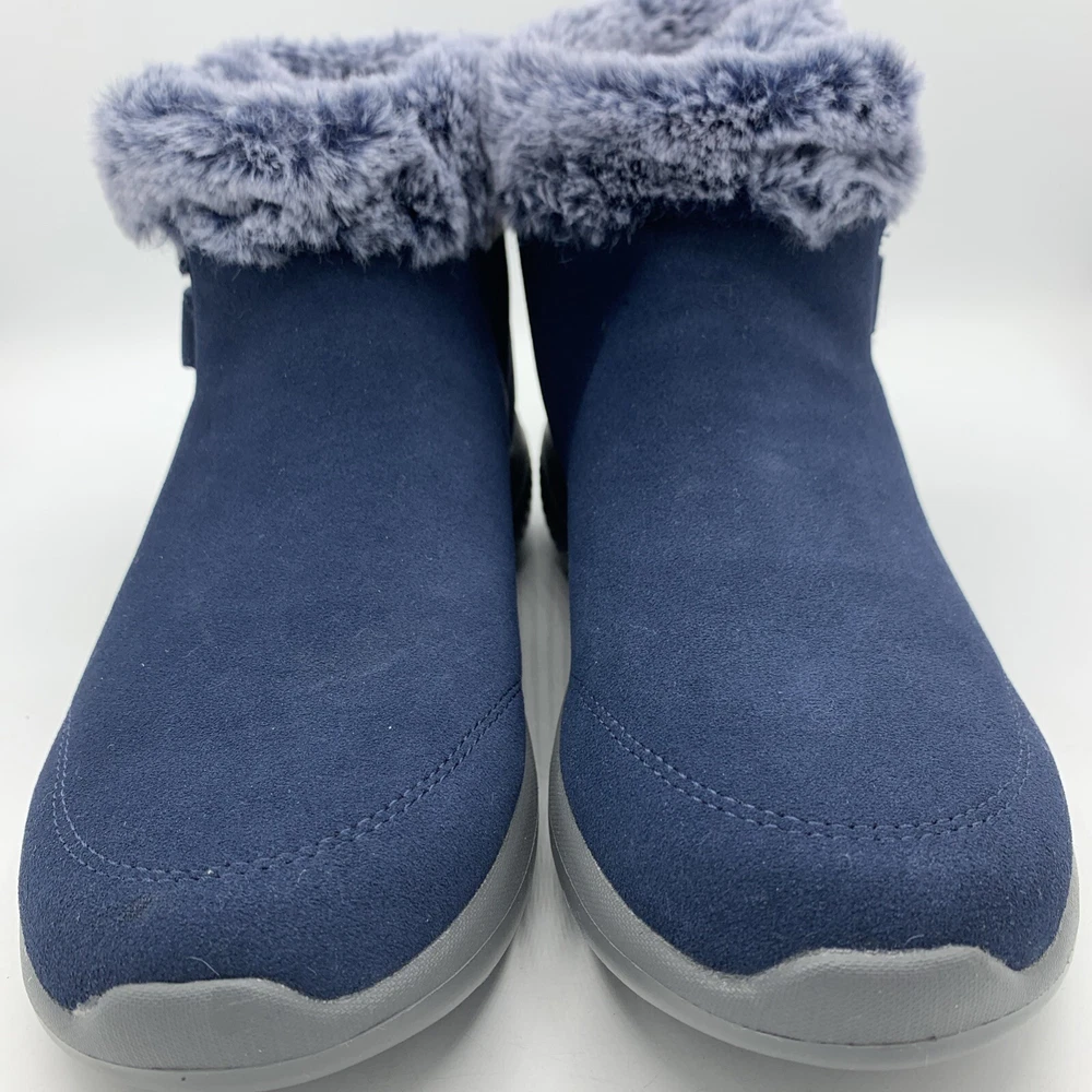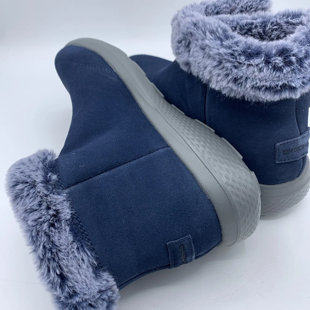 Elevate your style with these Skechers On the GO City Blue Suede Women's Ankle Boots. The faux fur trim and logo accents add a touch of elegance to the slip-on design. The round toe shape and hook & loop closure provide a comfortable fit, while the synthetic outsole material and foam insole offer durability and support. These boots are perfect for casual occasions during the winter and fall seasons. The solid blue color and city theme make them a versatile addition to any wardrobe. Available in women's size 8.5 with a low heel style, these boots are a great choice for those looking for comfort and style.
