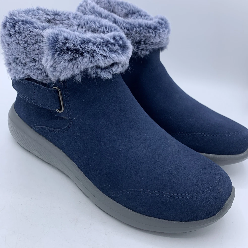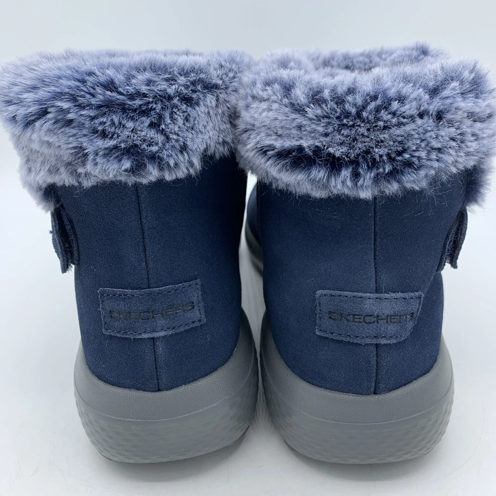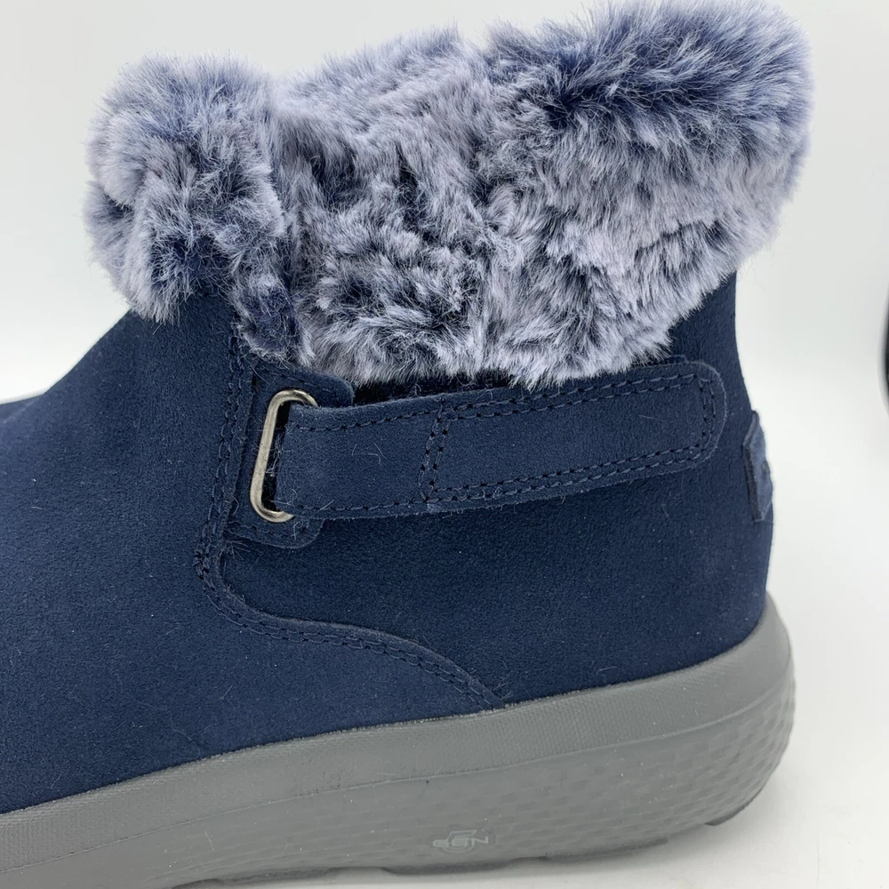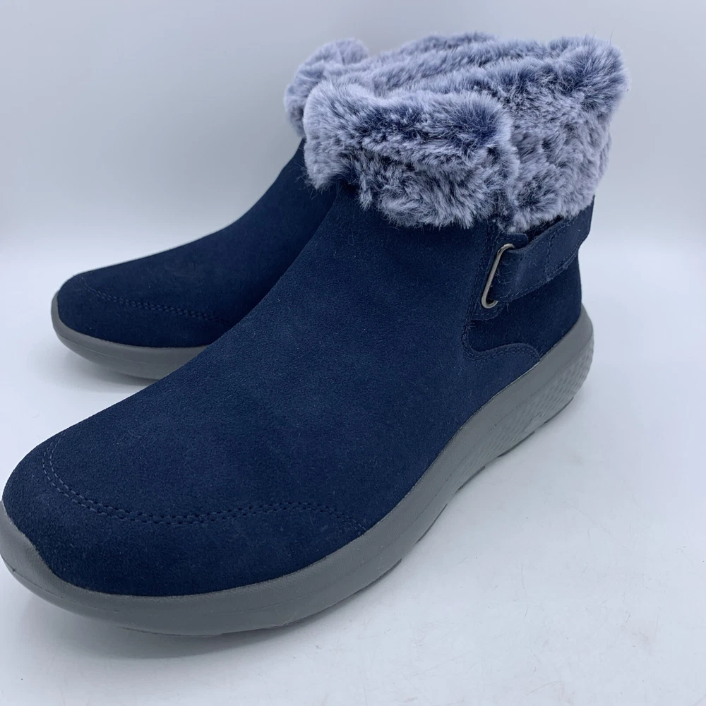 Elevate your style with these Skechers On the GO City Blue Suede Women's Ankle Boots. The faux fur trim and logo accents add a touch of elegance to the slip-on design. The round toe shape and hook & loop closure provide a comfortable fit, while the synthetic outsole material and foam insole offer durability and support. These boots are perfect for casual occasions during the winter and fall seasons. The solid blue color and city theme make them a versatile addition to any wardrobe. Available in women's size 8.5 with a low heel style, these boots are a great choice for those looking for comfort and style.