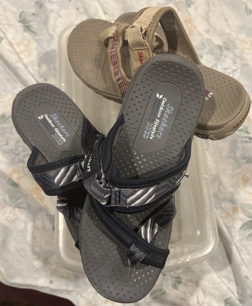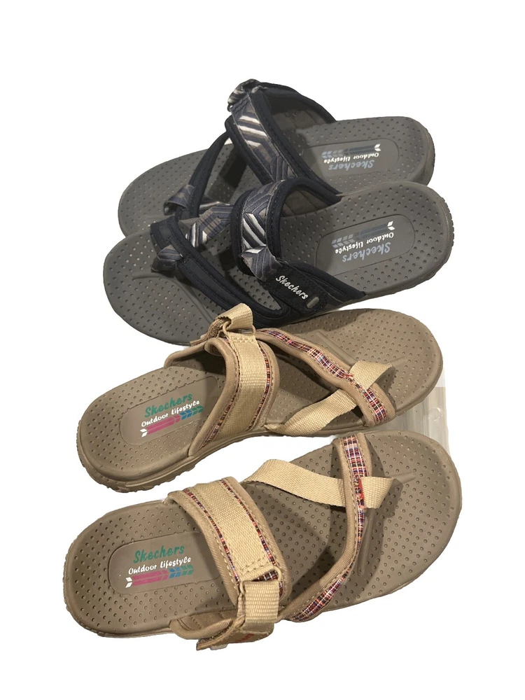 Elevate your style with this lot of two Skechers Reggae Perfect Planning slides sandals in blue and tan. These sandals are perfect for women who want to add a touch of sophistication to their wardrobe. The synthetic upper material ensures durability and comfort, while the slide style makes them easy to wear and take off. The sandals come in a UK shoe size 3 and US shoe size 6, making them a perfect fit for those sizes. The brand is Skechers, a well-known and trusted name in the shoe industry. These sandals are ideal for any occasion, whether it's a day out with friends or a formal event. Add these Skechers Reggae Perfect Planning slides sandals to your shoe collection today!