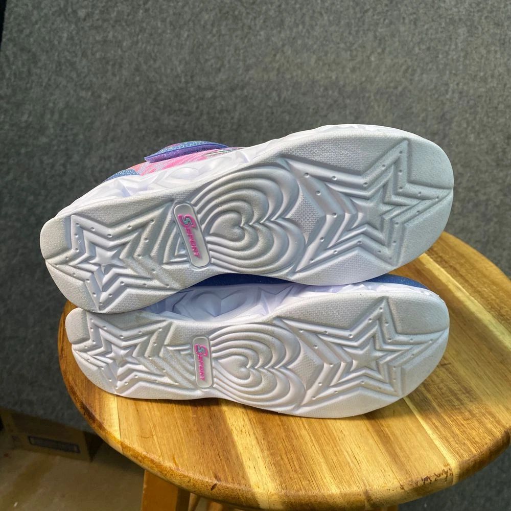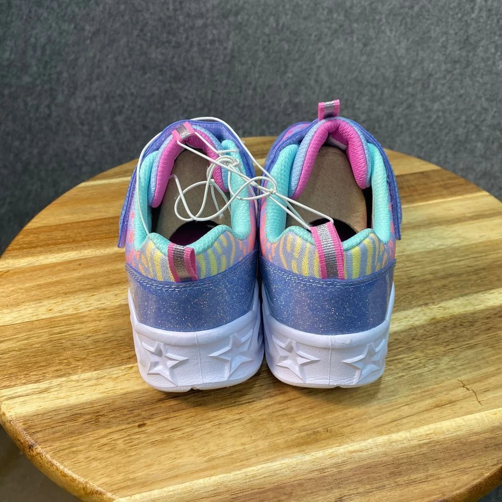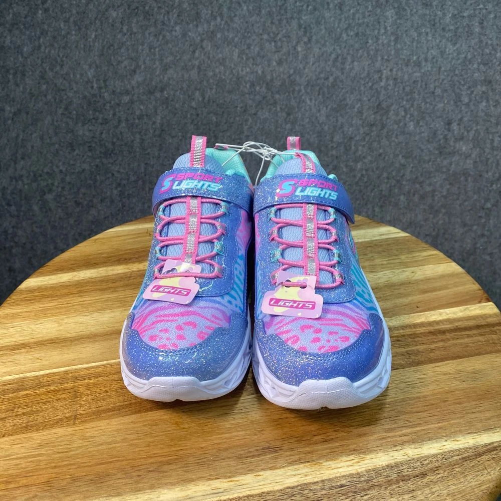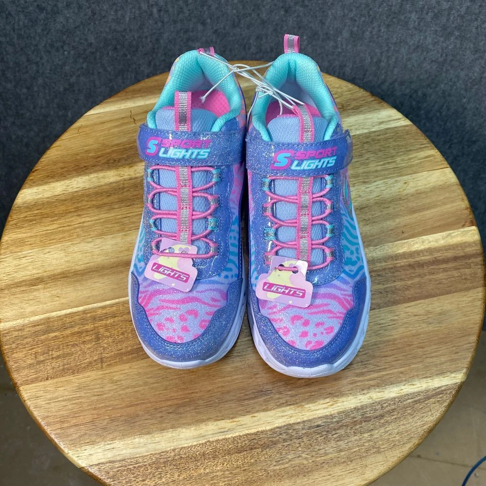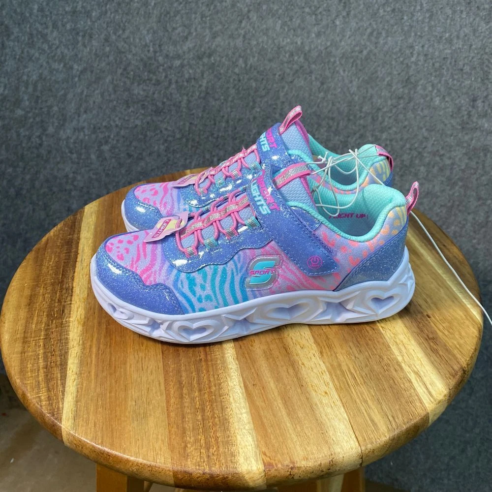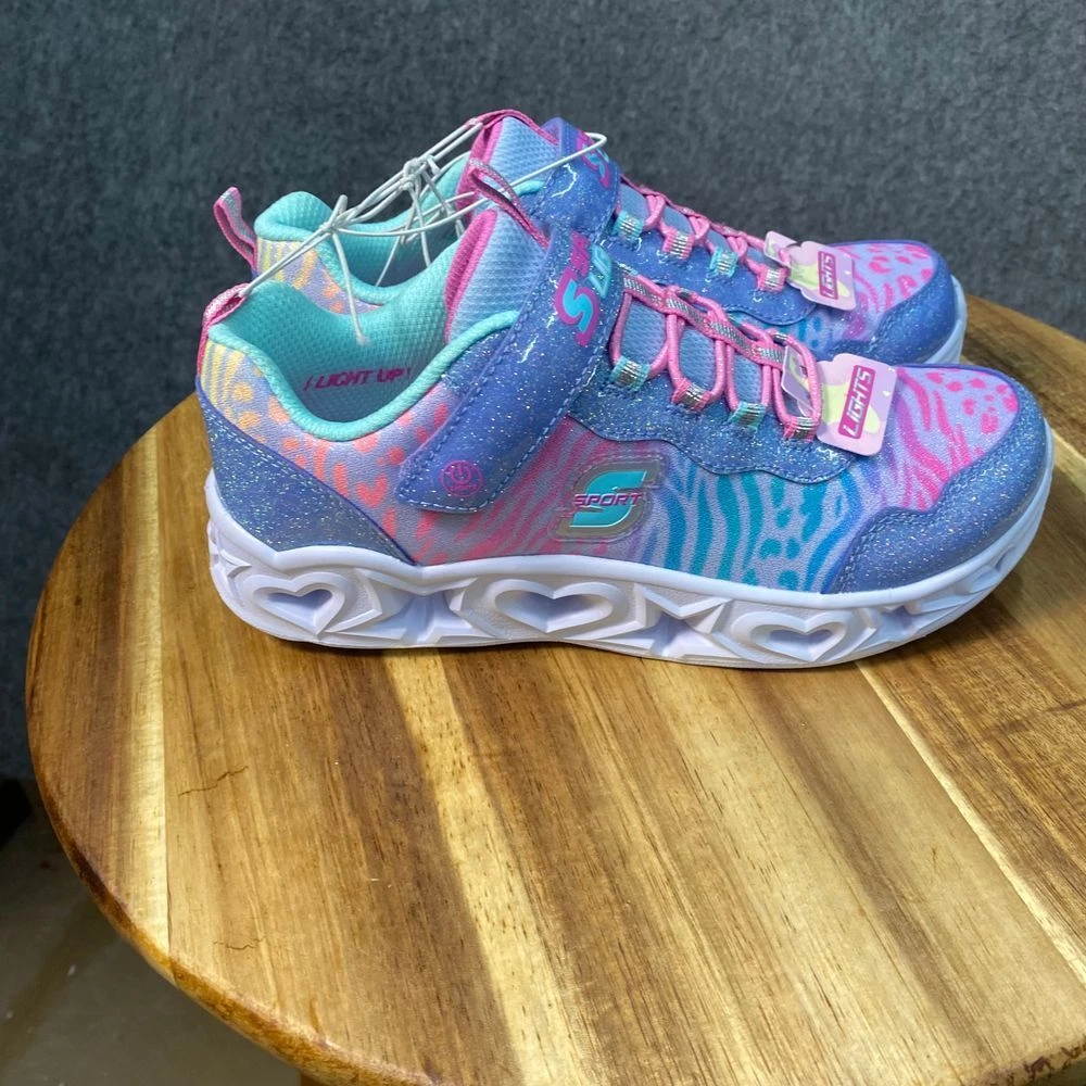 Skechers light-up sneakers featuring glitter details, heart-patterned soles, and zebra print design. Hook-and-loop strap with lace-up closure. Mint interior. Color: Multicolor Department: Girls Style: Light-Up Glitter Sneaker Type: Athletic Heel Height: Flat (Under 1 in) Model: Skechers S Lights Heart Lights Upper Material: Polyester Keywords: skechers, s lights, light up shoes, girls sneakers, glitter shoes, heart sole, zebra print, athletic shoes, kids shoes, hook and loop, sparkle sneakers See pictures for details and measurements. Thanks for shopping by! *Reasonable offers accepted. * Same or next day shipping. *Bundle to save more * All used items are cleaned, washed, and/or thoroughly steamed before listing. *Clothing may acquire wrinkles during storage and or shipping.