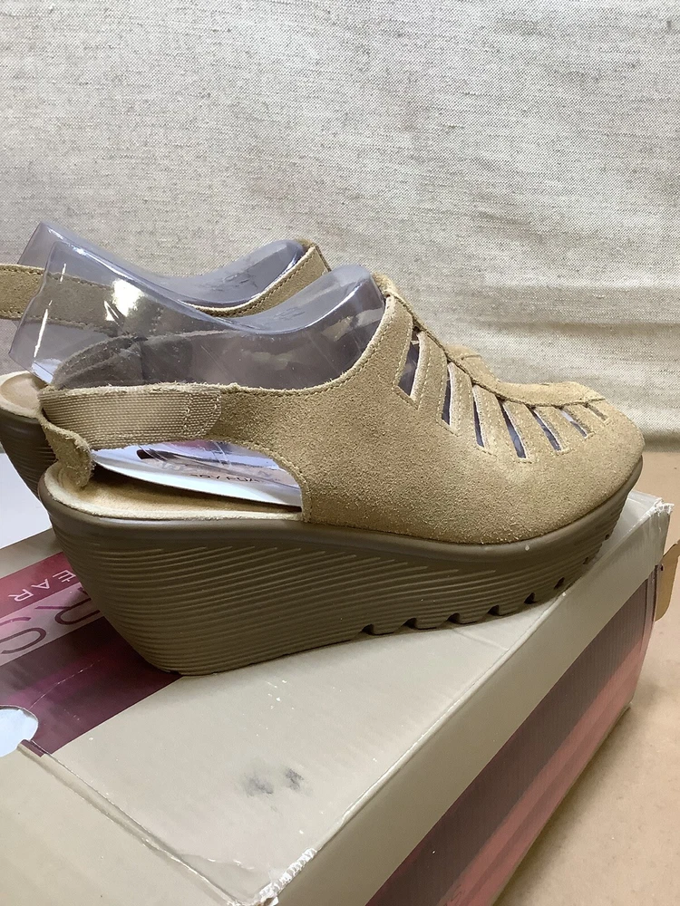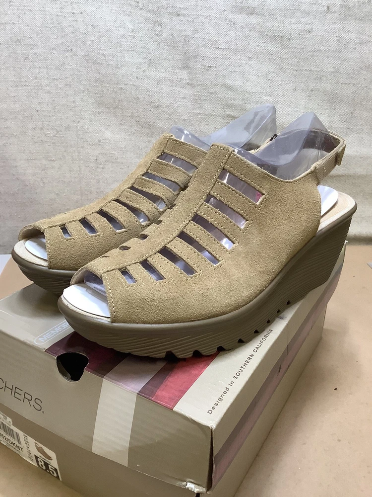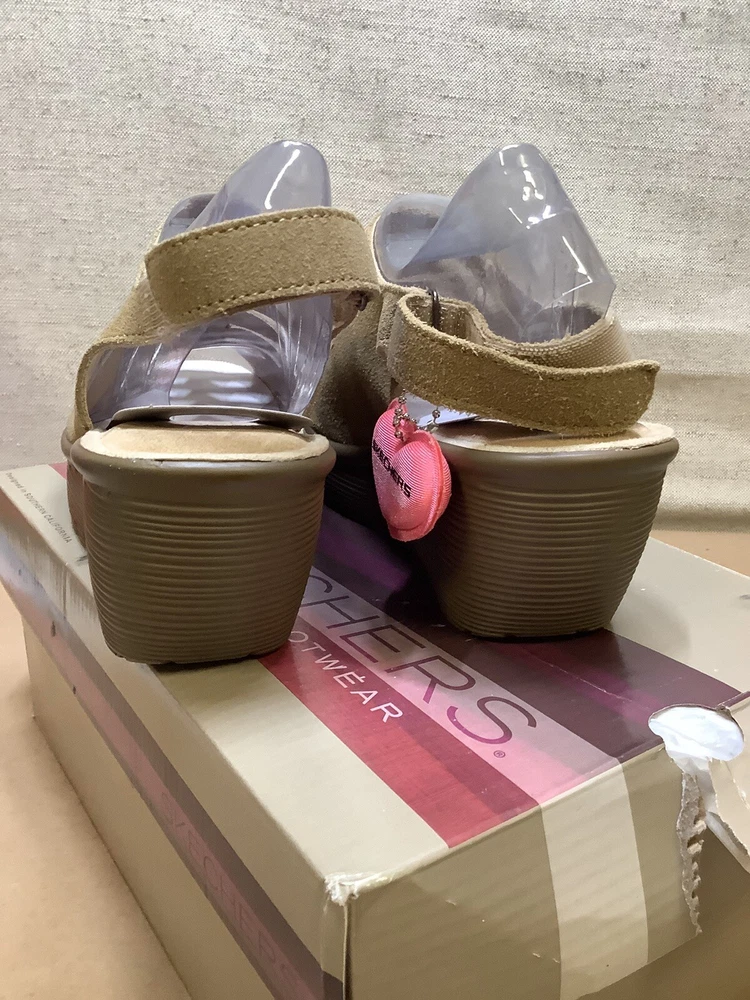 Skechers Sandals Wm 8.5 Parallel Trapezoid Wedge Heel Beige tan Suede Slingback