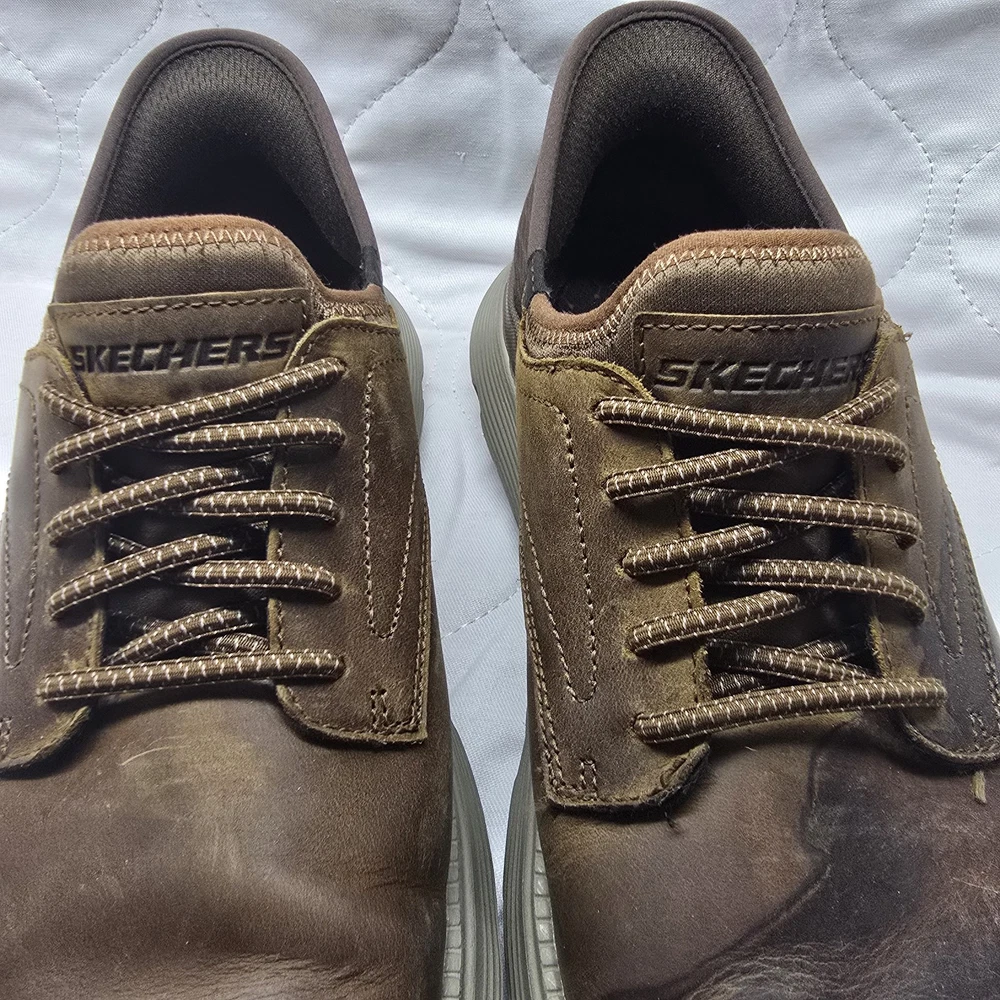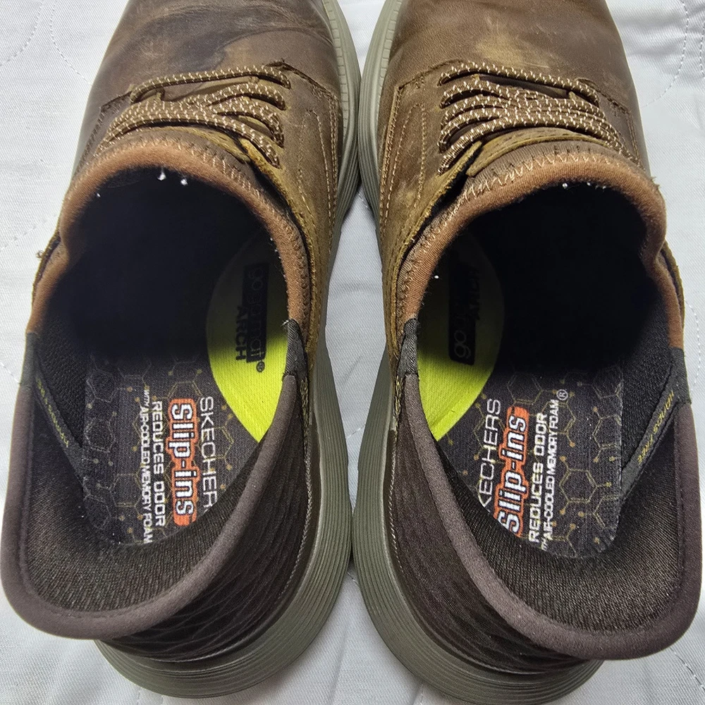 Product Line: Skechers Slip Ins Upper Material: Leather Department: Men Brand: Skechers Style: Sneaker Outsole Material: Rubber Color: Brown Vintage: No US Shoe Size: 9.5 Features: Lightweight, Flexible, Hands Free Slip In, Air Cooled Memory Foam, Goga Mat Arch Cushioning, Charcoal Infused Insole Neutralizes Odor UK Shoe Size: 9.5 Pattern: Solid Insole Material: Foam Type: Casual Customized: No Model: Skechers Slip Ins Garza Gervin Closure: Slip On