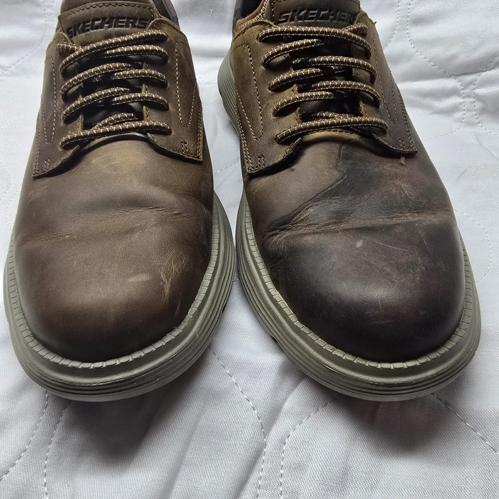 See Photos preowned condition Has signs of been warn. See shoe color. Excellent Condition inside & soles. The Skechers Slip Ins Garza Gervin Men's Sneakers in Brown, size 9.5W, are a casual slip-on shoe featuring a solid pattern and a comfortable wide fit. Made with leather upper material and a rubber outsole, these sneakers have a hands-free slip-in design and a charcoal-infused insole for odor control. They also include Air Cooled Memory Foam and Goga Mat Arch Cushioning for added comfort, making them lightweight and flexible for everyday wear. The Skechers Slip Ins Garza Gervin sneakers offer both style and function for men looking for a convenient and comfortable footwear option.