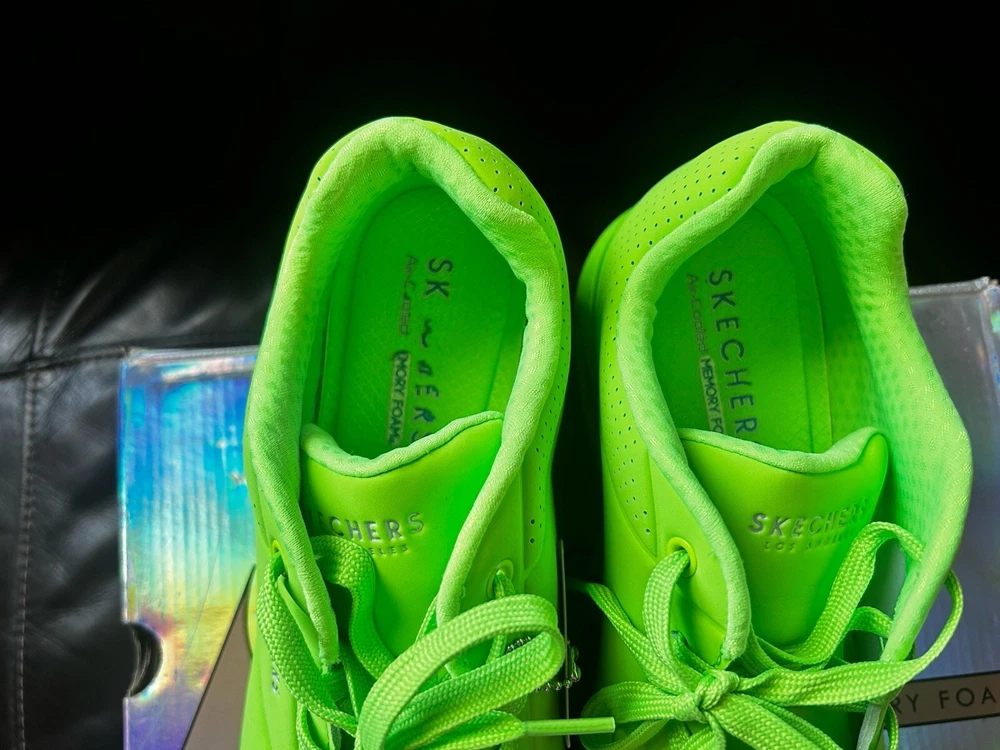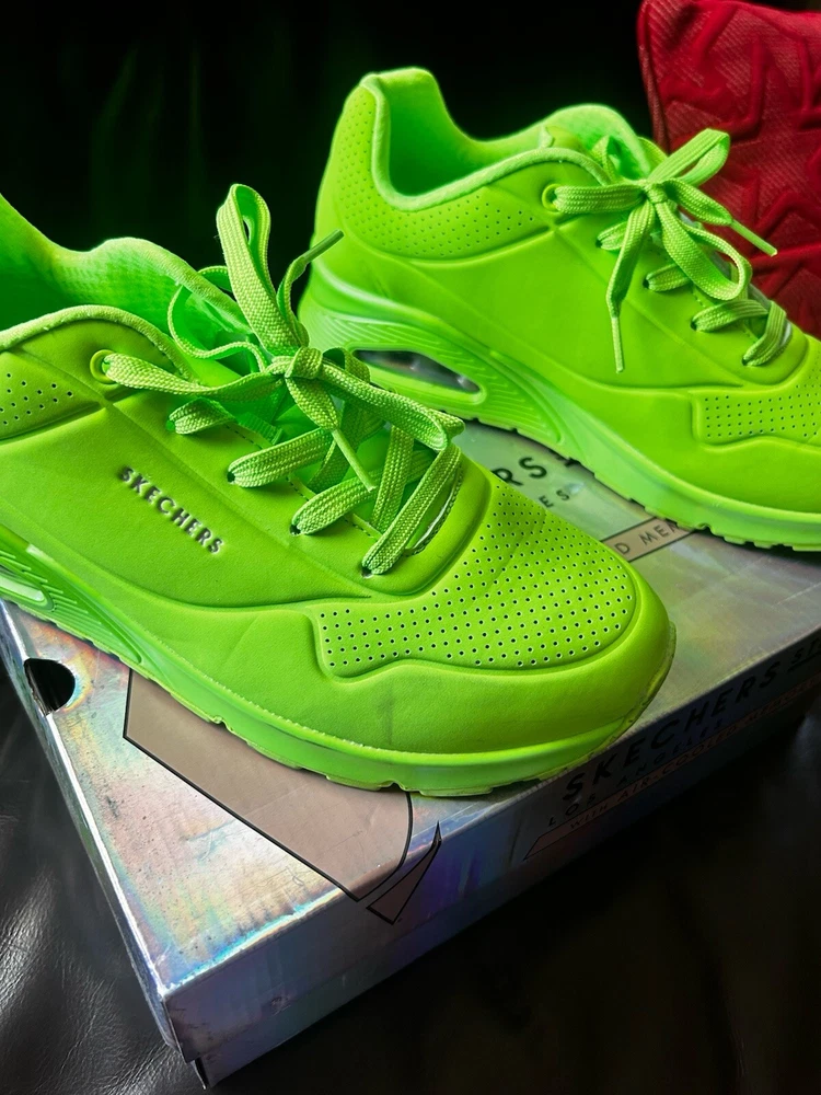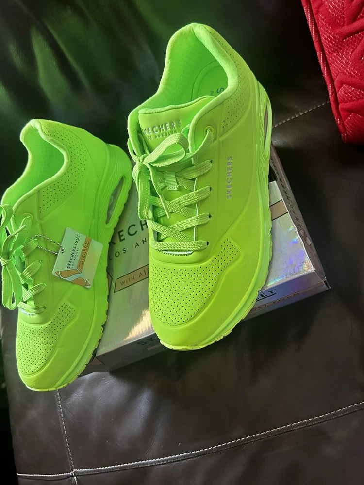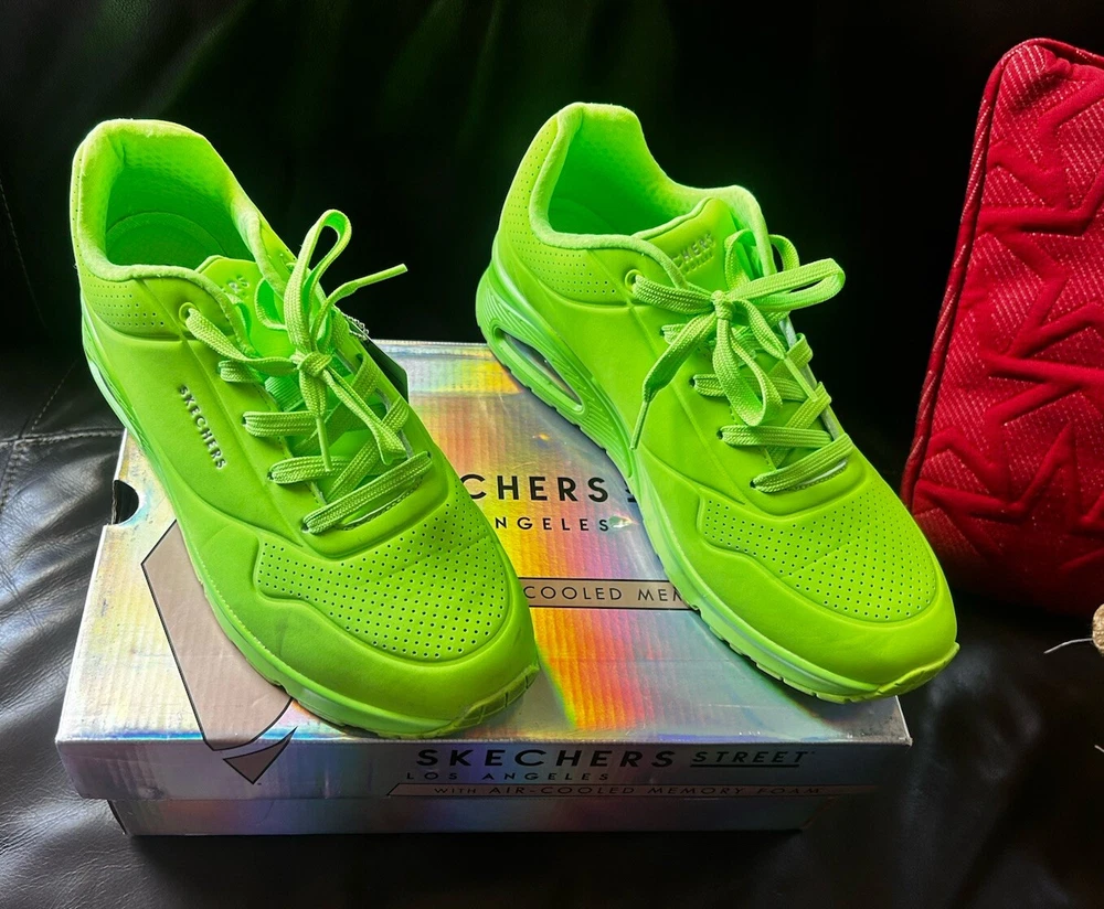 Skechers Street Los Angeles is a women's athletic sneaker made by the brand Skechers. It features a lime and green design with the Skechers logo as an accent. The shoe has a lace-up closure and is made with synthetic materials. It is designed for walking and is available in size 11 for the US, 8 for the UK, and 41 for the EU. The shoe is part of the Skechers Street product line and was made in China. used only twice but in Amazing Shape Sold as is No Return. Air Cool Memory Foam