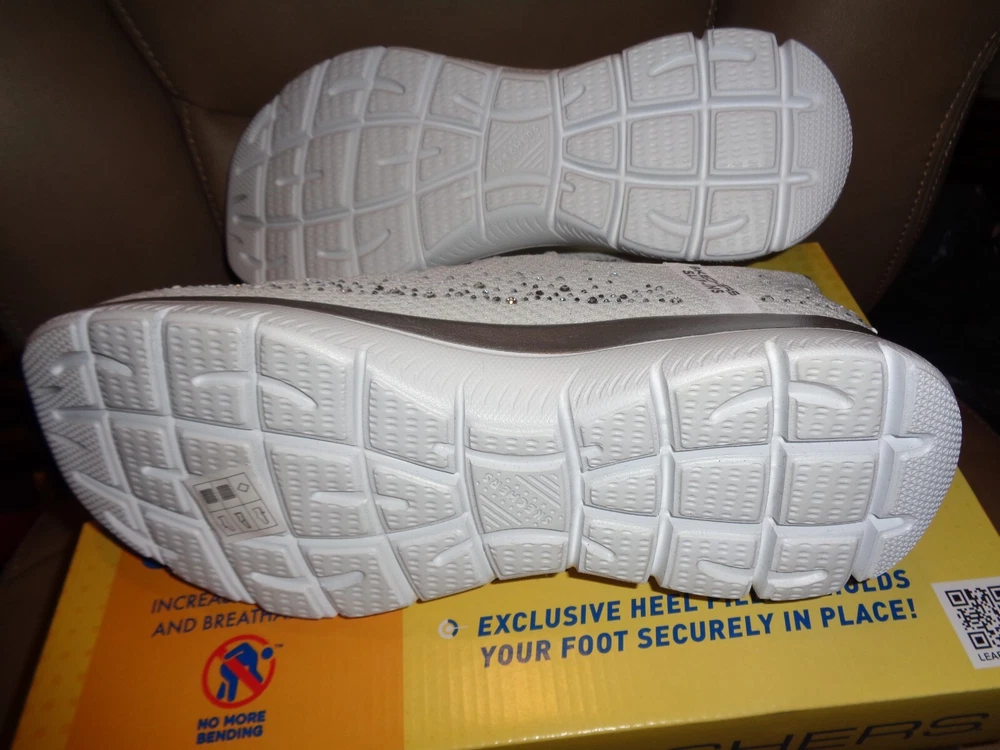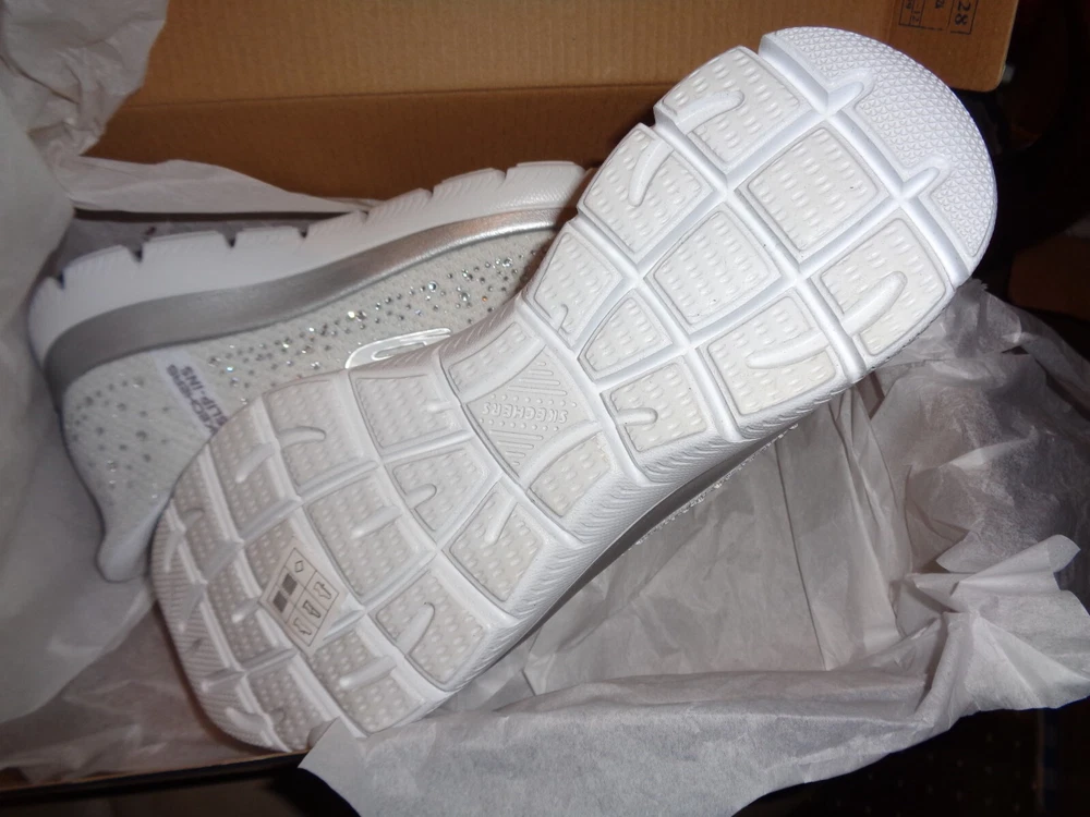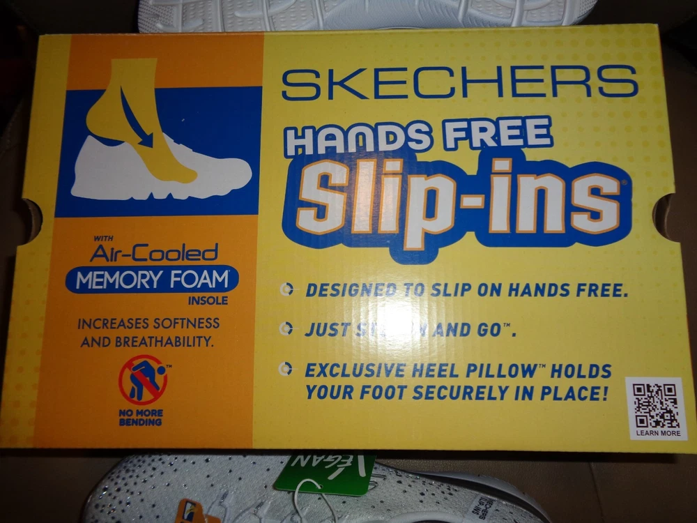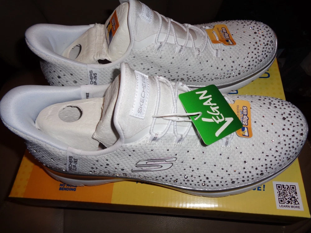 Pick up the pace with increased ease-of-wear and platinum comfort wearing these Skechers Hands Free Slip-ins®: Summits shoes. Size 10 Medium and NEW in Box!! Very hard to find!! FEATURES Rhinestone Mesh with Bungee lace upper Slip-Ins Skechers Hands Free Slip-ins for an easy fit Exclusive Heel Pillow holds your foot securely in place Lightweight shock-absorbing midsole Skechers Air-Cooled Memory Foam® cushioned comfort insole Flexible traction outsole Crafted with 100% vegan materials DETAILS Mesh upper Polyester lining Rubber outsole Round toe Elastic closure Foam footbed Treaded outsole 1.25-in. heel height Spot clean Any questions? Please ask!! sizing SKECHERS Size Chart Skechers Women's Shoe Size Chart US Size Euro Size Inches Centimeters 5 35 8.86 22 5.5 35.5 8.85 22.5 6 36 9.05 23 6.5 36.5 9.25 23.5 7 37 9.44 24 7.5 37.5 9.64 24.5 8 38 9.84 25 8.5 38.5 10.03 25.5 9 39 10.23 26 9.5 39.5 10.43 26.5 10 40 10.62 27 10.5 40.5 10.82 27.5 11 41 11.02 28 Size chart is a general guide. It may include sizes t Carousel