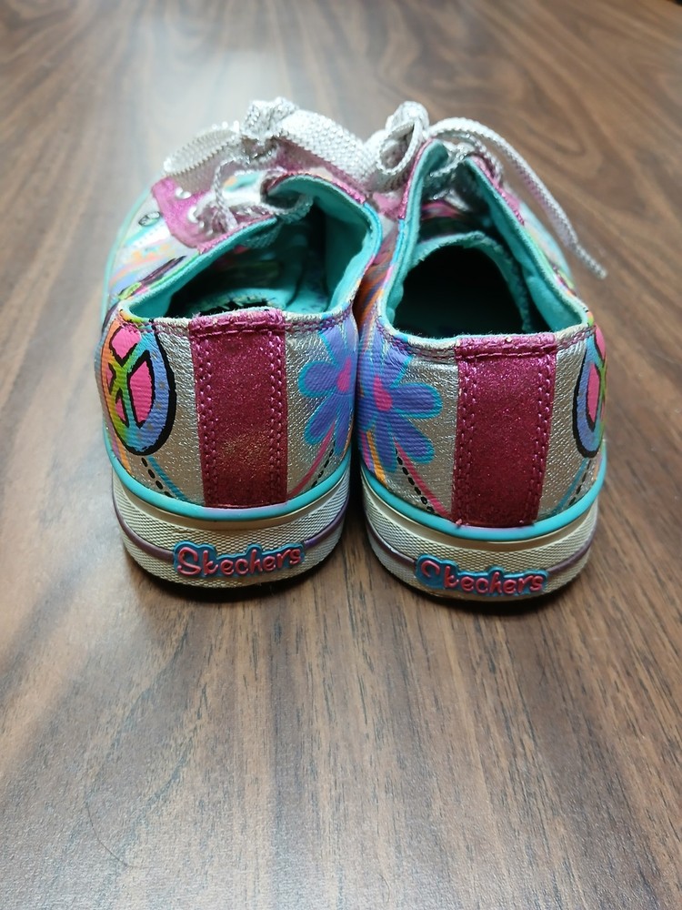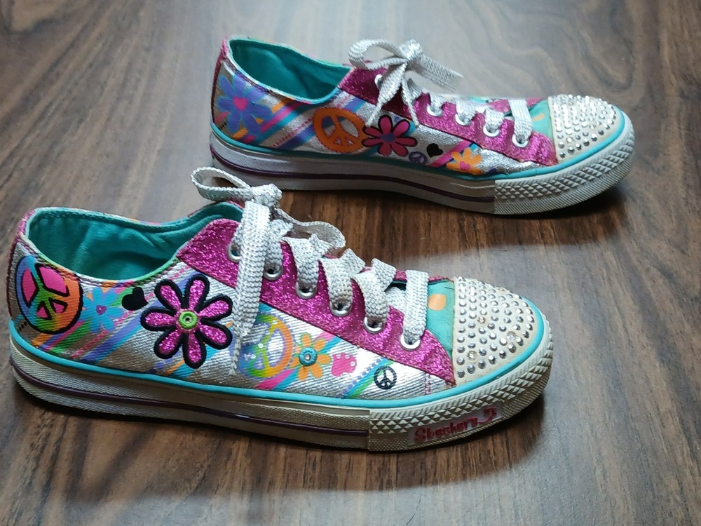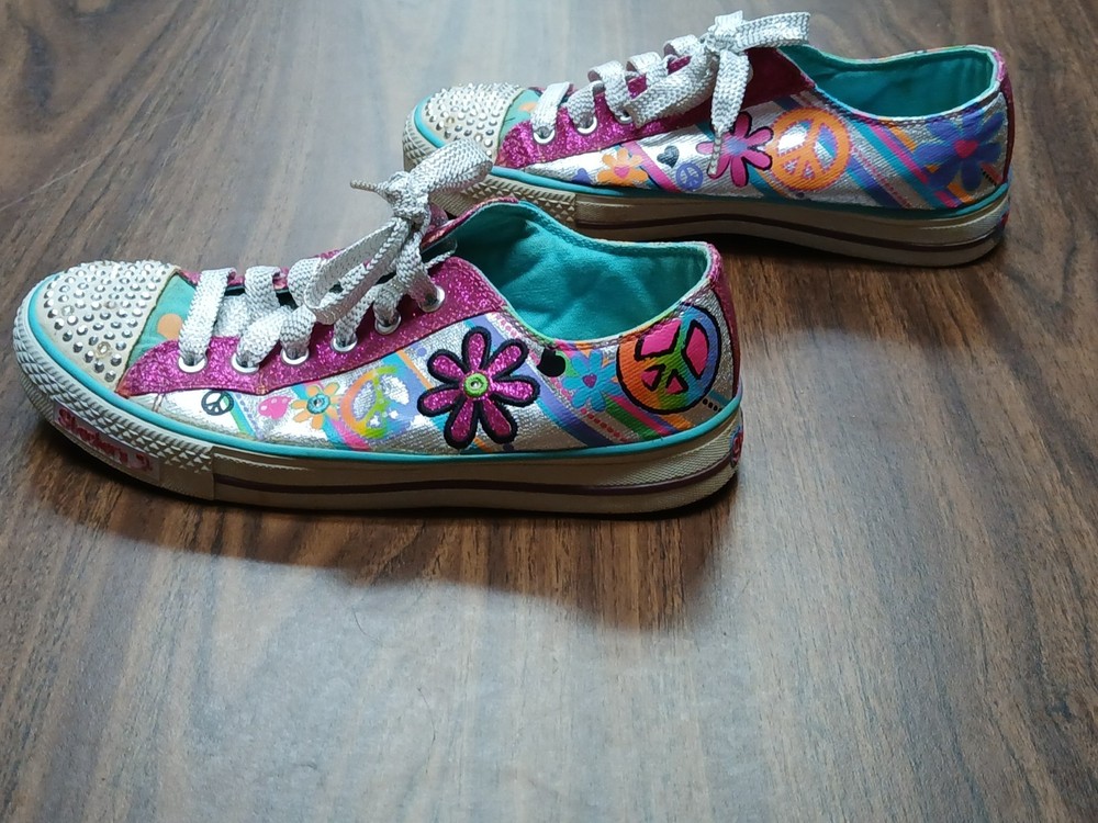 Skechers Twinkle Toes Girls Sneakers Size 5 Colorful Peace Flower Rhinestone Shoes Pre-owned Skechers Twinkle Toes girls sneakers in size 5. Features a colorful peace sign and flower design with glitter accents and rhinestone toe caps. Shoes show normal wear, including dirt and wear on the soles, but uppers remain vibrant and rhinestones are intact. No major flaws noted. Still lights up. Please review all photos for condition and details before purchasing. Zz8