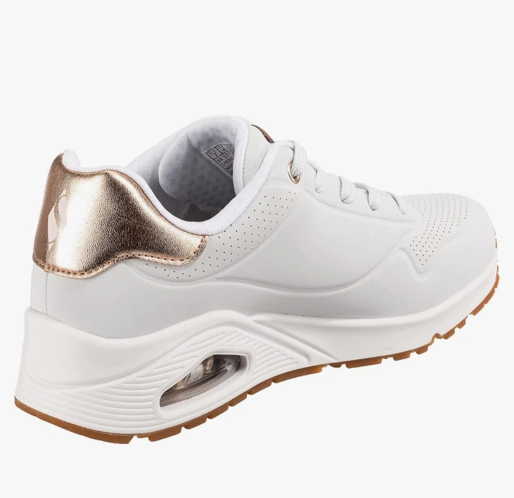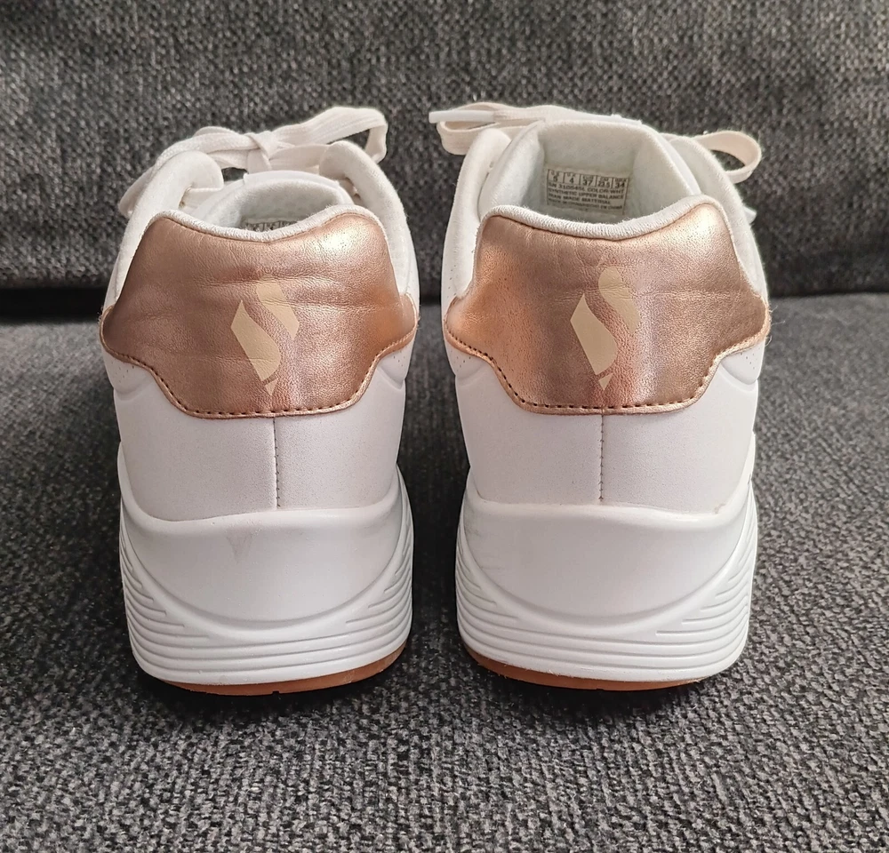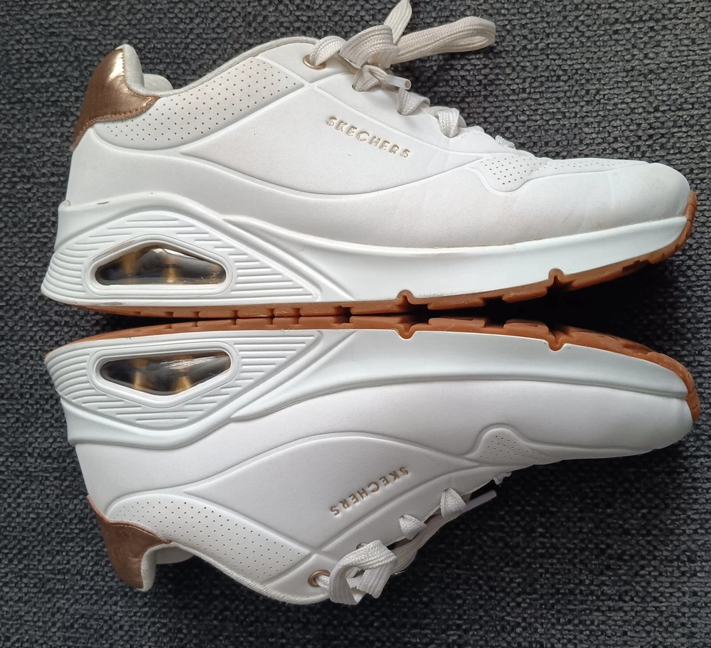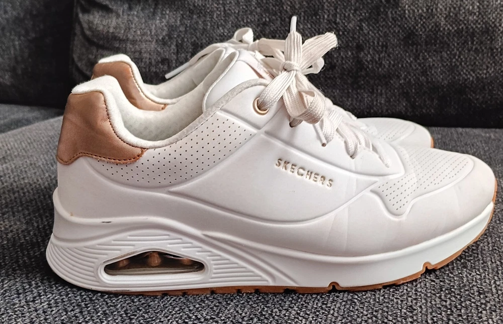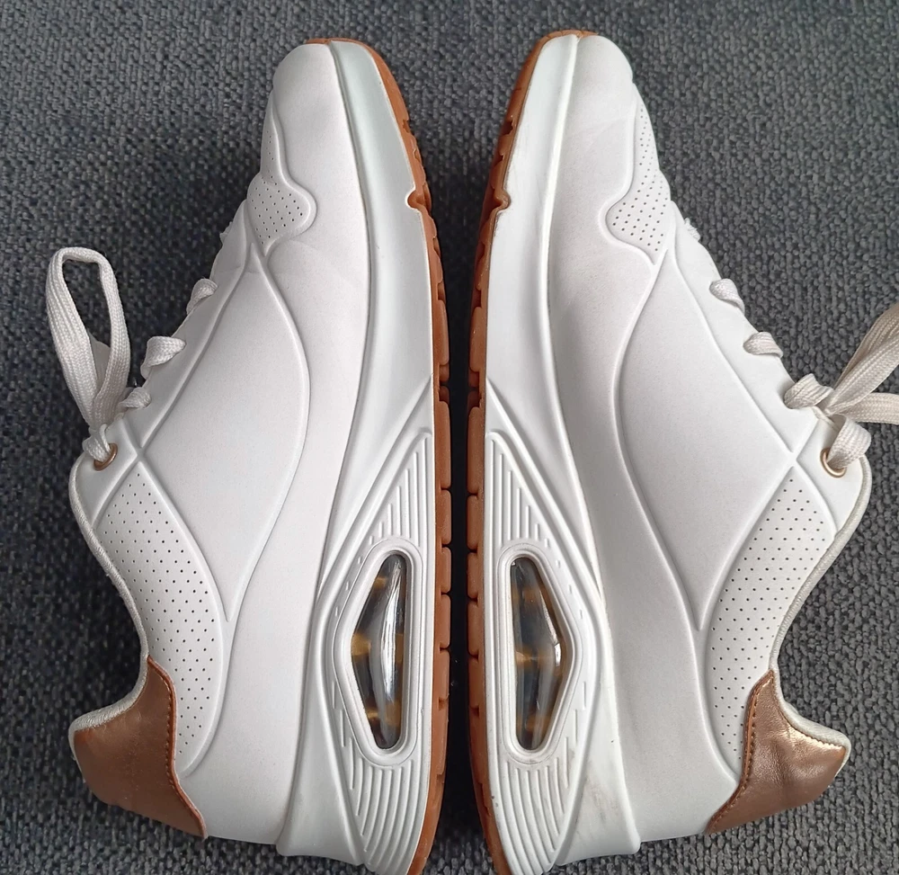 Choose gold and spice up your style with Skechers Street Uno Golden Air now. This fashionable lace-up shoe features a smooth Durabuck upper with gold accents, a padded Skechers AirCooled Memory Foam; comfort sole and a visible, air-cushioned SkechAir midsole. This very comfortable Shoes are in good and very clean condition.