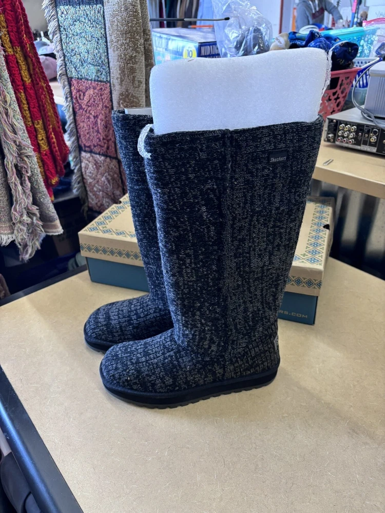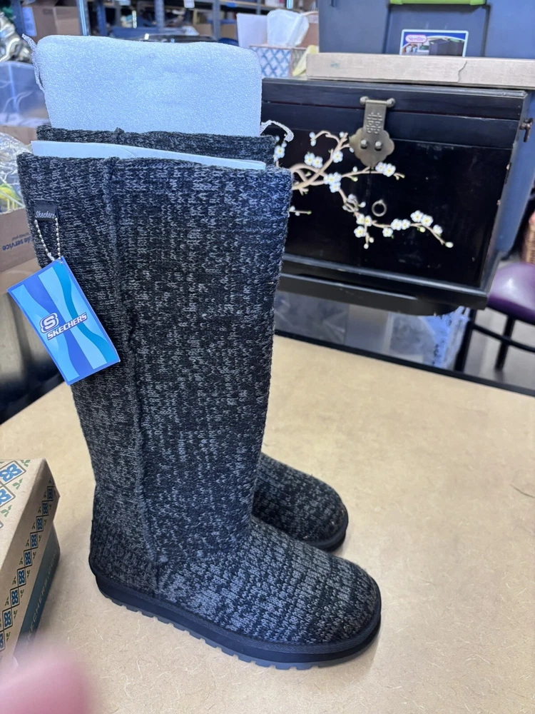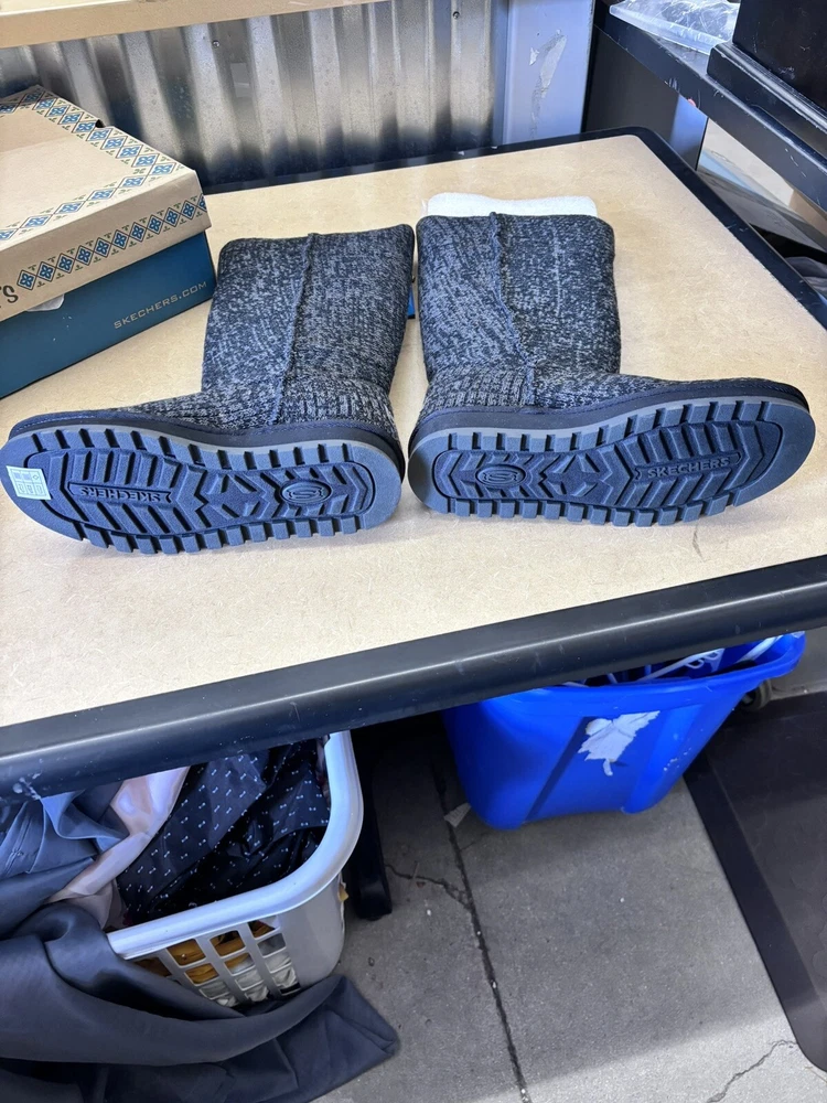 Step into comfort and style with these Skechers Winter Boots. The black mid-calf snow boots feature a cozy faux fur lining and insole, perfect for keeping your feet warm during the colder months. The knit fabric upper provides a comfortable fit, while the rubber outsole ensures durability and traction on slippery surfaces. These boots are perfect for casual occasions and can be easily pulled on for convenience. The round toe and flat heel style offer a classic and modern look, making these boots a versatile addition to any winter wardrobe. The Skechers logo and fur trim add a touch of elegance to these practical boots.