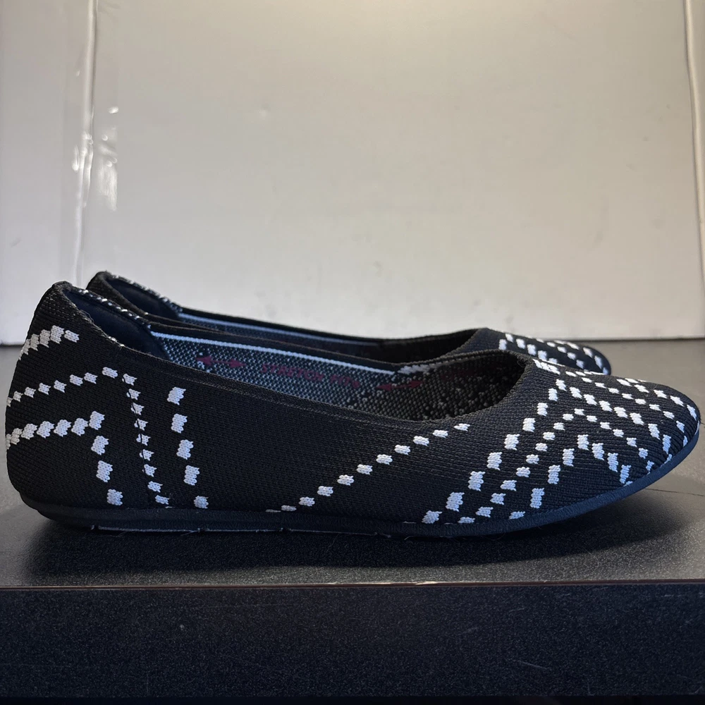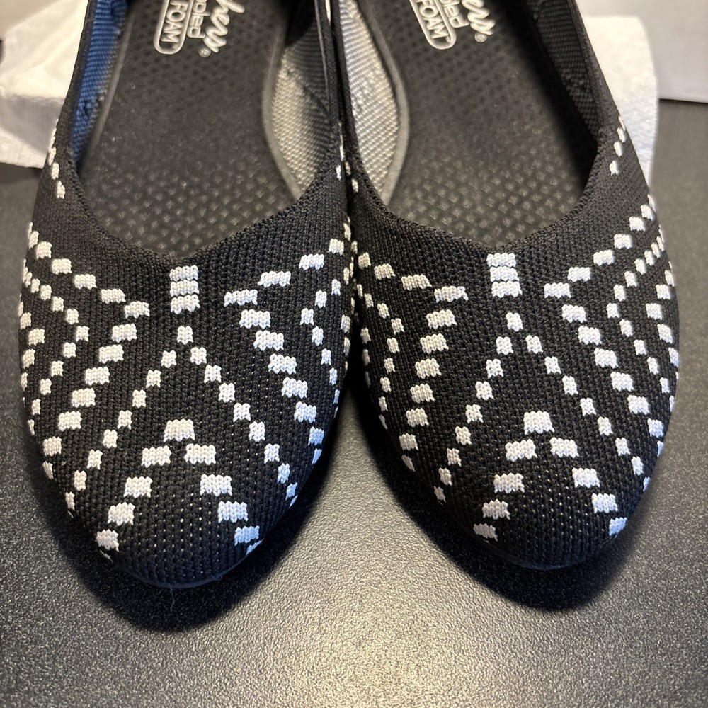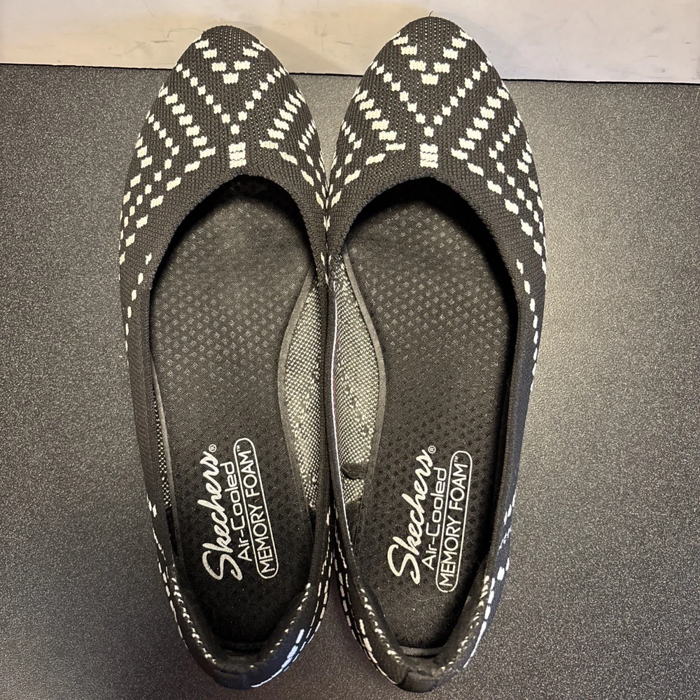 The Skechers Women's Black White Cleo 2.0 Be Amazed Air Cooled Foam in size 9 is a stylish ballet flat with a geometric pattern and almond toe shape. This slip-on shoe features a lightweight and cushioned design, perfect for travel, casual outings, or business meetings. The breathable knit fabric lining and memory foam insole provide comfort and support, while the rubber outsole ensures durability. With its black color and standard shoe width, this Skechers flat is a versatile and practical choice for the summer, fall, and spring seasons.