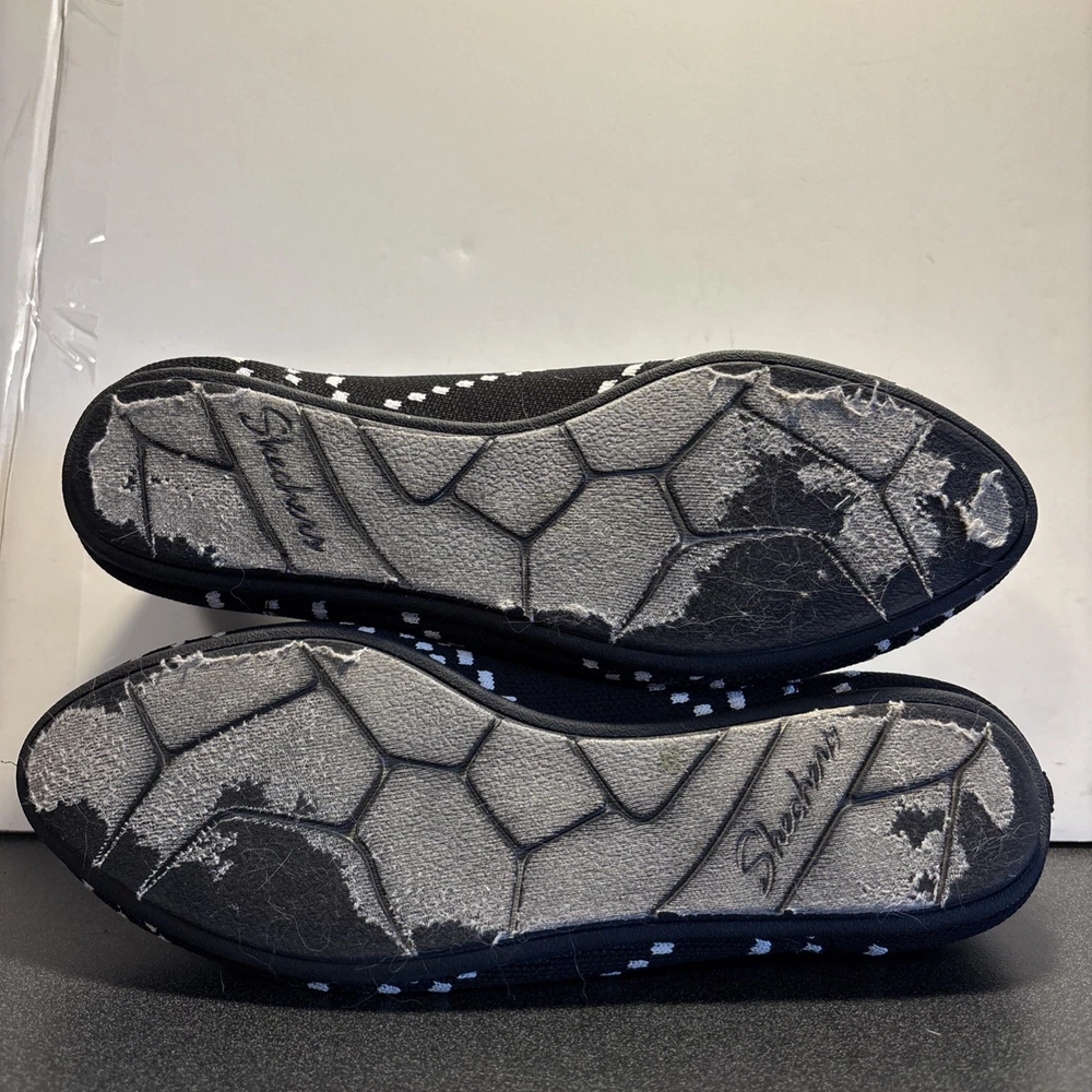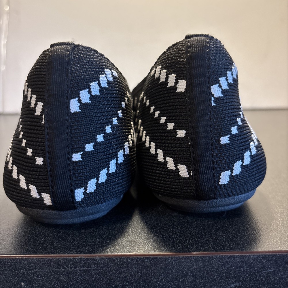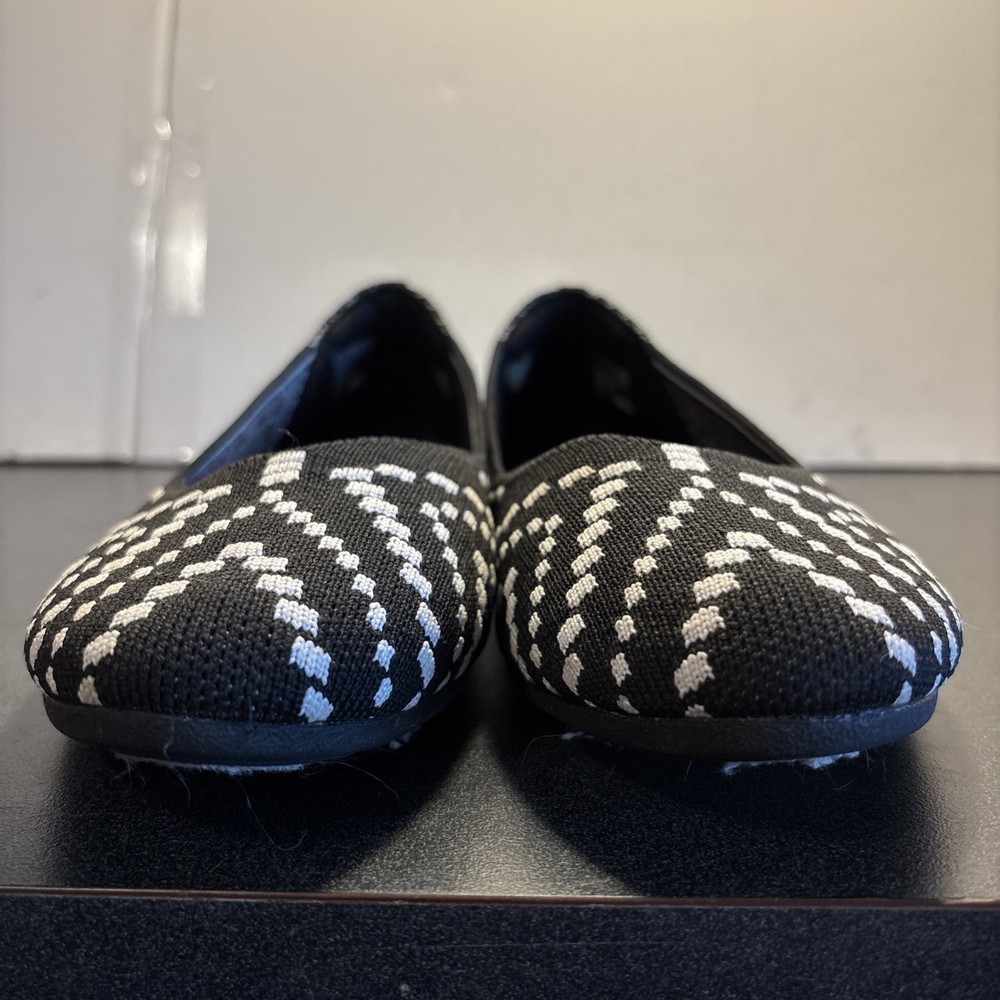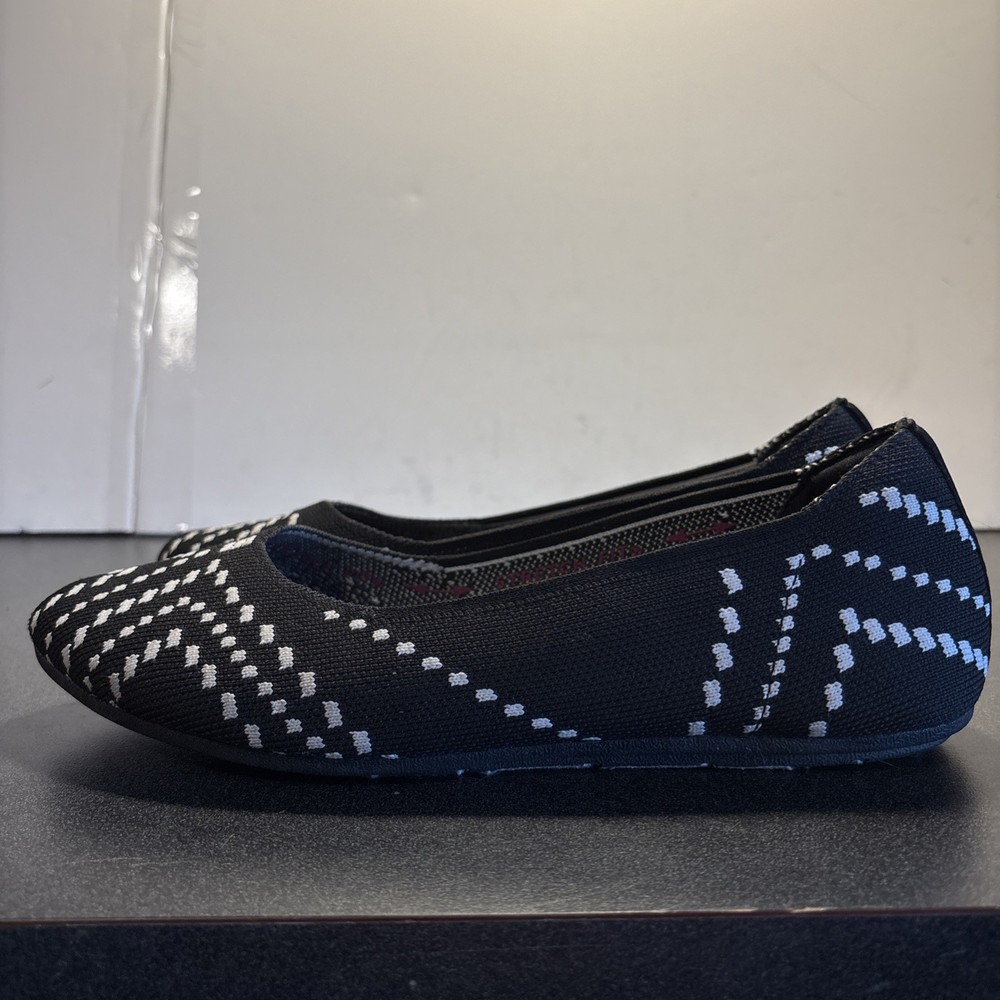 The Skechers Women's Black White Cleo 2.0 Be Amazed Air Cooled Foam in size 9 is a stylish ballet flat with a geometric pattern and almond toe shape. This slip-on shoe features a lightweight and cushioned design, perfect for travel, casual outings, or business meetings. The breathable knit fabric lining and memory foam insole provide comfort and support, while the rubber outsole ensures durability. With its black color and standard shoe width, this Skechers flat is a versatile and practical choice for the summer, fall, and spring seasons.